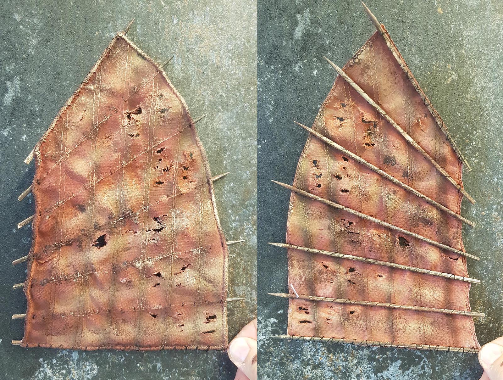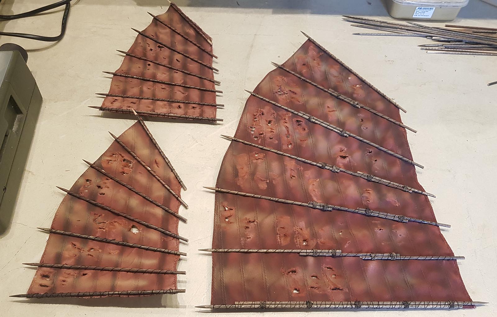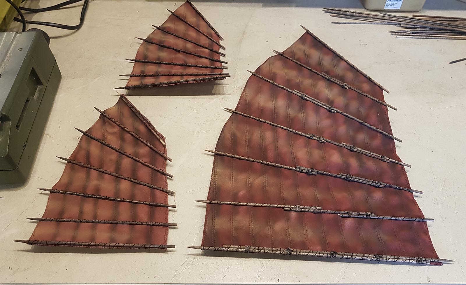 Погнали делать паруса. Ткань синтетическая, слабо ползучая, но немного тянется. Это создает клевый эффект гофрирования полотнищ после прошивки. Тряпки открасил в базу