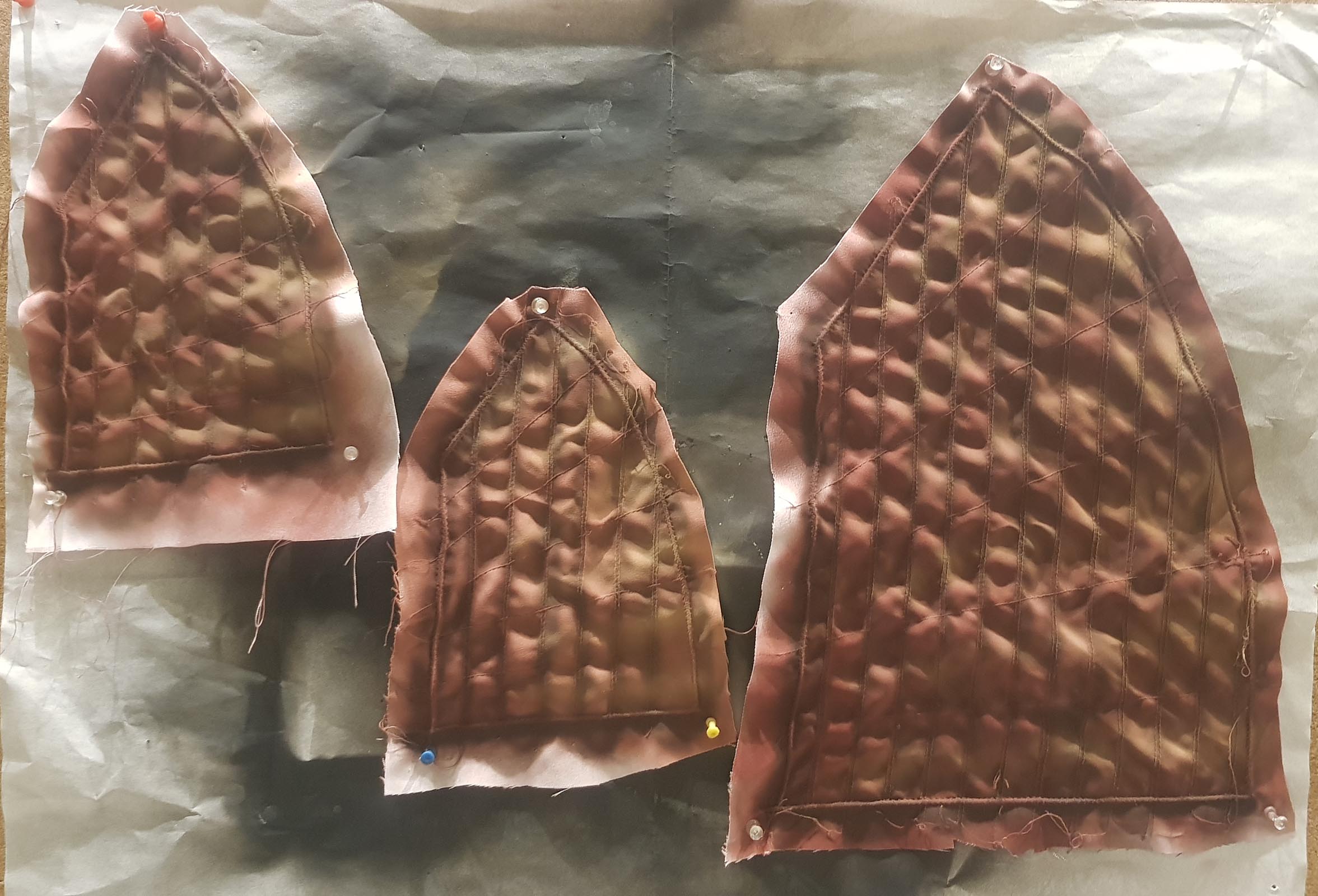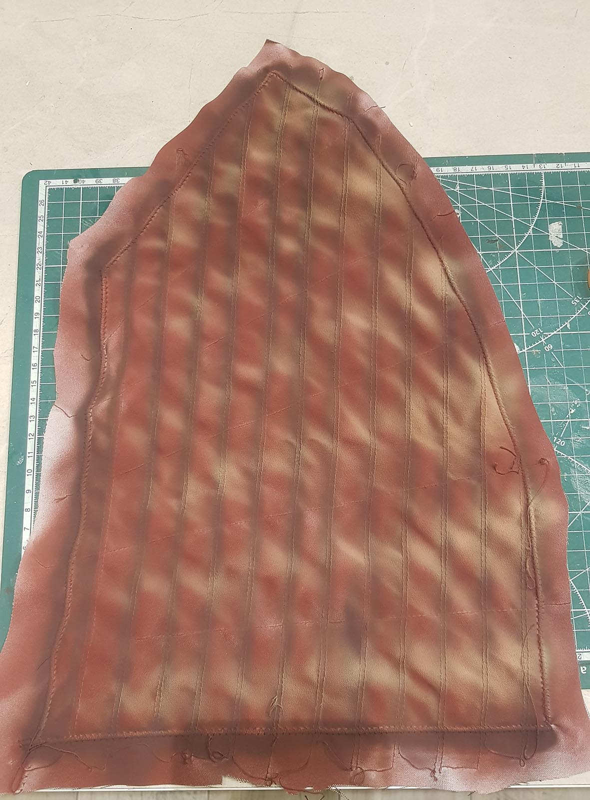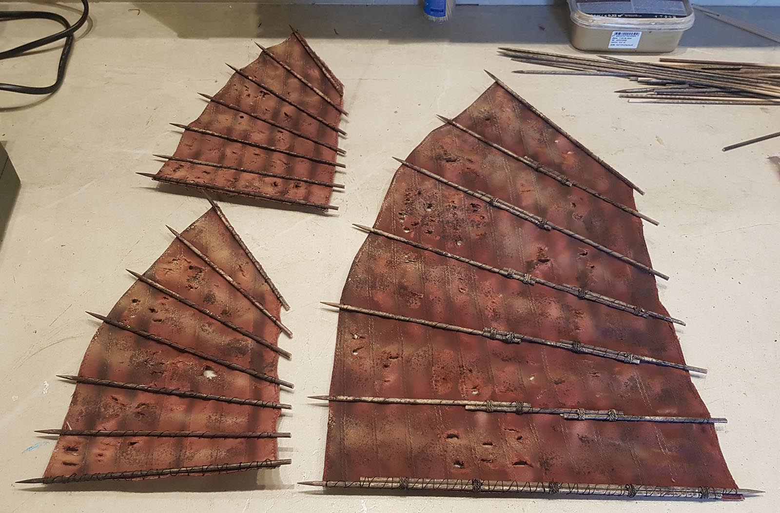 Погнали делать паруса. Ткань синтетическая, слабо ползучая, но немного тянется. Это создает клевый эффект гофрирования полотнищ после прошивки. Тряпки открасил в базу
