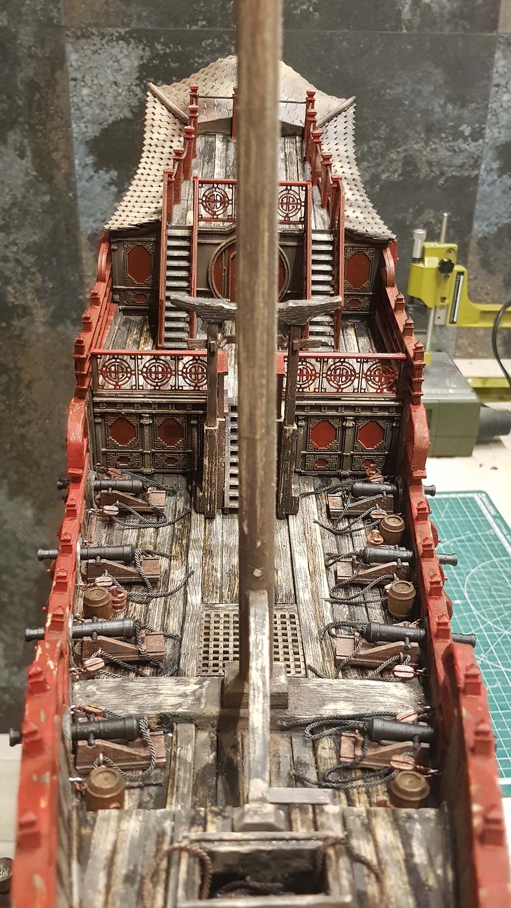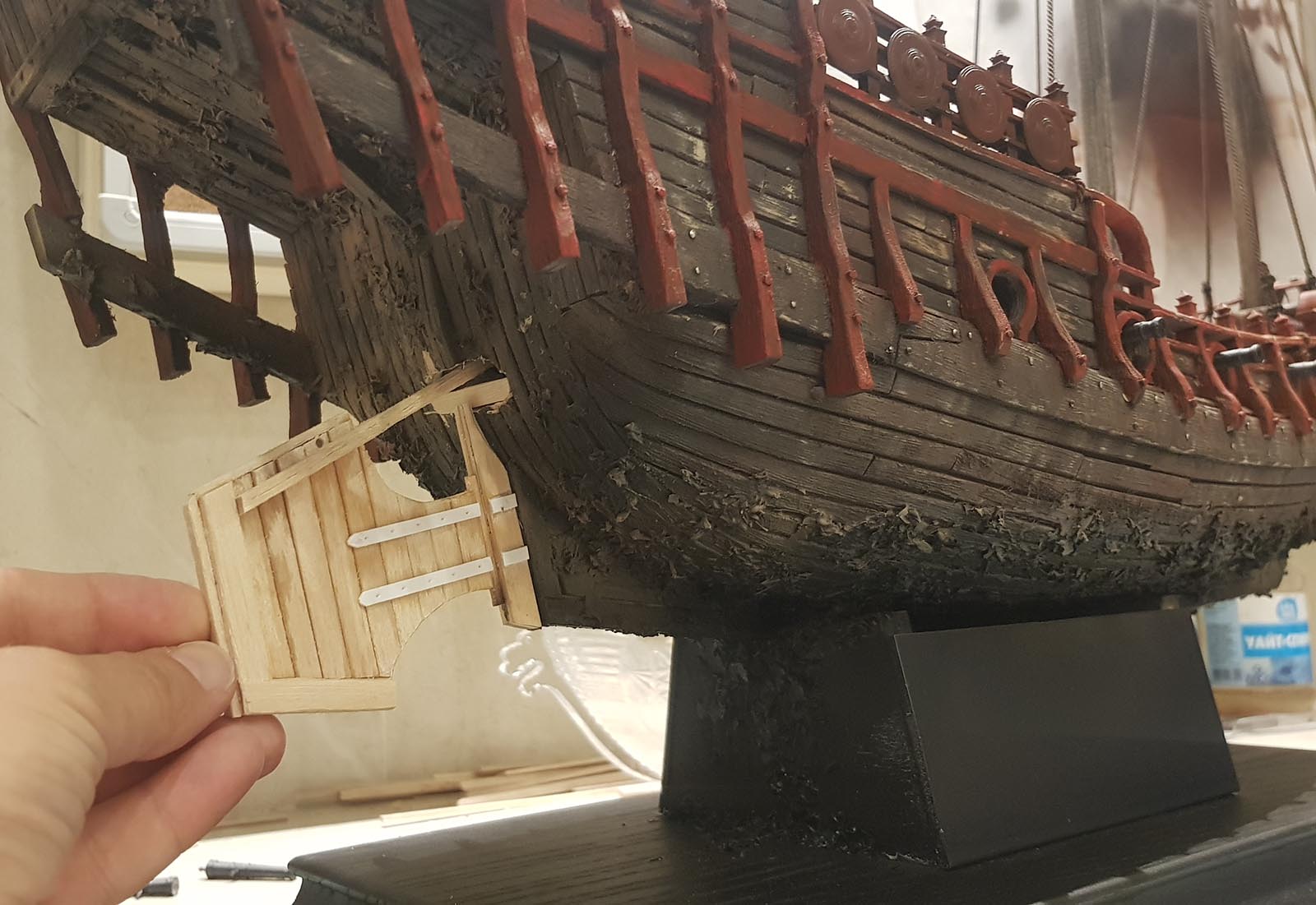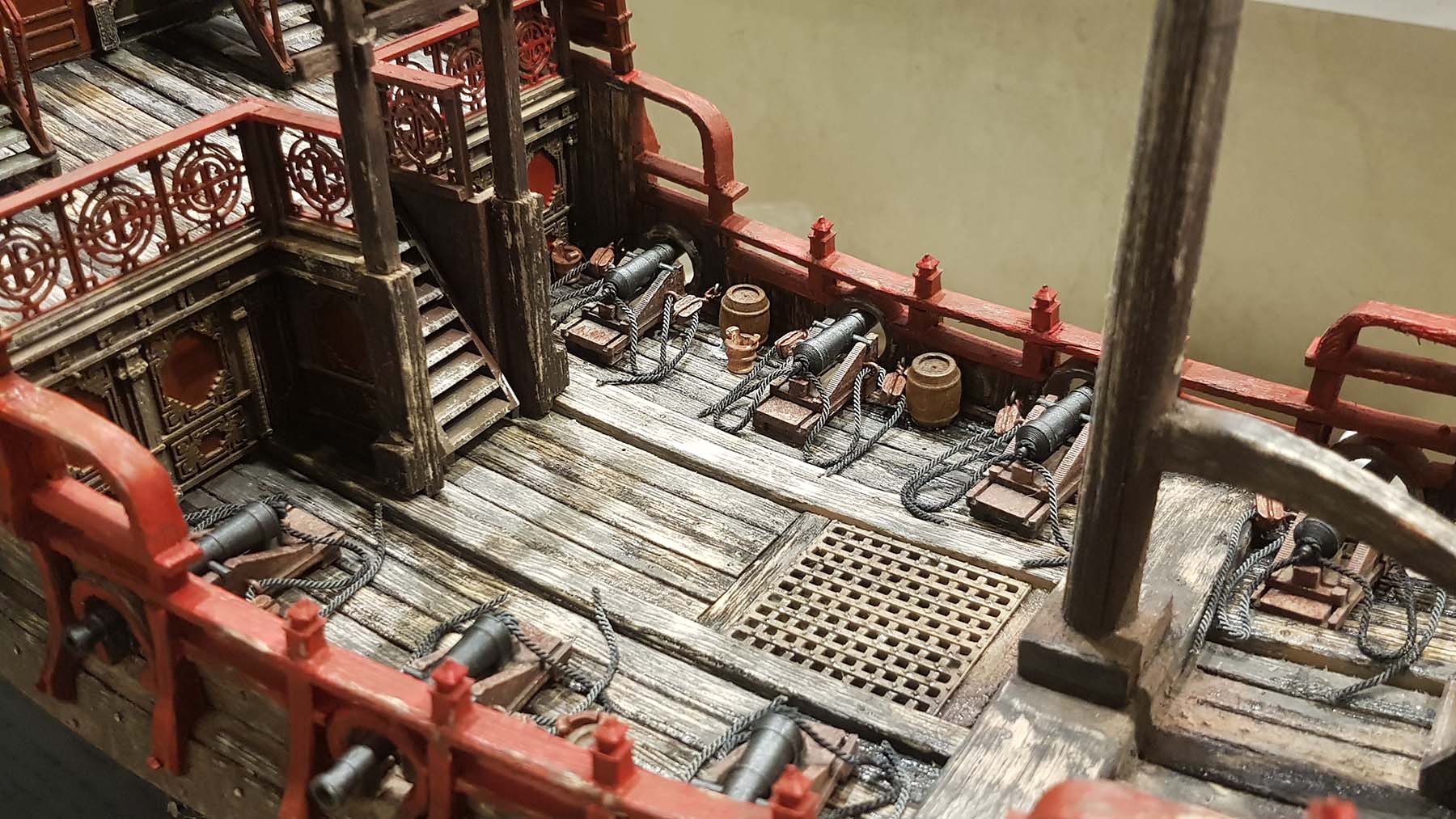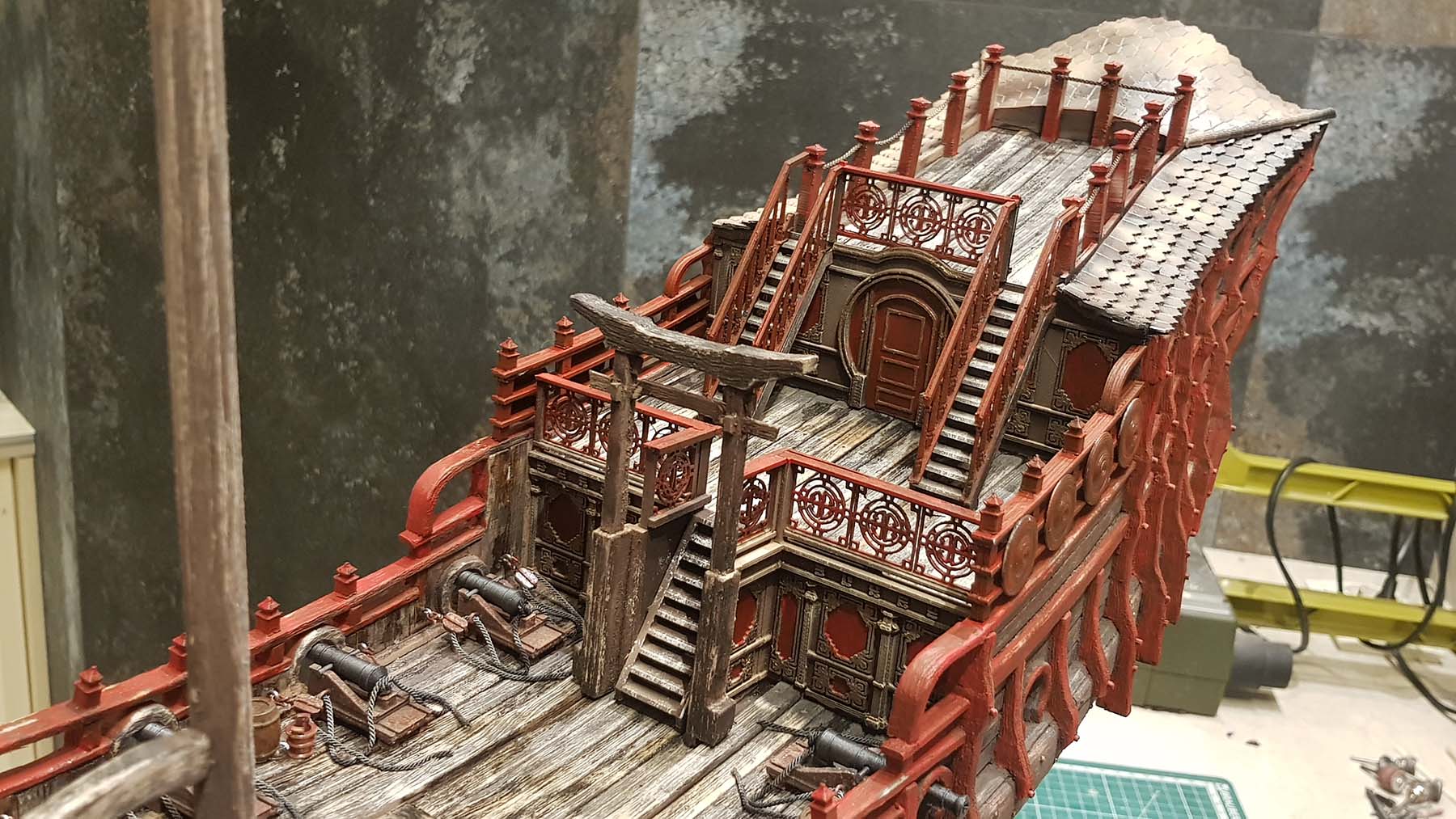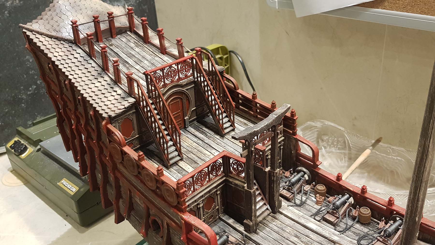 Сделал ограждения лестниц, открасил кровлю  кормы, поставил пушки
