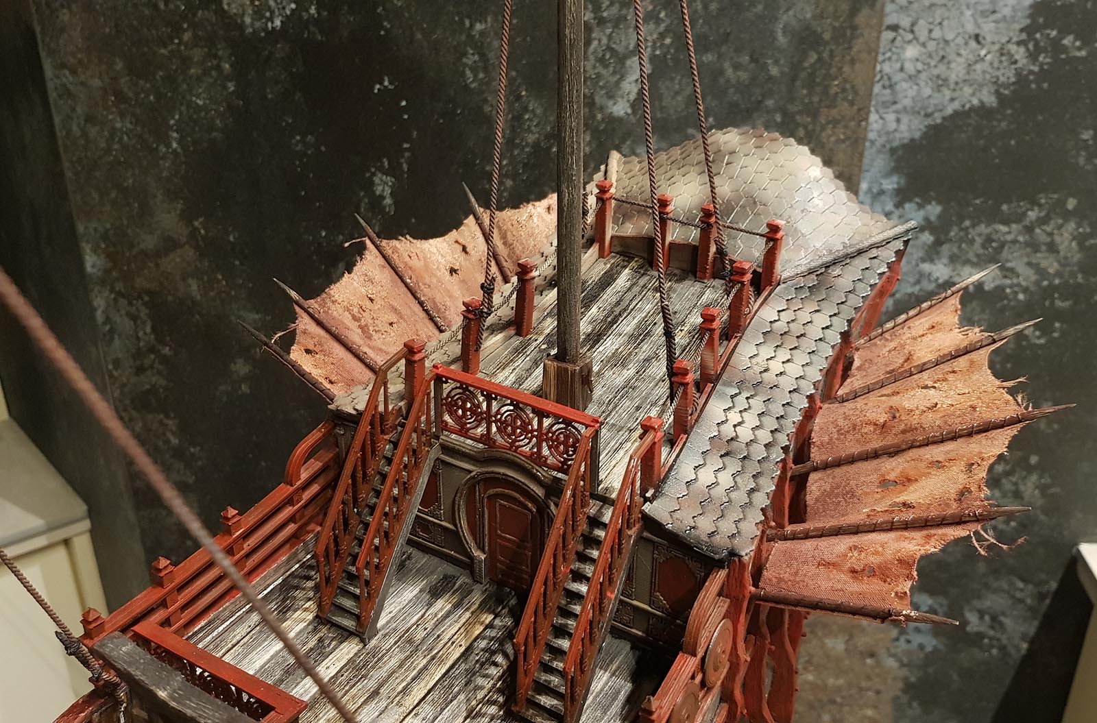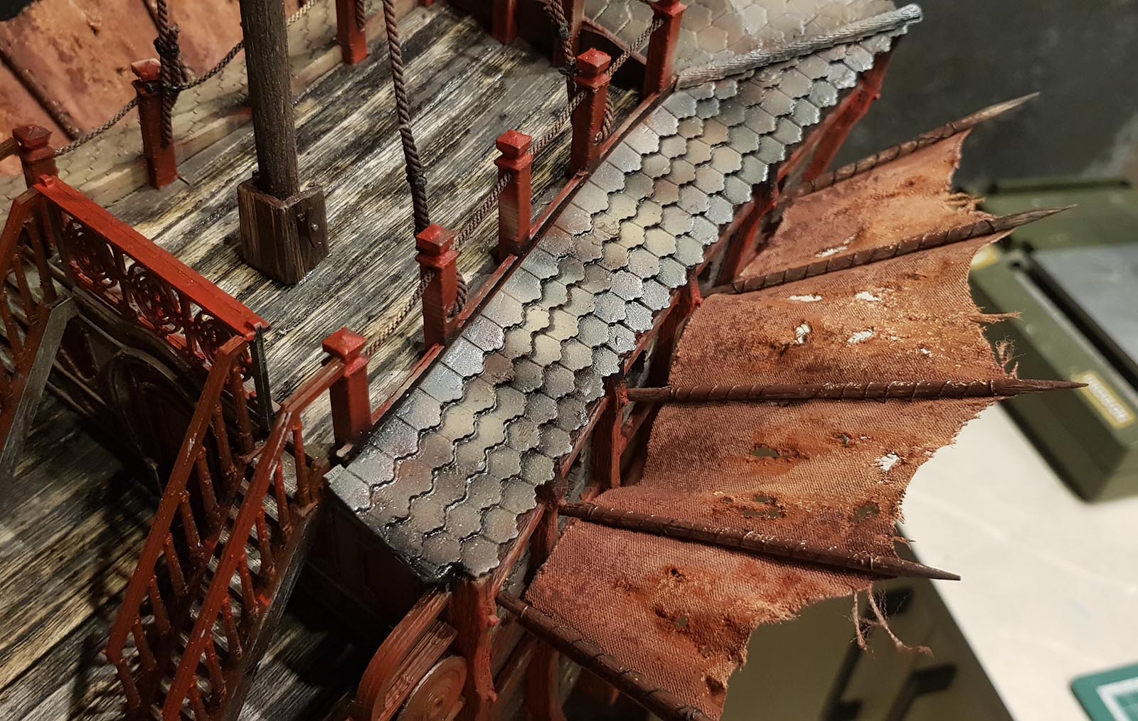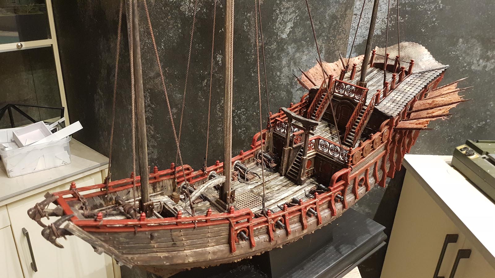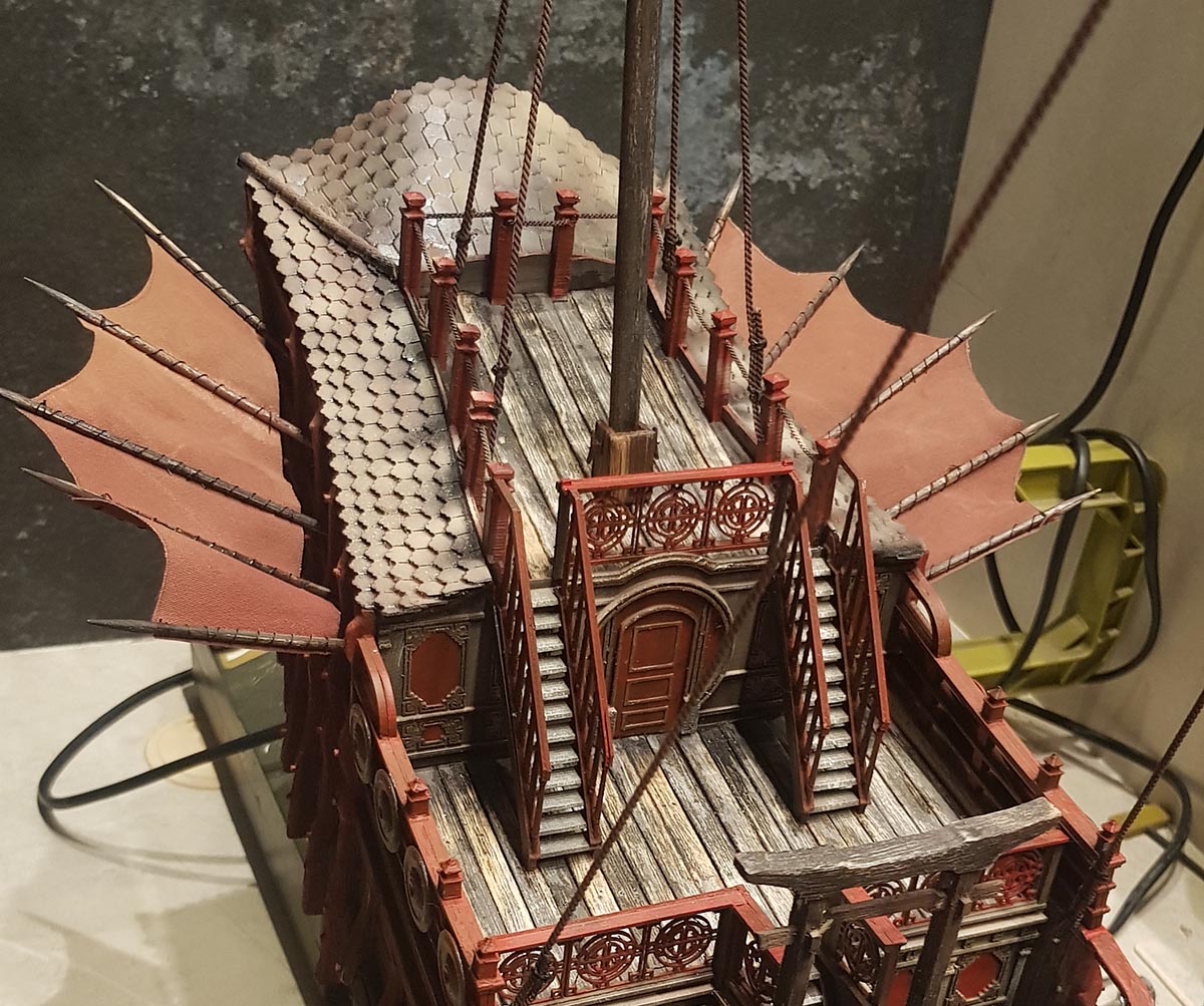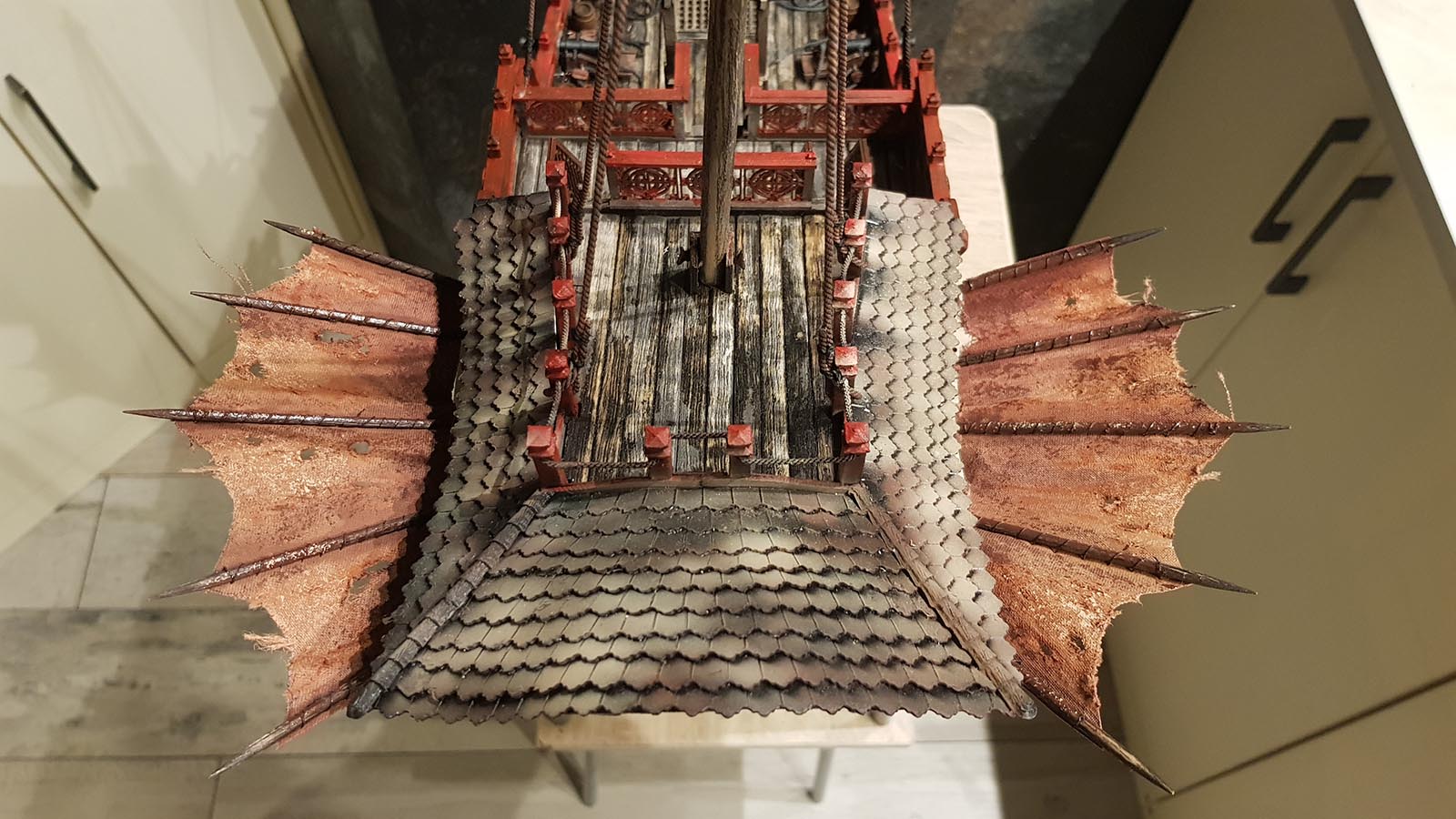 Сделал ограждения лестниц, открасил кровлю  кормы, поставил пушки