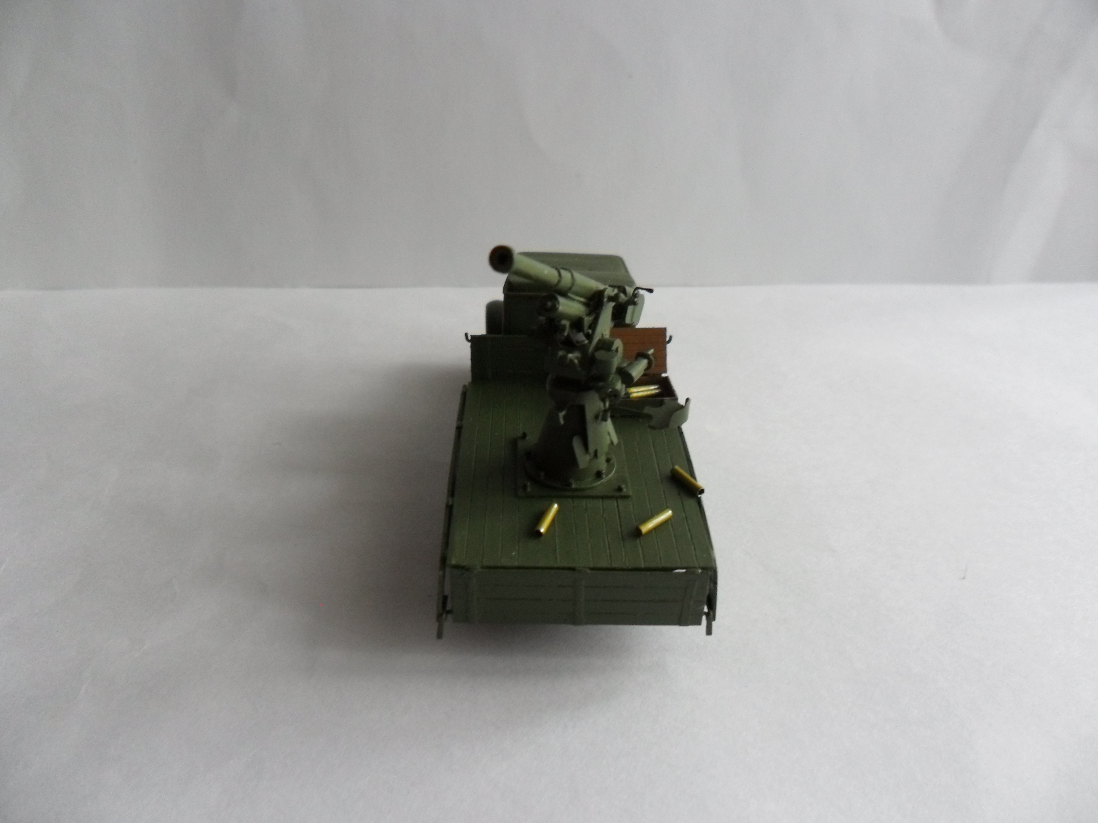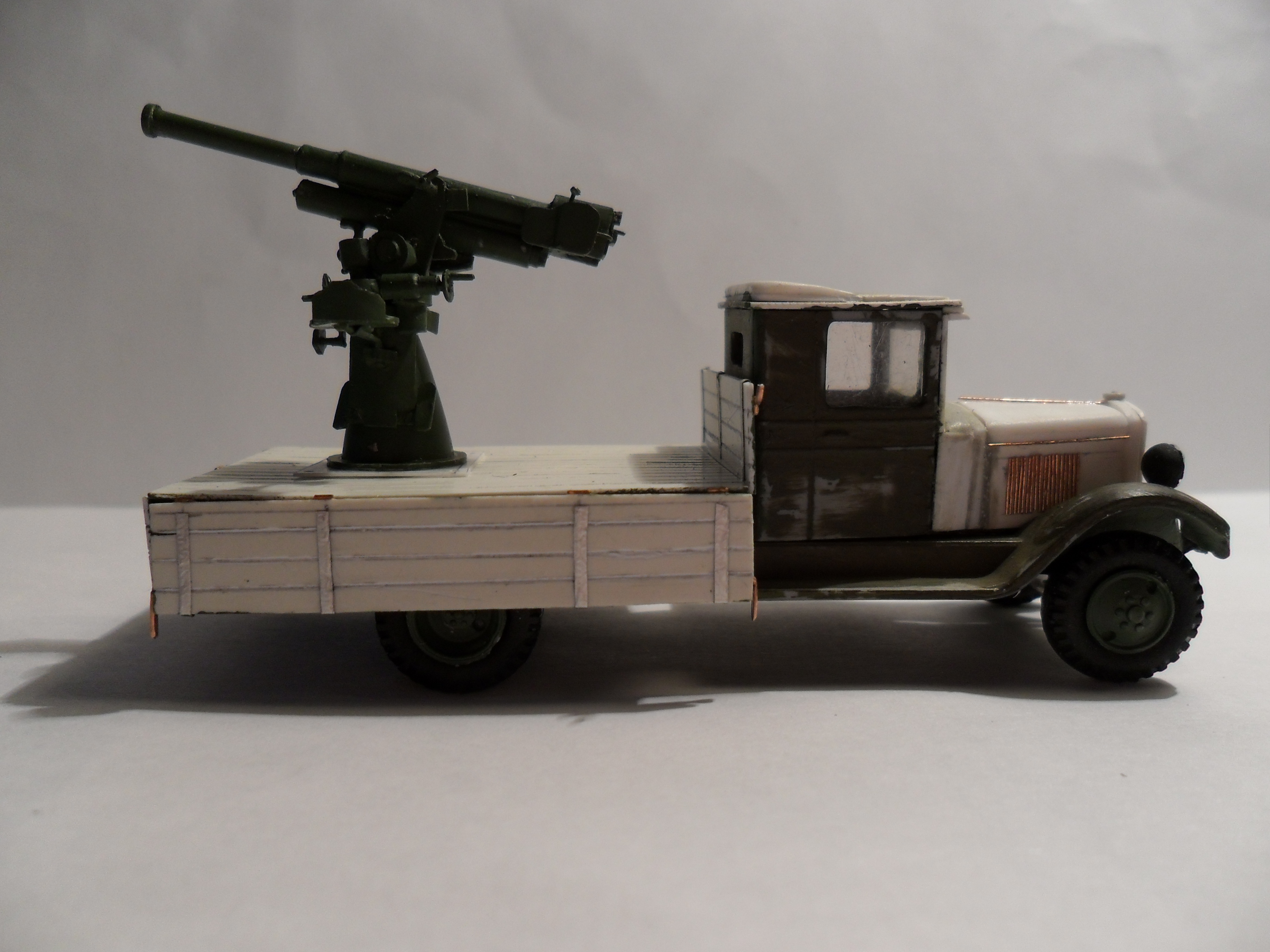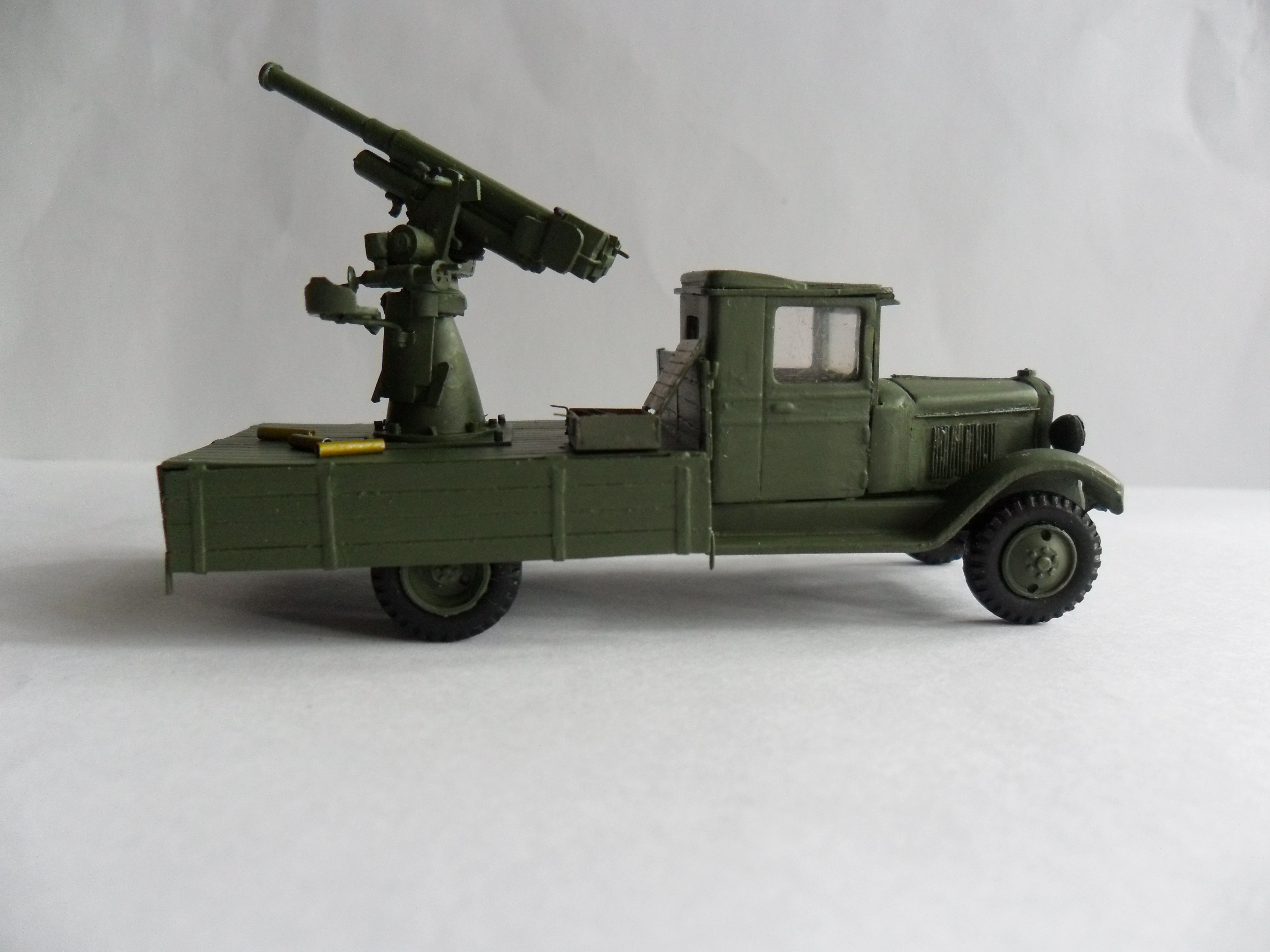 Есть еще боковики цветные, но это, скорее, по мотивам. Я делал такую зенитку в 1/72, поскольку оставались запчасти от ЗиСа. Рама, моторная часть кабины, крыша, кузов, сама зенитка изготовлены с нуля