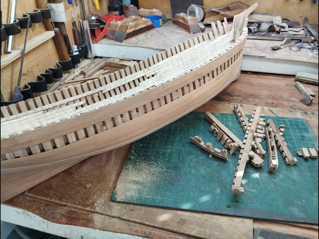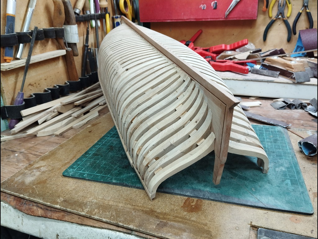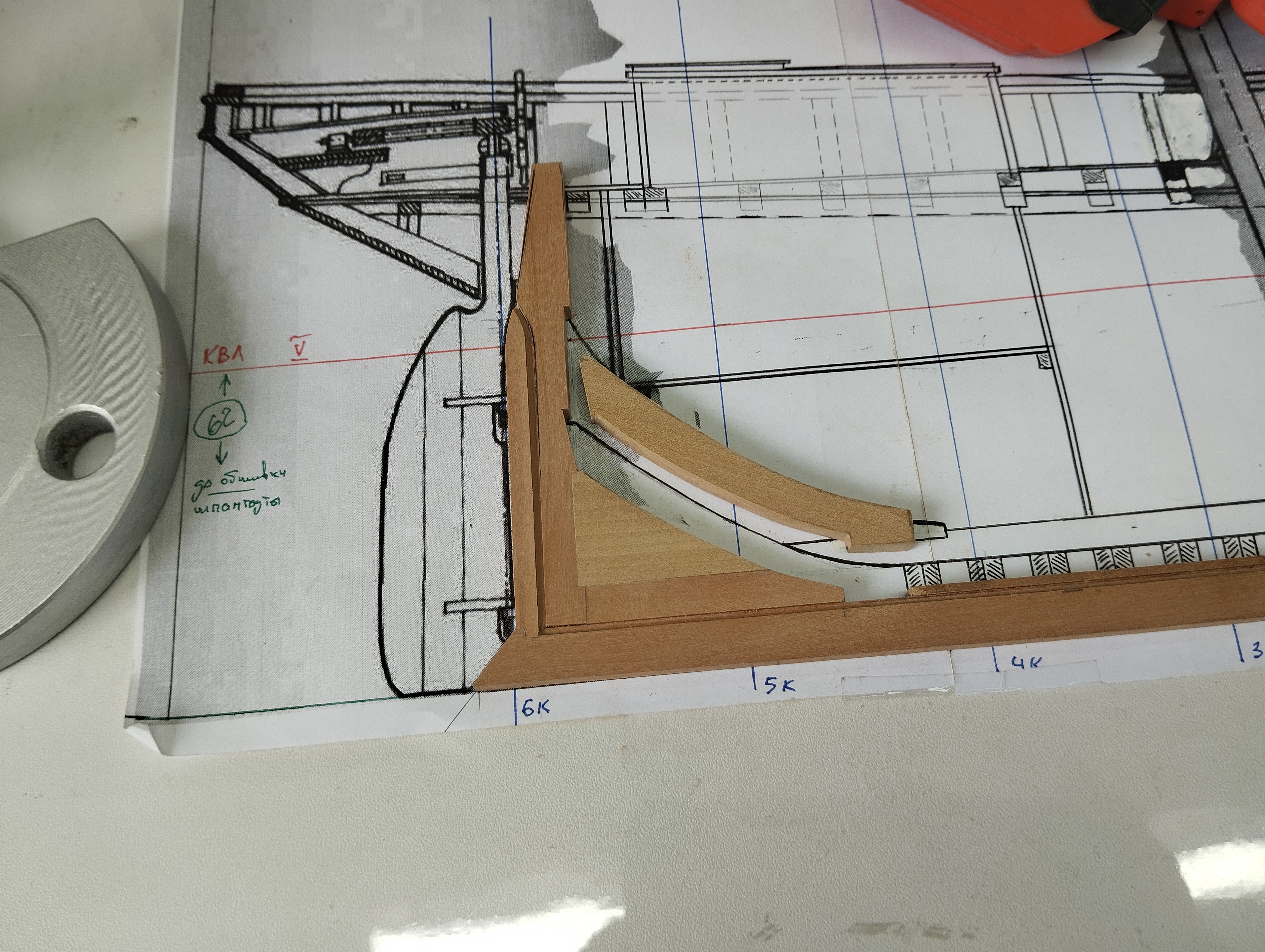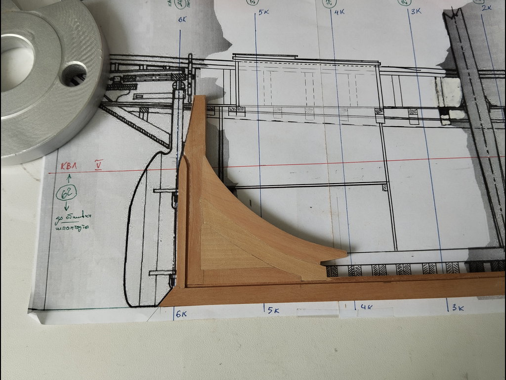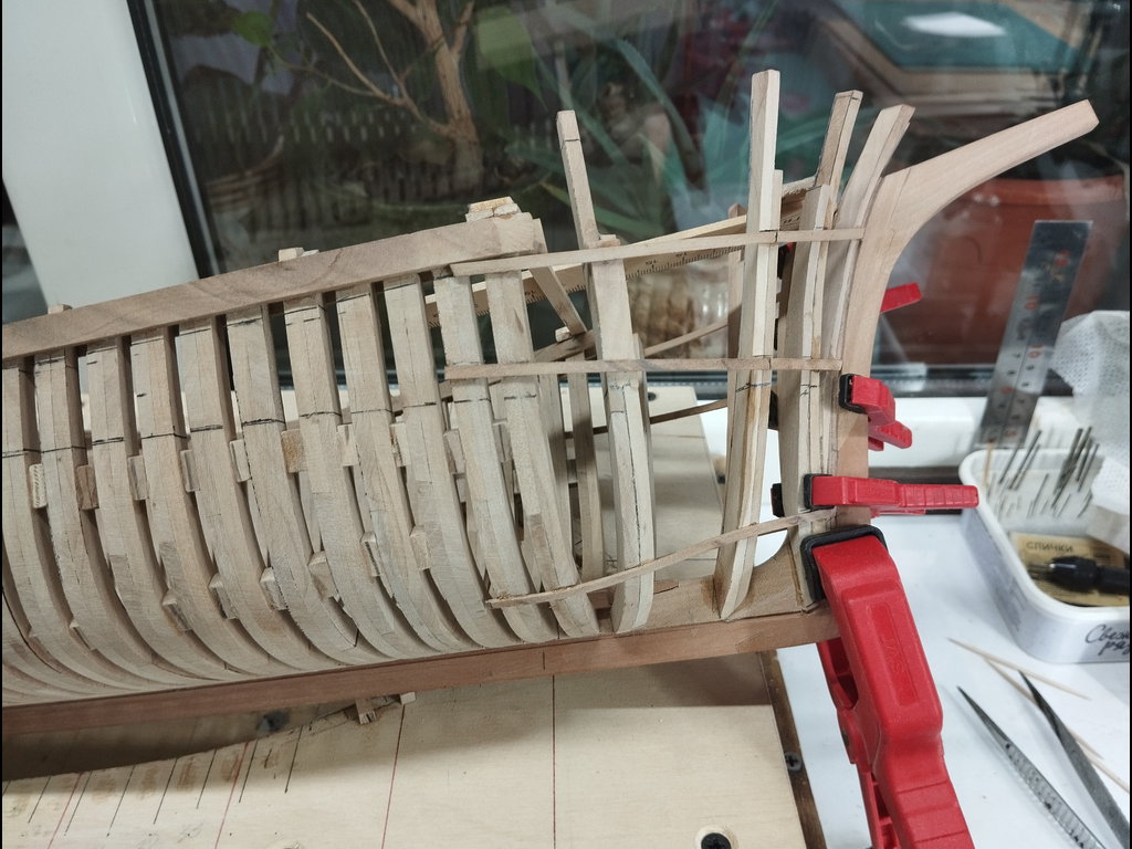 Продолжаю....Была спилена верхняя временная часть шпангоутов с обвязкой... Далее внутреннии работы. Изготовил и поставил на место клямсы. Начал делать бимсы. В кормовой части формирую и делаю трюмный кубрик.......