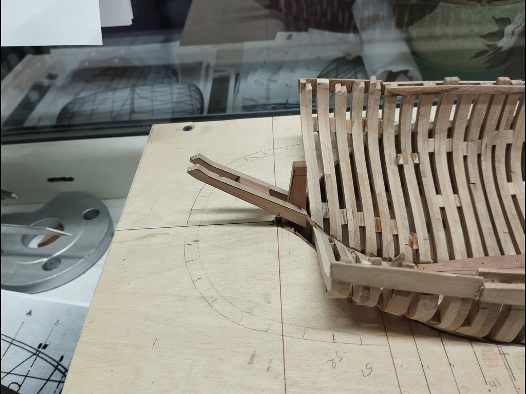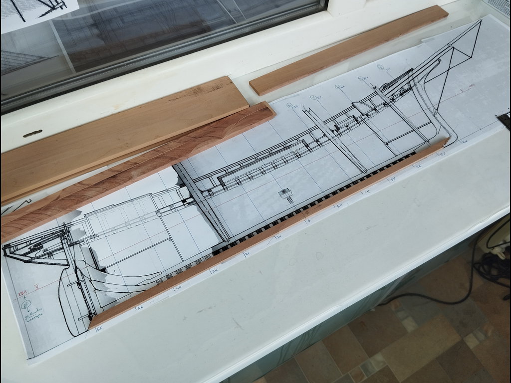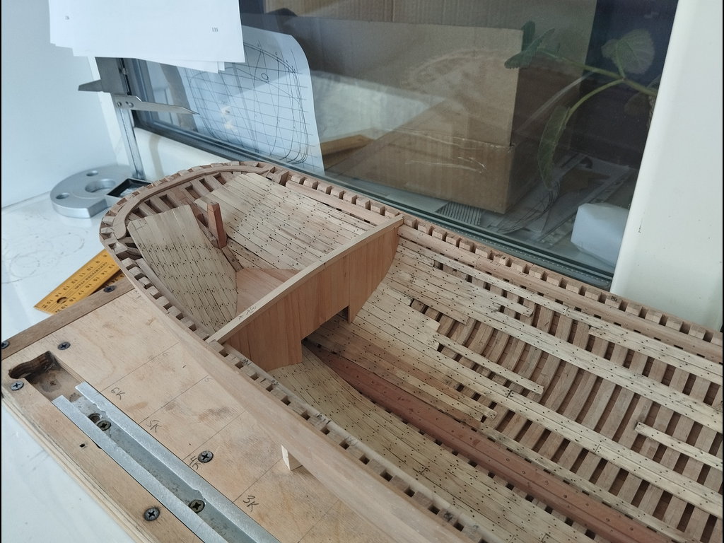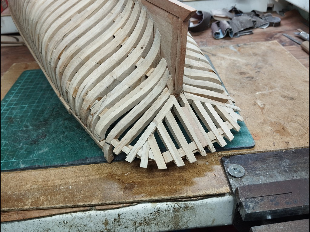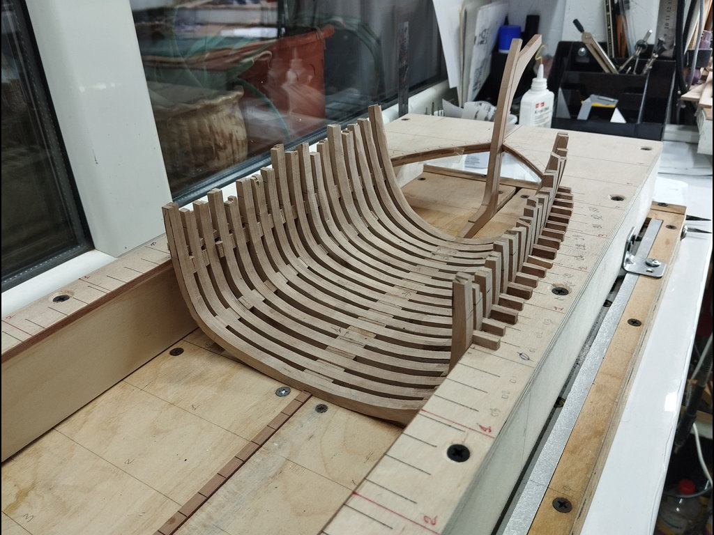 Продолжаю....Была спилена верхняя временная часть шпангоутов с обвязкой... Далее внутреннии работы. Изготовил и поставил на место клямсы. Начал делать бимсы. В кормовой части формирую и делаю трюмный кубрик.......