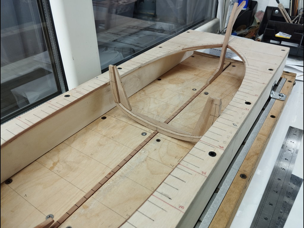 Подготовил стапель с доской по уровню ватерлинии для удобства установки шпангоутов....