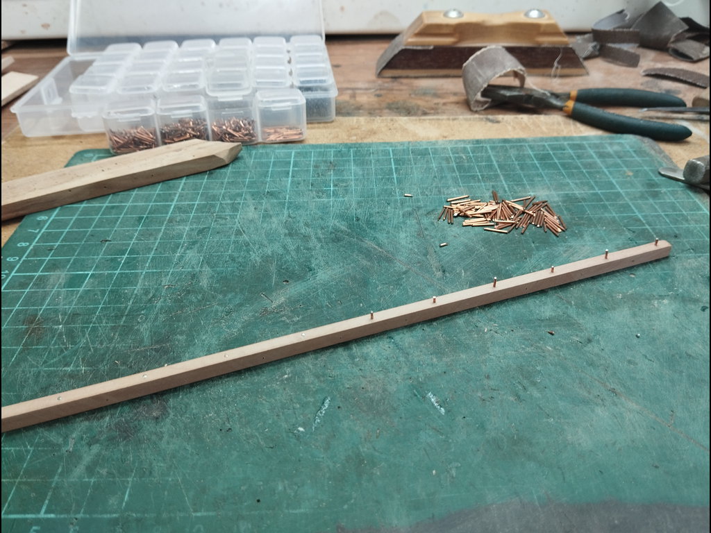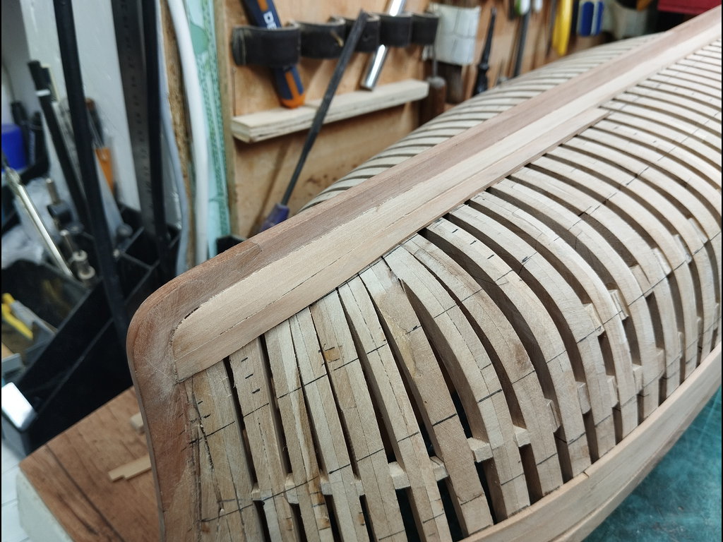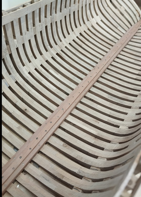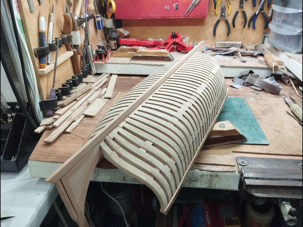 Всем привет ! Давненько я тут не отмечался. Стройка идет свои чередом. Силовой каркас готов. Далее обшивка. Она тут интересная -идет поясами двух толщин..... Наружнюю и внутреннюю обшивку буду делать параллельно, для удобства работы струбцинами....Для этого было сделано 29 струбцин, которые сильно выручили и ускорили процесс приклеки обшивки...... Гвоздевание также делал сразу по поясам. Снаружи - зубочистки березовые , внутри имитация.....