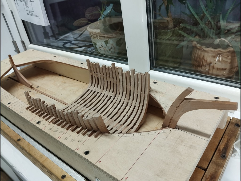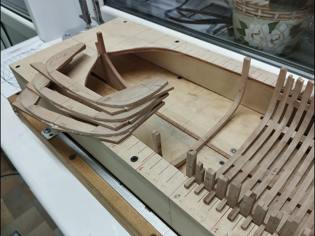 Тем временем продолжаю со шпангоутами. Следующий этап - поставил внутри на киль брусы усиления....