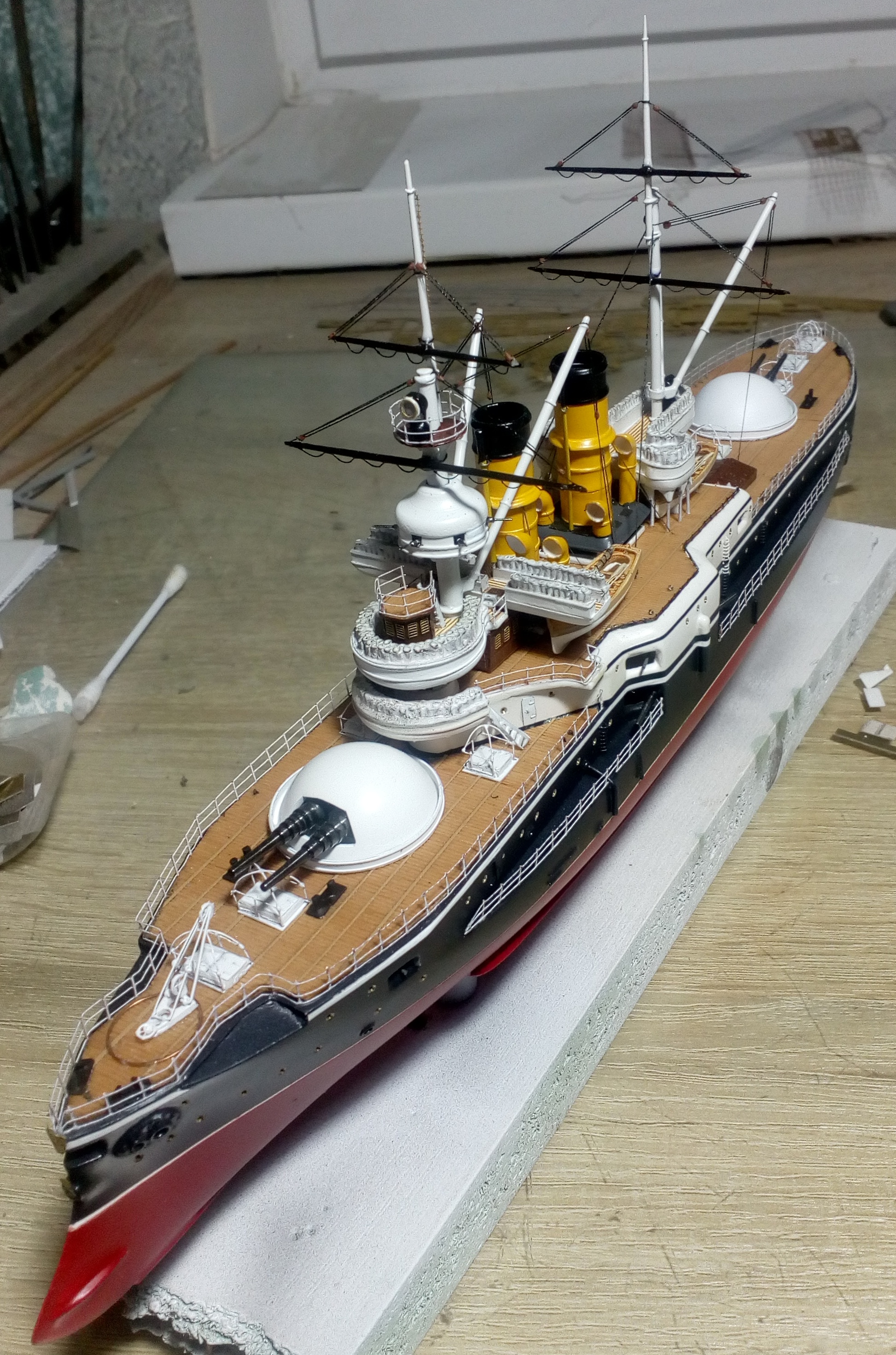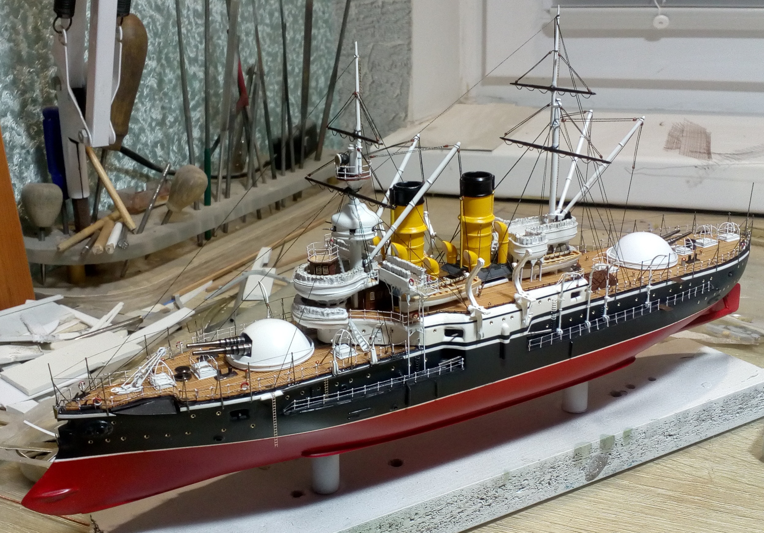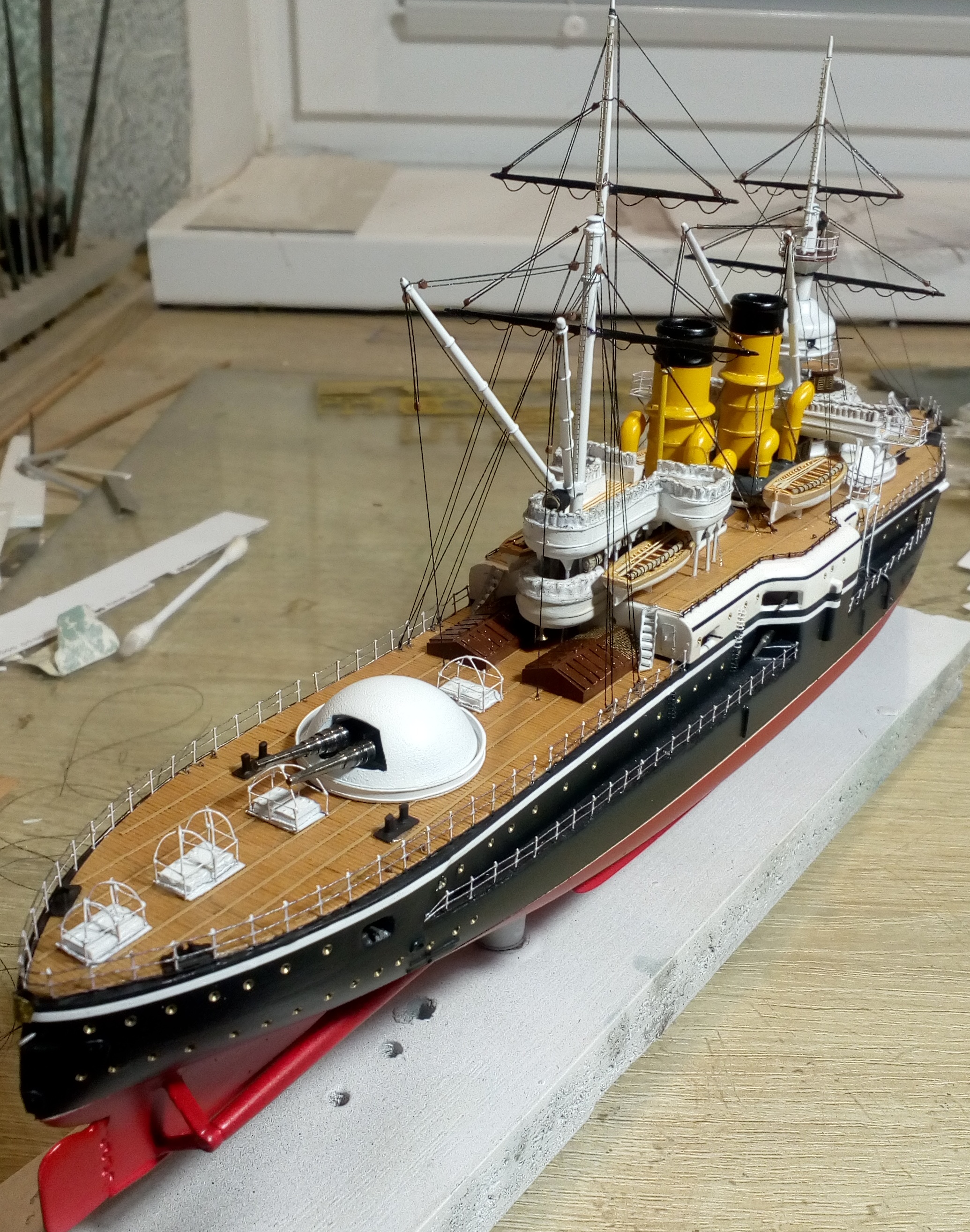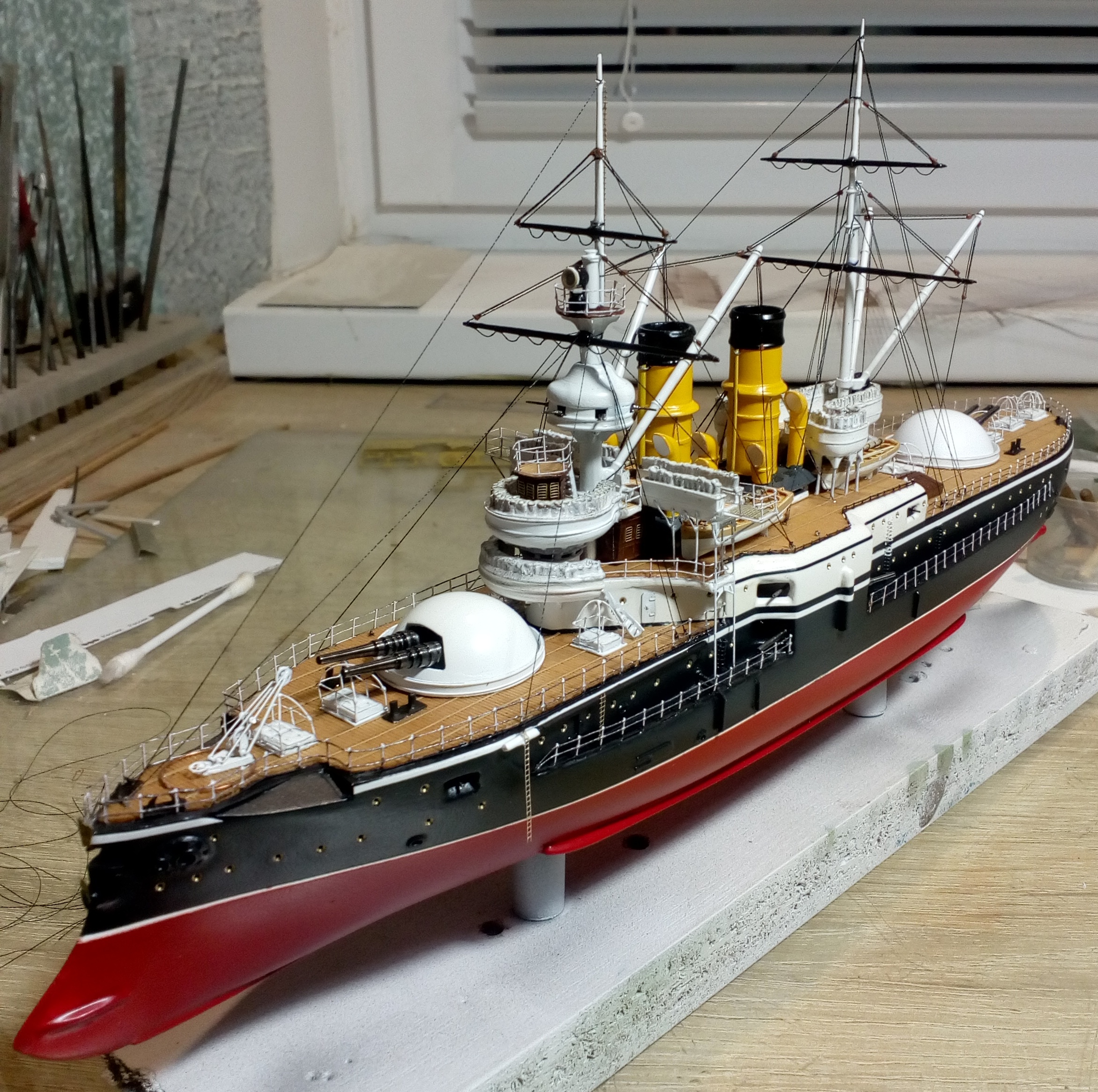 Были и черные стойки и белые и вообще без стоек. Но мне тоже больше с белыми нравиться. Сегодня 4 часа потратил на подкраску лееров, низ закрасил черным, а сами леера краской оружейная сталь. На фото она блестит, наверное не до конца подсохла, или от лампочки засветка. Переделывать точно уже не буду, задолбали меня эти леера. Ну и еще добавился стоячий такелаж.