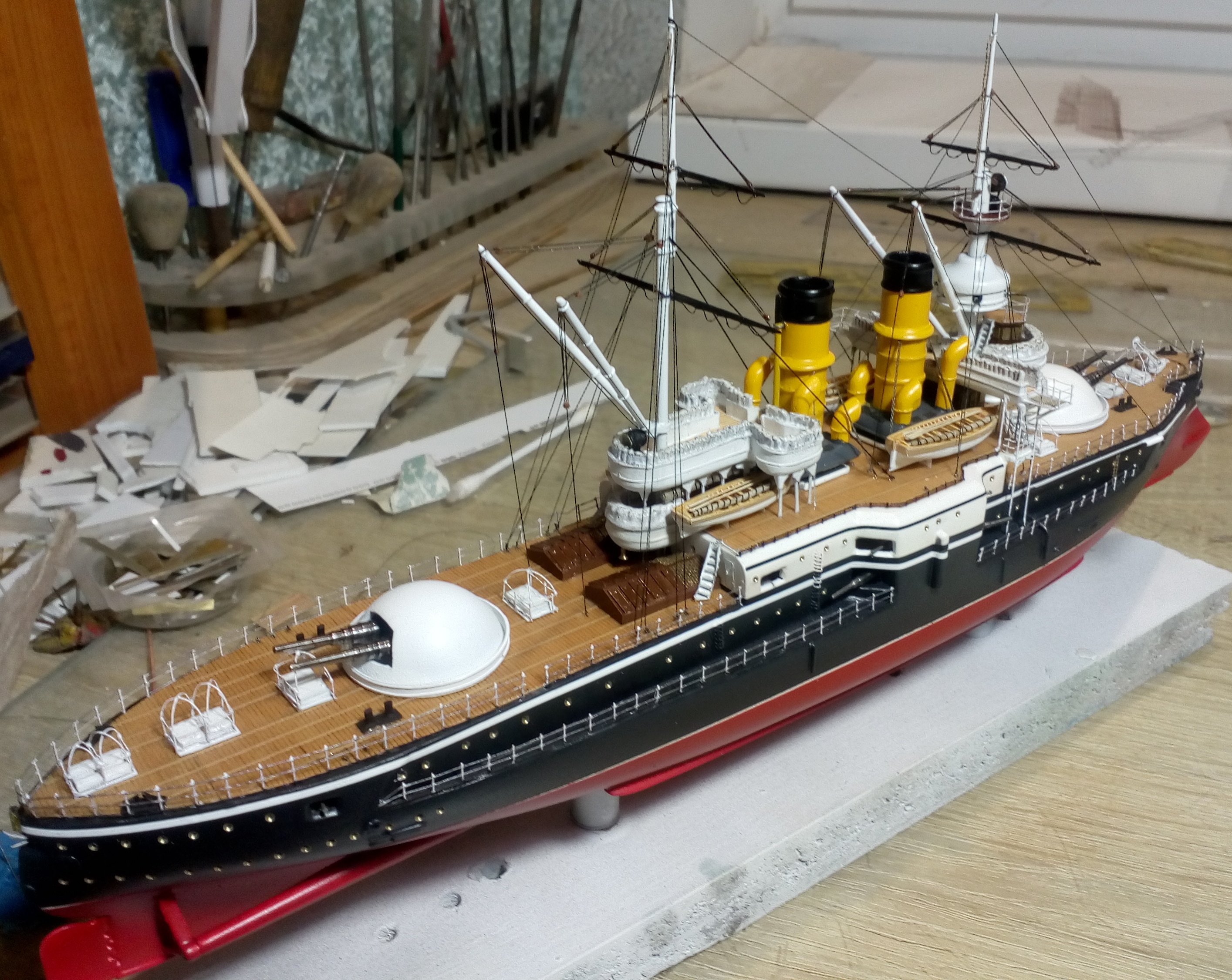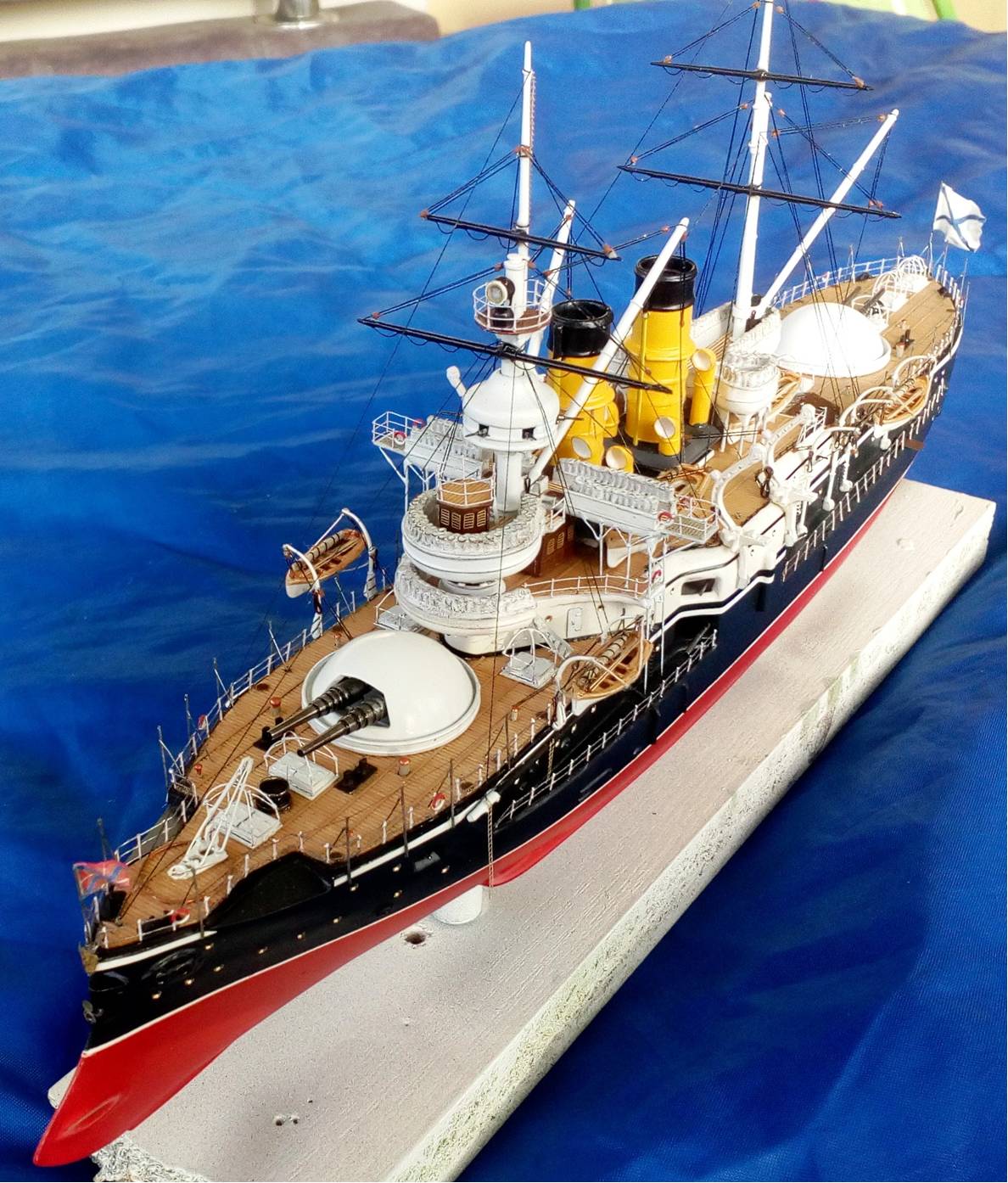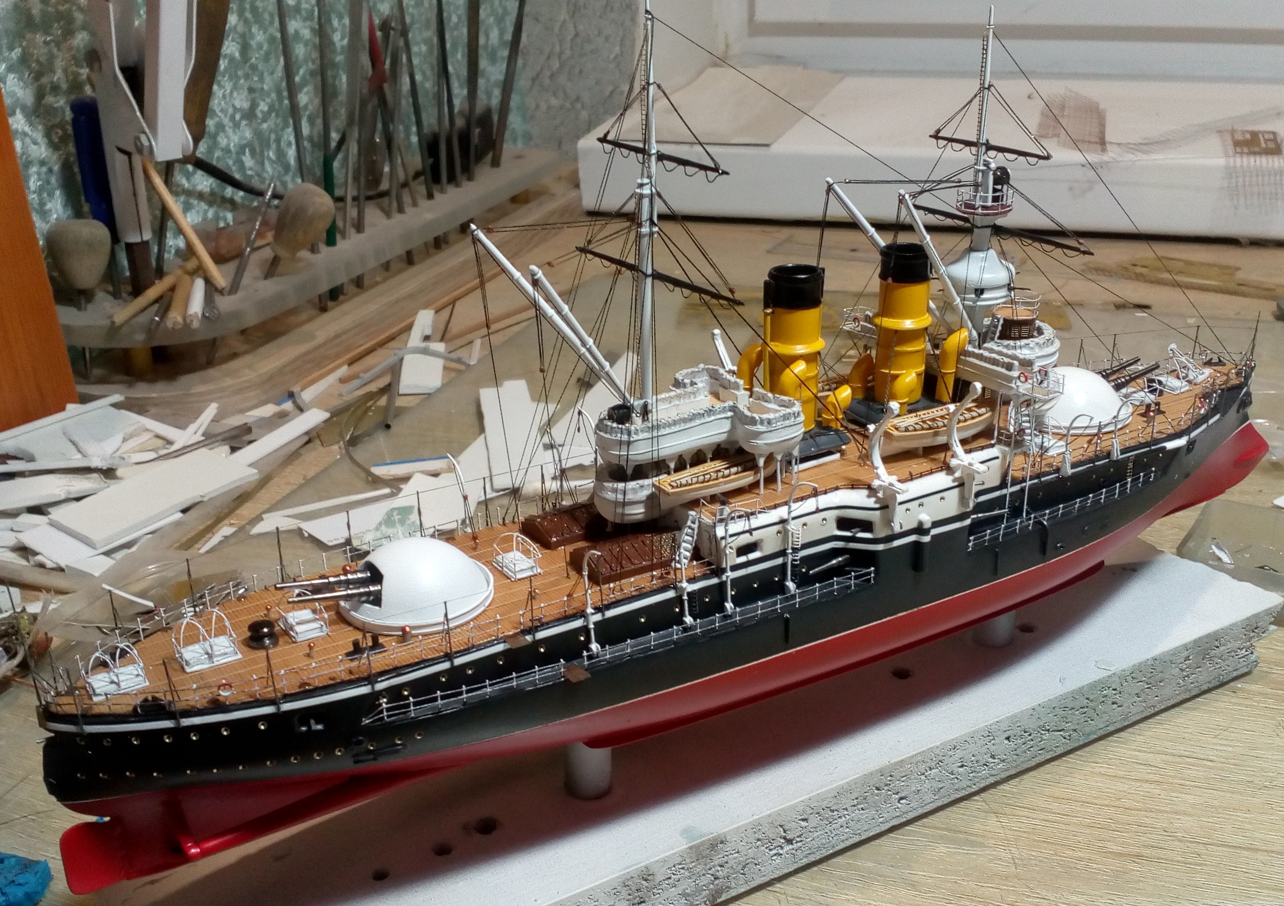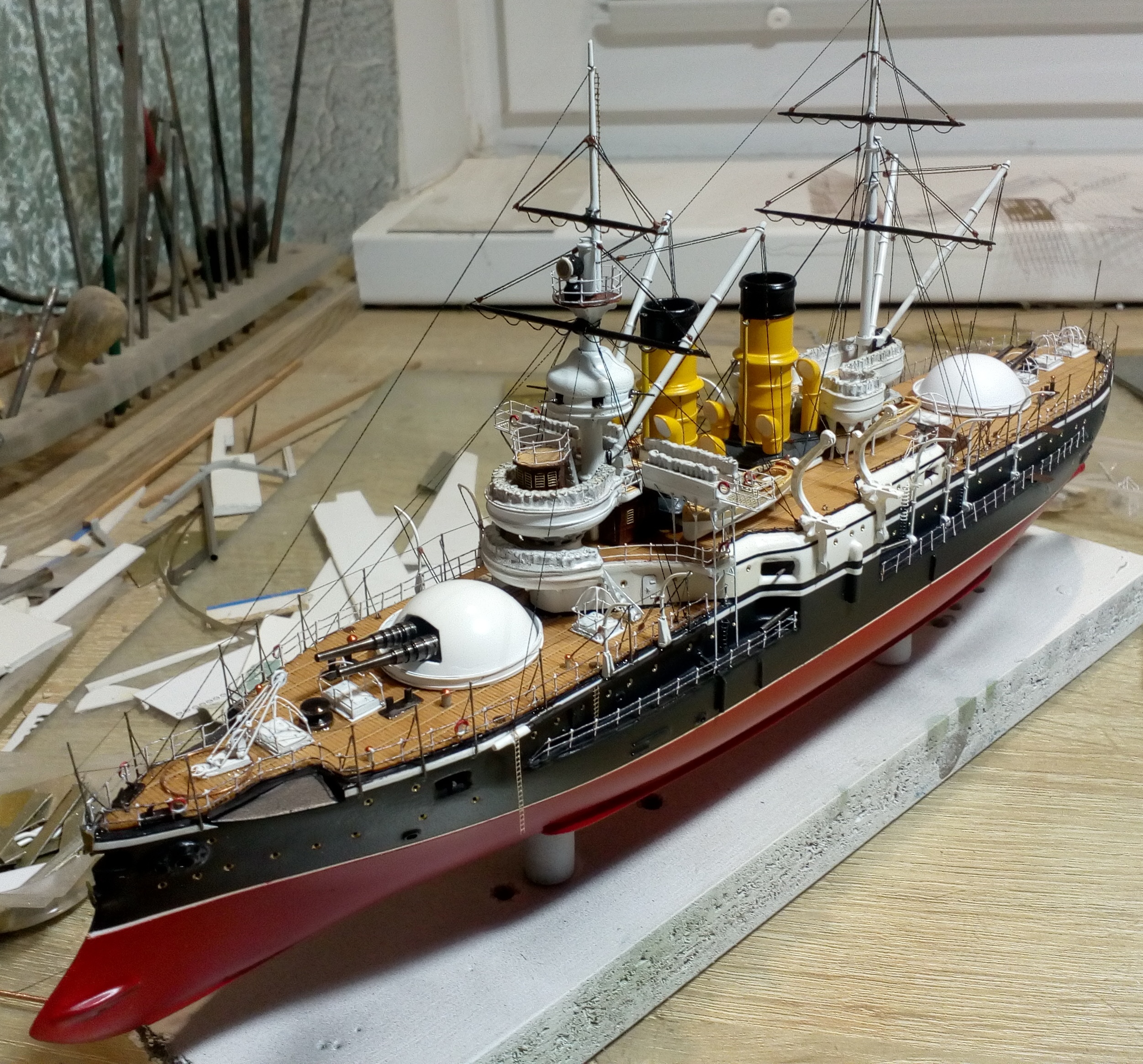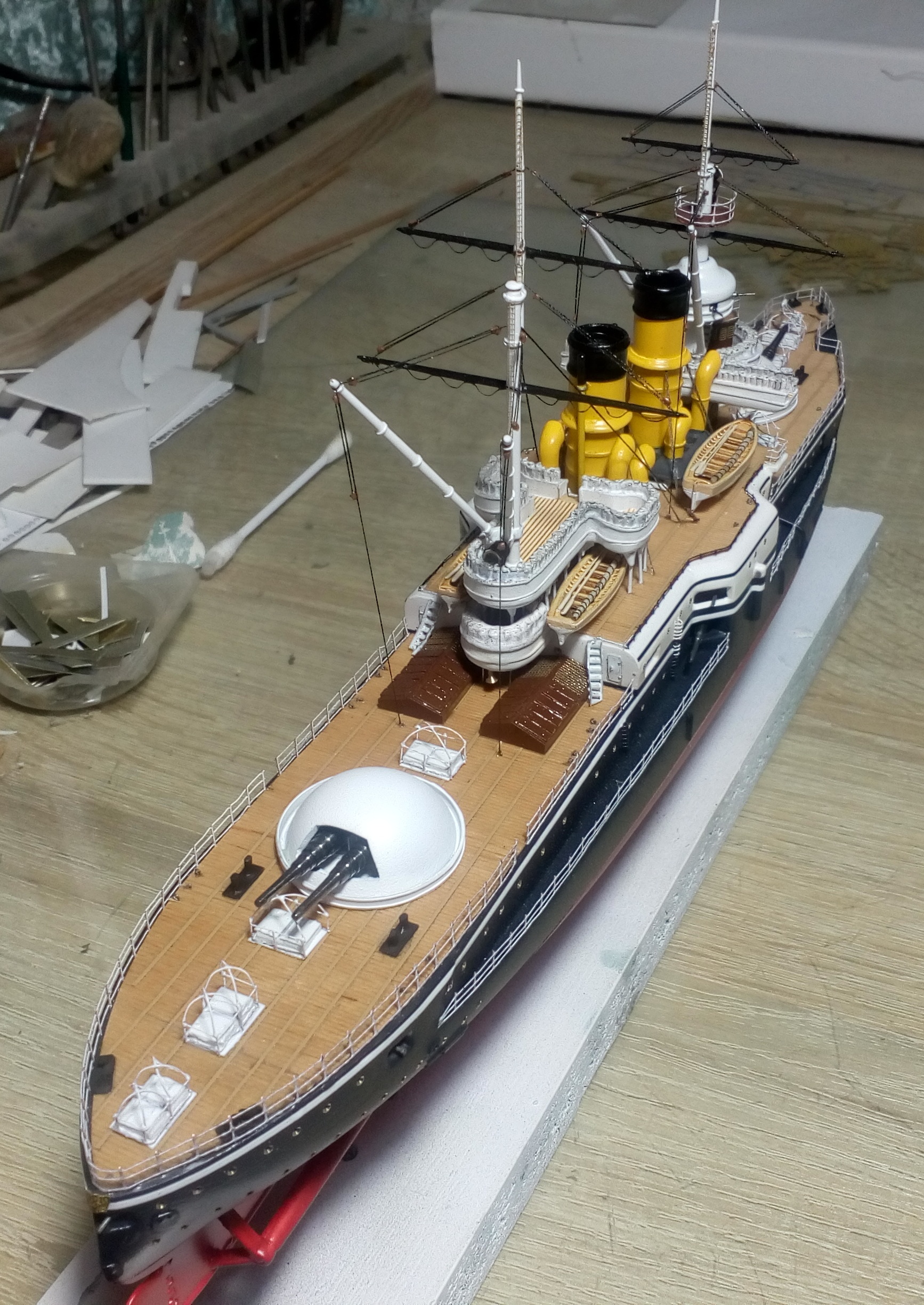Были и черные стойки и белые и вообще без стоек. Но мне тоже больше с белыми нравиться. Сегодня 4 часа потратил на подкраску лееров, низ закрасил черным, а сами леера краской оружейная сталь. На фото она блестит, наверное не до конца подсохла, или от лампочки засветка. Переделывать точно уже не буду, задолбали меня эти леера. Ну и еще добавился стоячий такелаж.