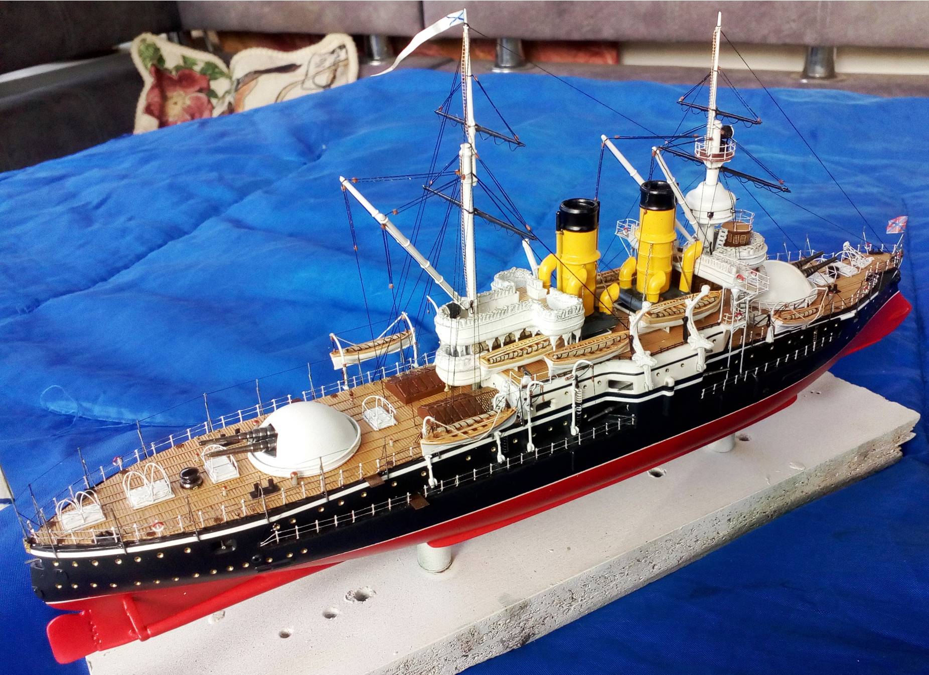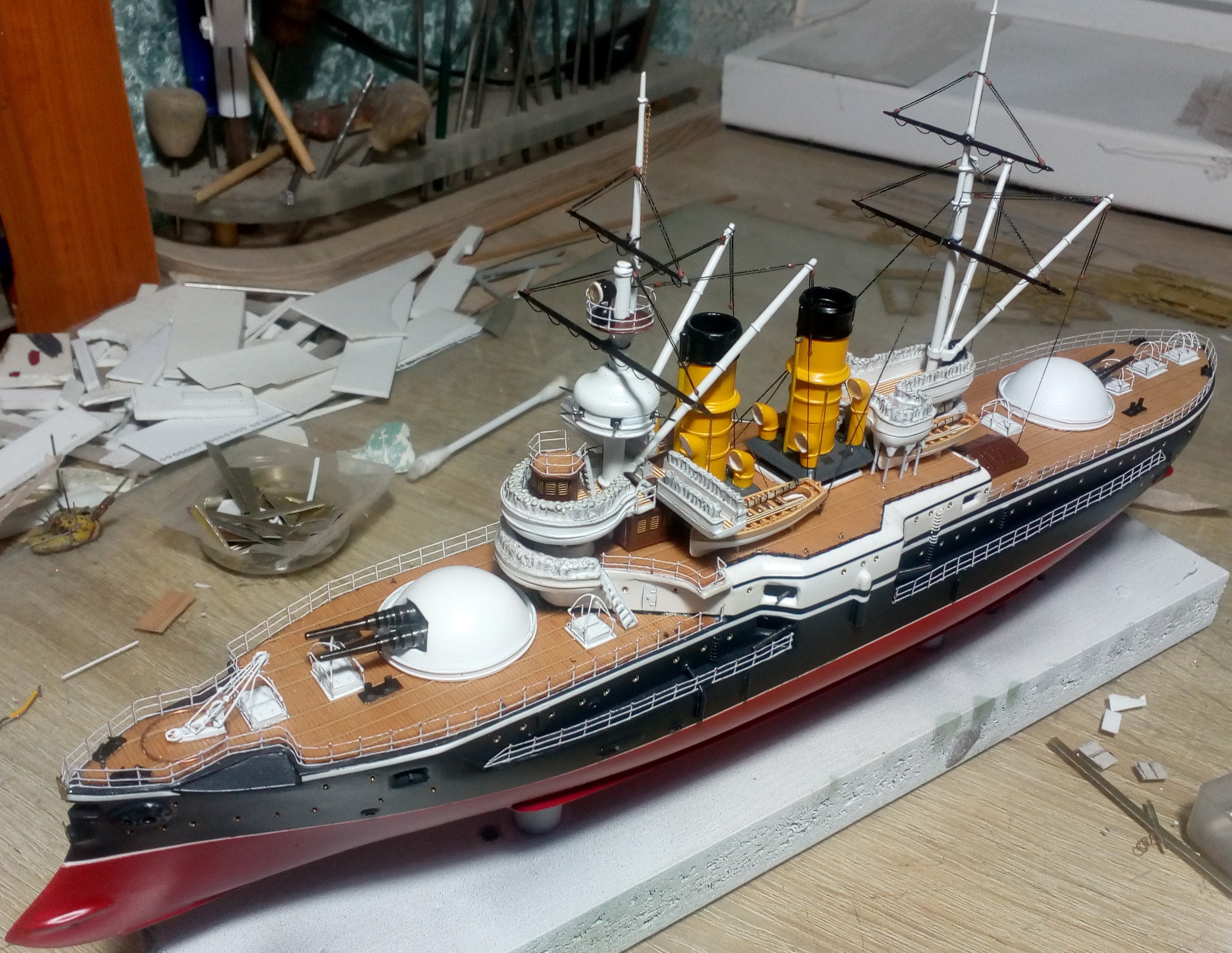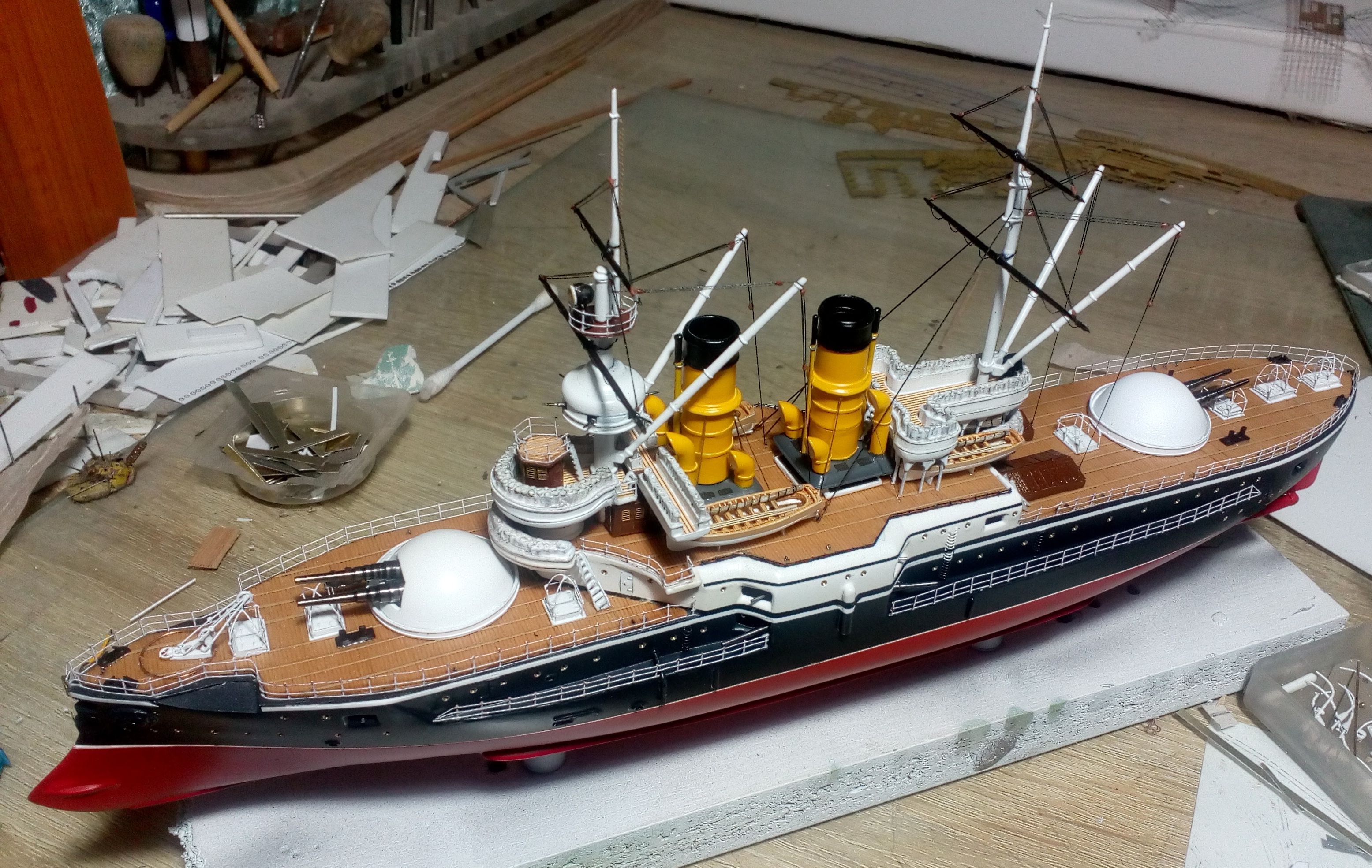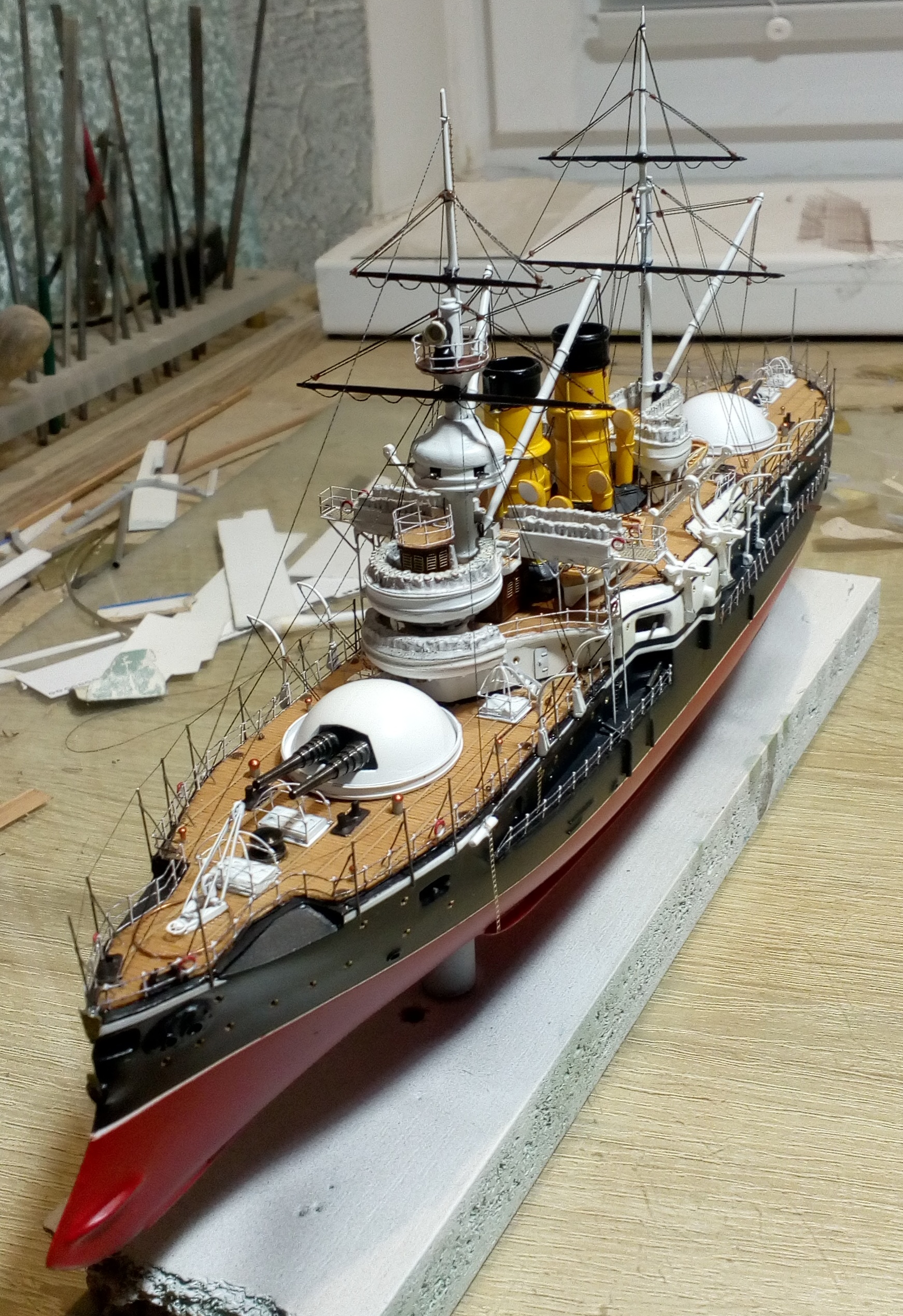 Были и черные стойки и белые и вообще без стоек. Но мне тоже больше с белыми нравиться. Сегодня 4 часа потратил на подкраску лееров, низ закрасил черным, а сами леера краской оружейная сталь. На фото она блестит, наверное не до конца подсохла, или от лампочки засветка. Переделывать точно уже не буду, задолбали меня эти леера. Ну и еще добавился стоячий такелаж.