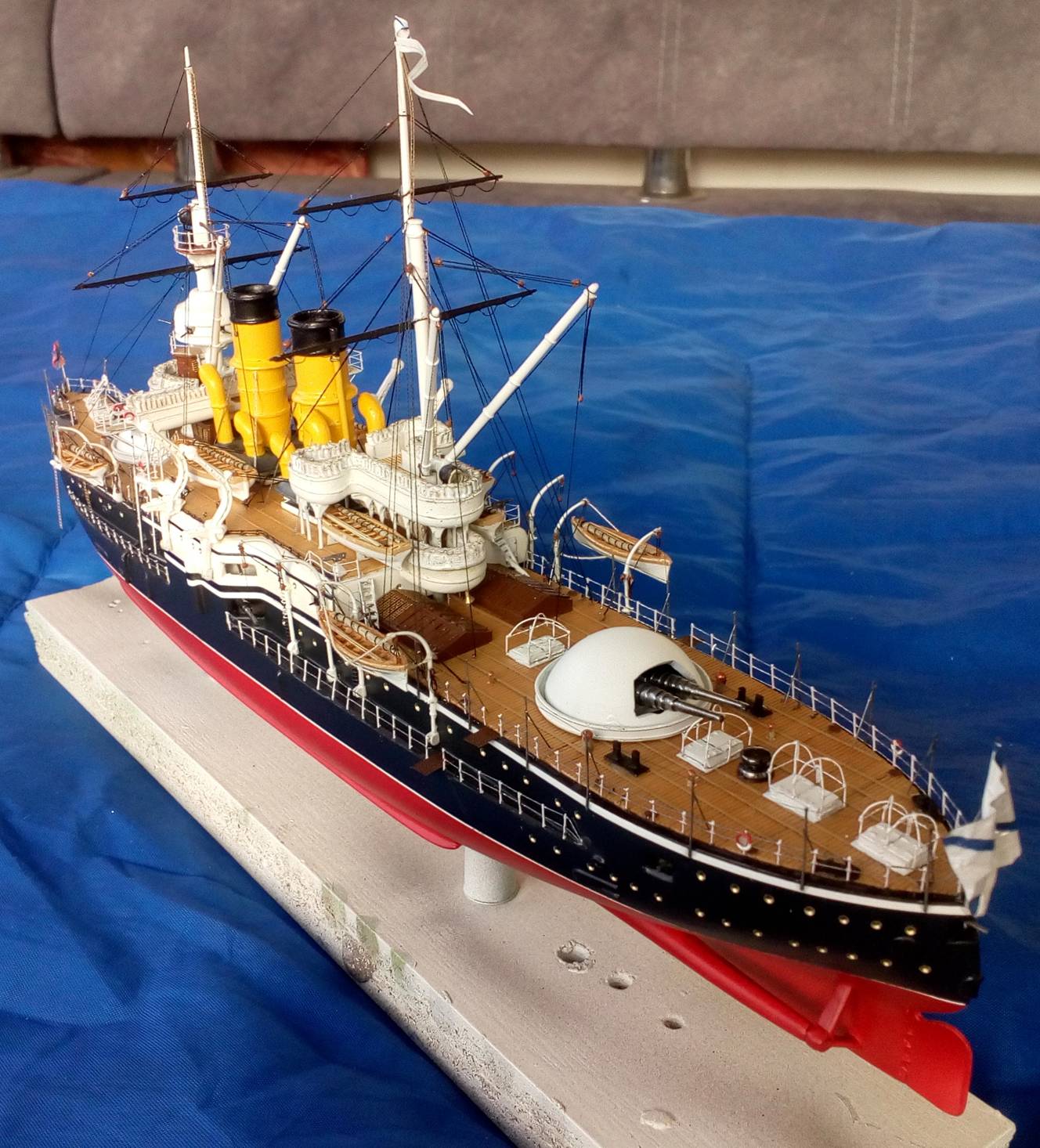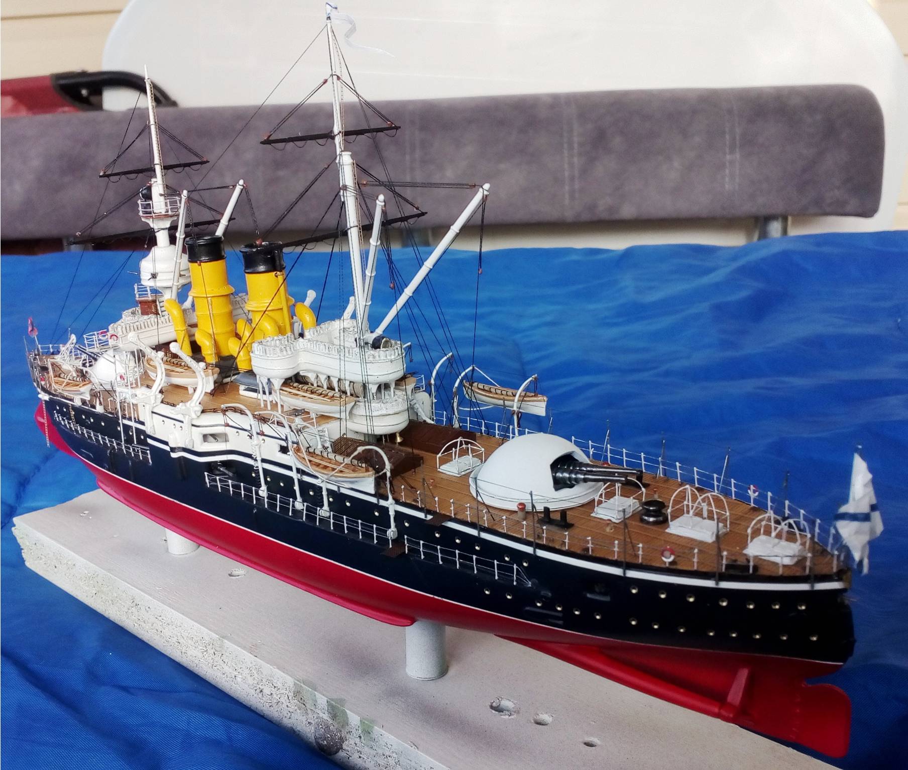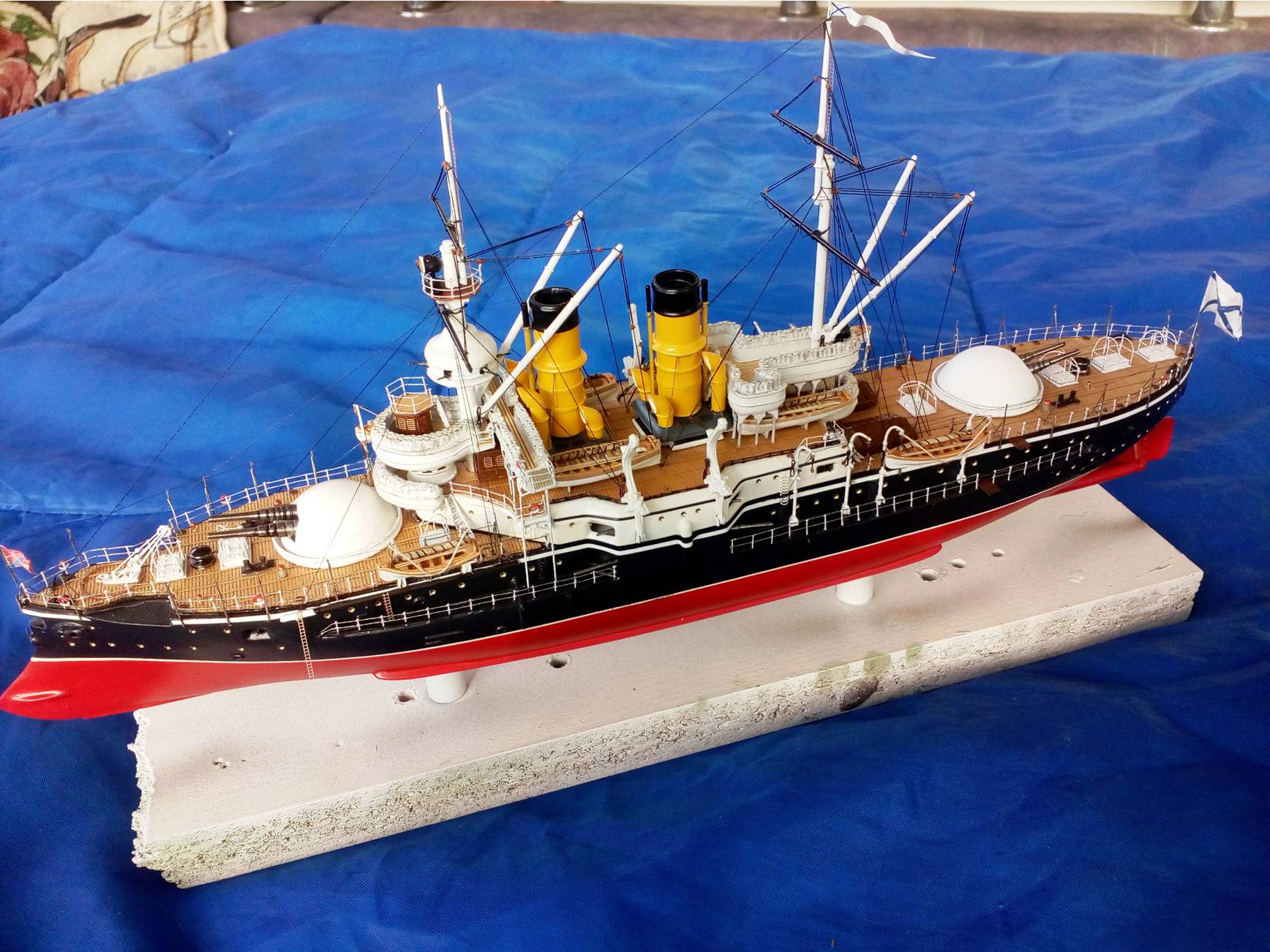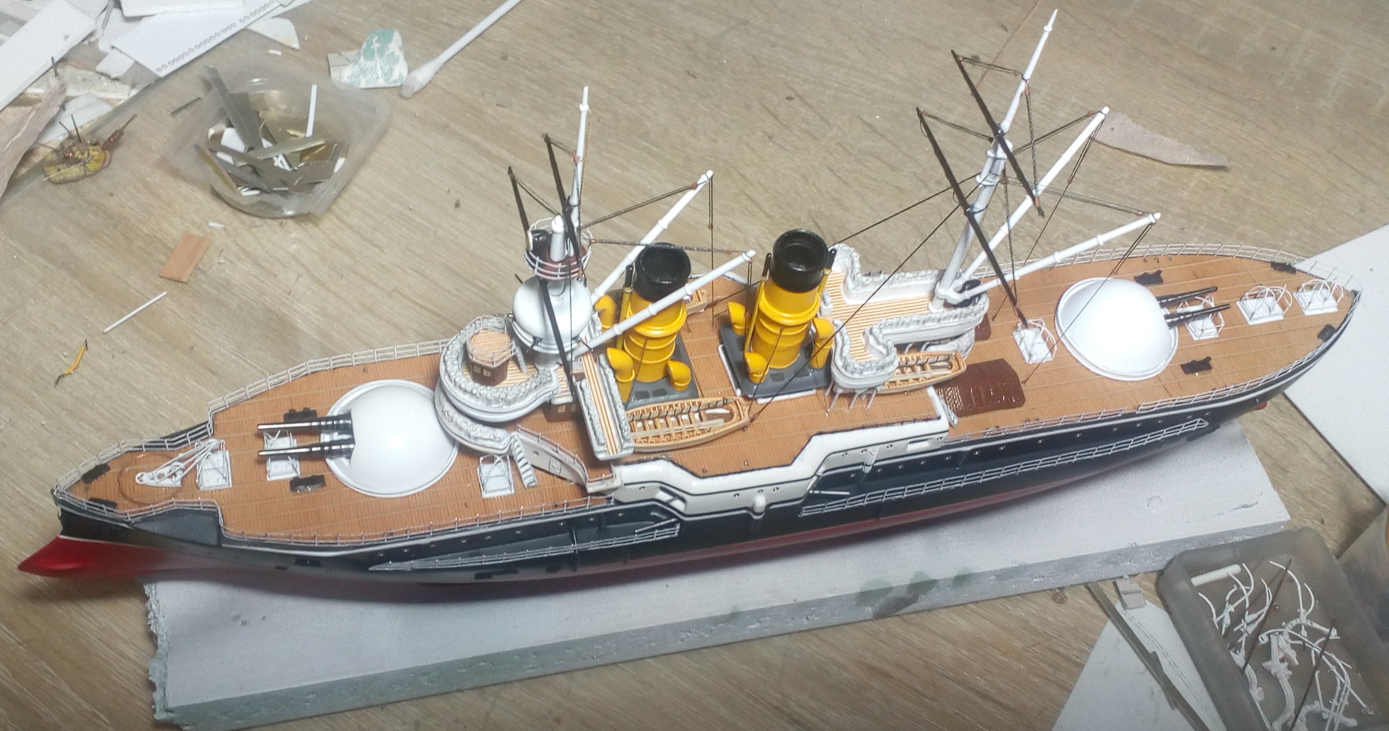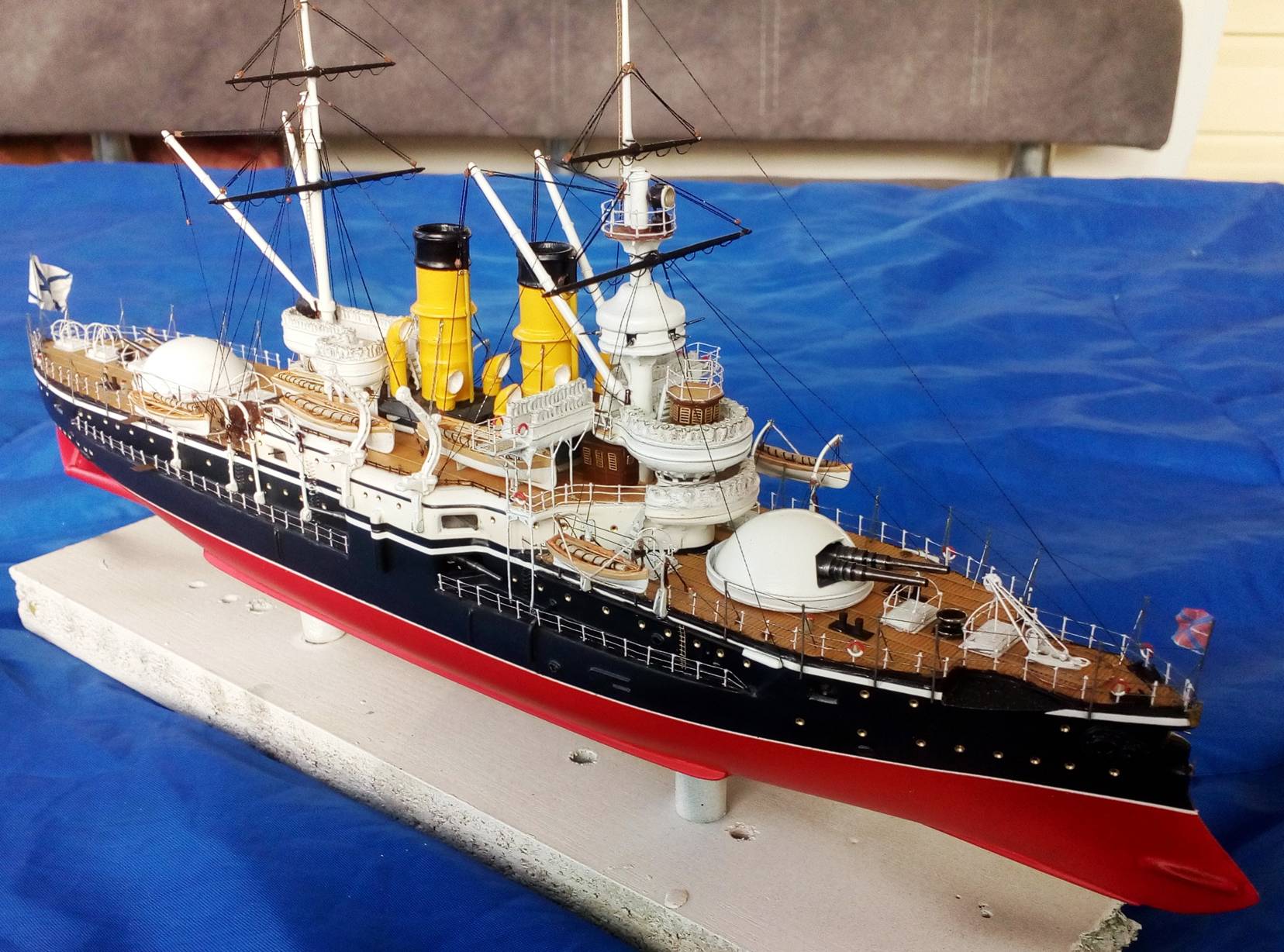 Были и черные стойки и белые и вообще без стоек. Но мне тоже больше с белыми нравиться. Сегодня 4 часа потратил на подкраску лееров, низ закрасил черным, а сами леера краской оружейная сталь. На фото она блестит, наверное не до конца подсохла, или от лампочки засветка. Переделывать точно уже не буду, задолбали меня эти леера. Ну и еще добавился стоячий такелаж.