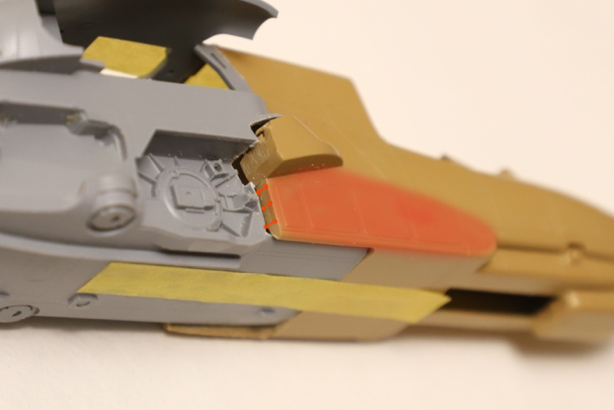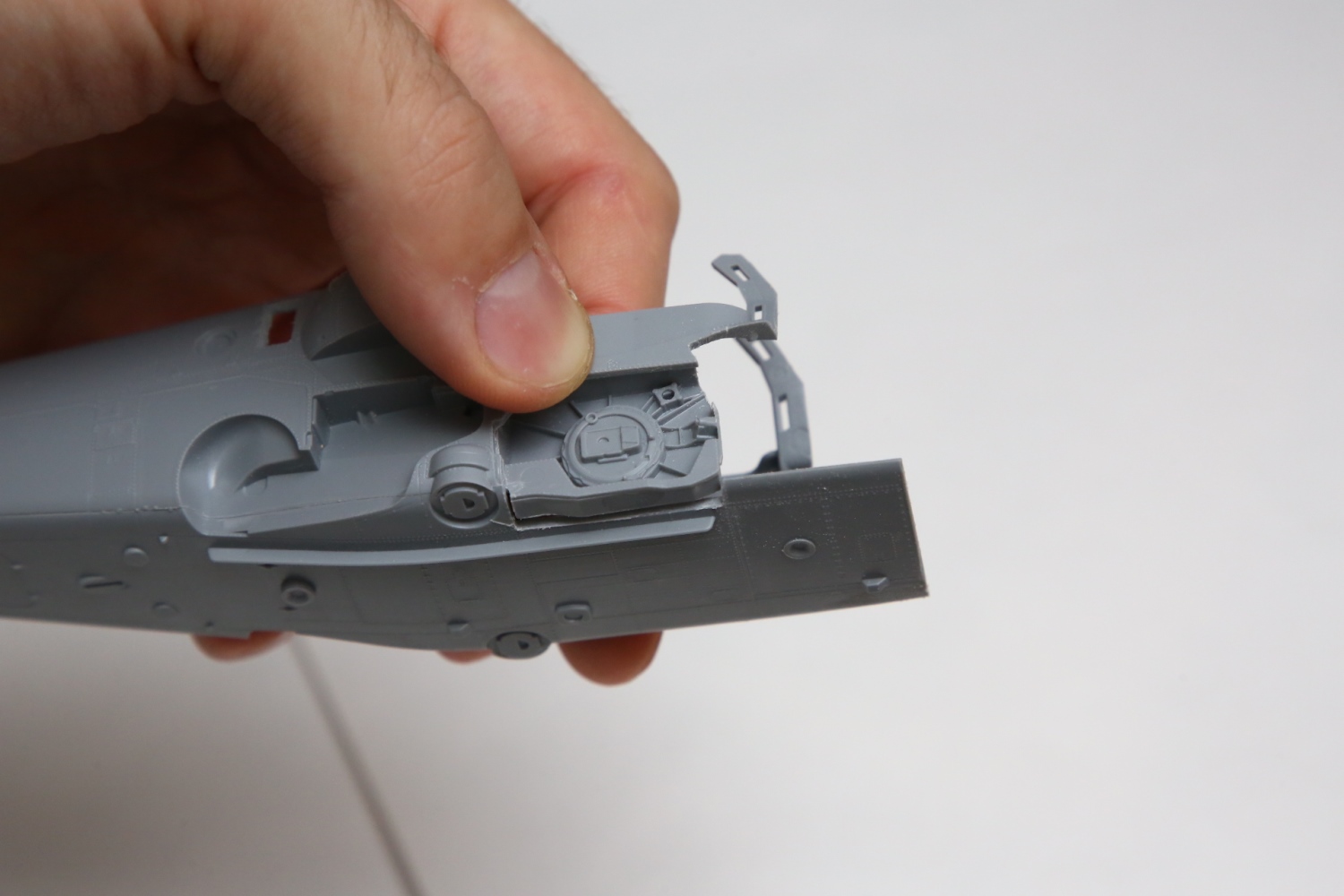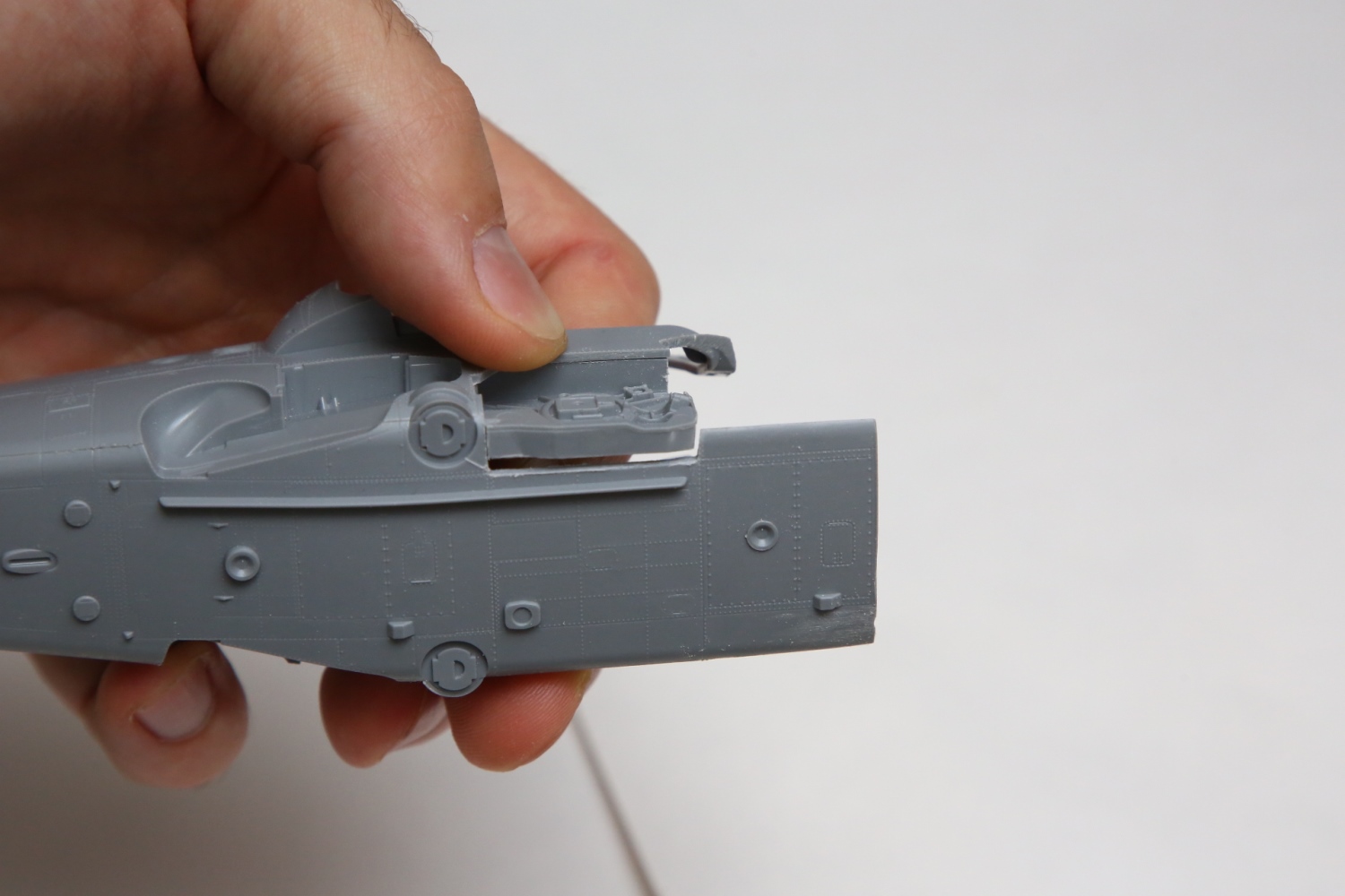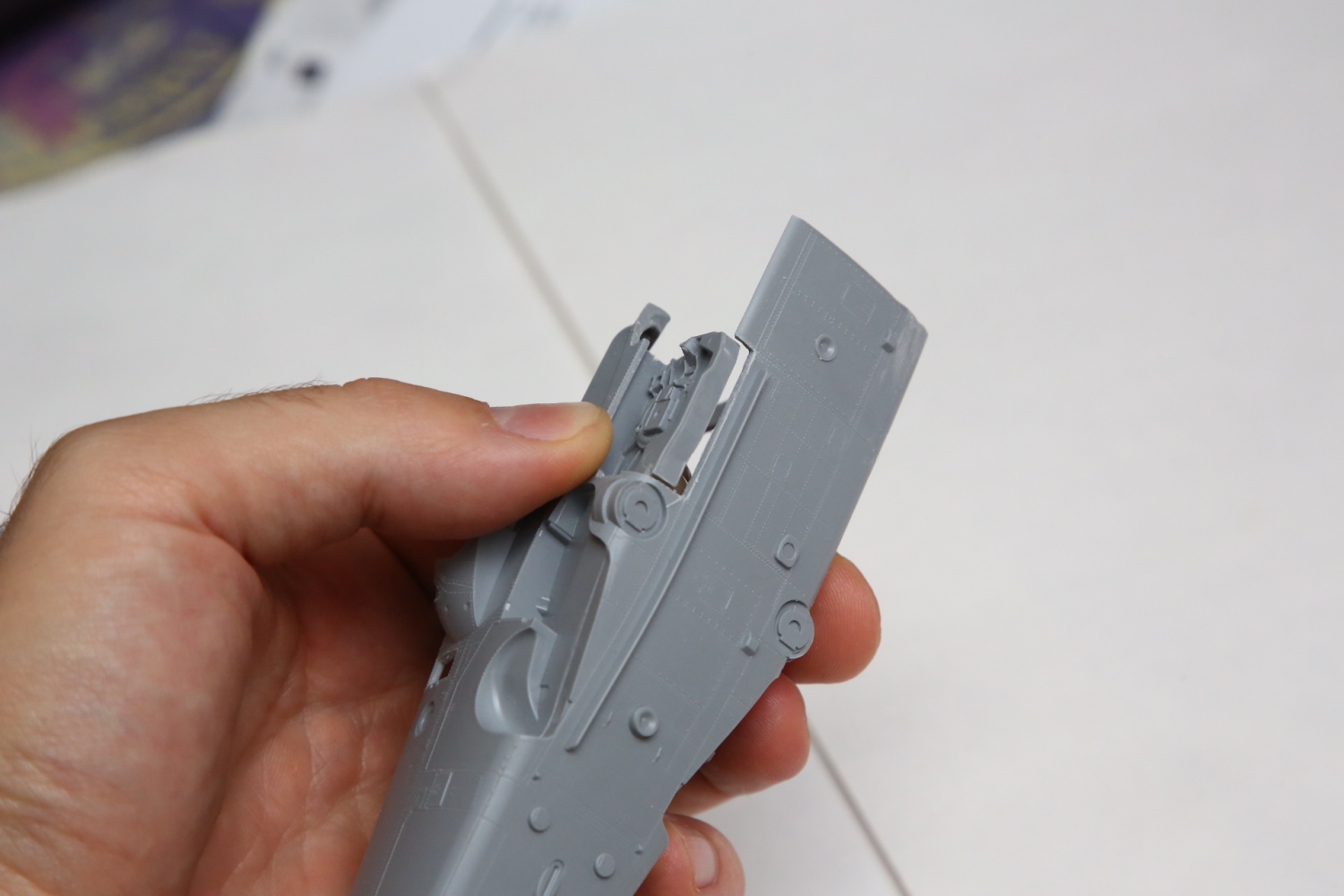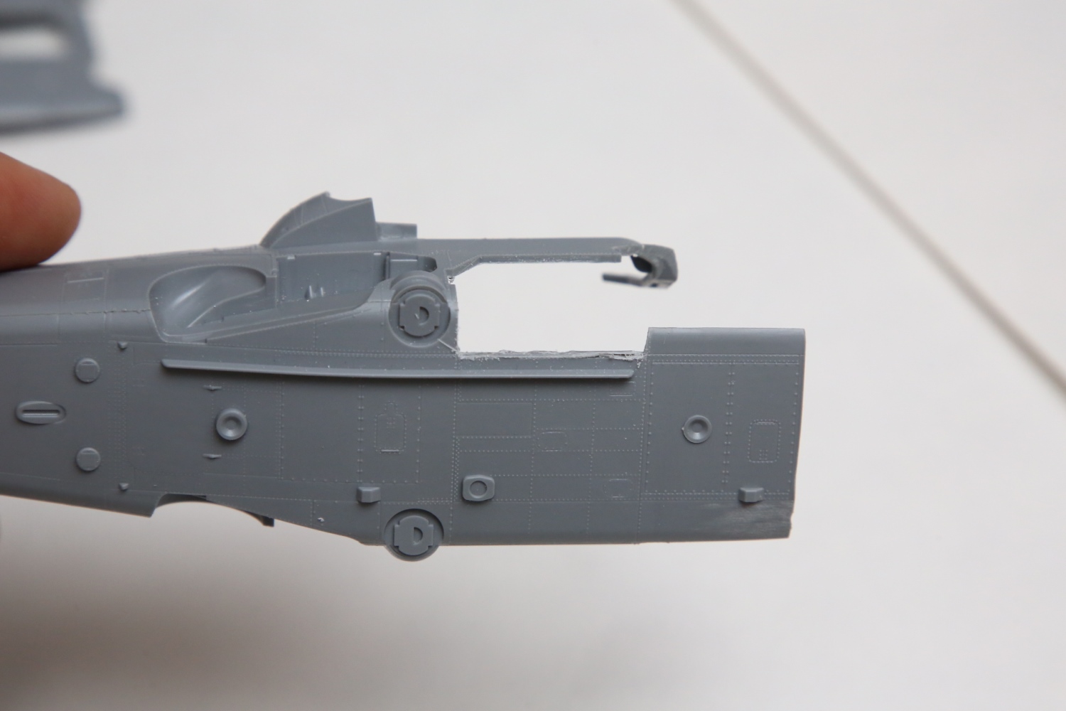 Как я уже рассказывал, я - изкоробочник в целом. Но есть определённые моменты, кот. бесят, с кот. смириться ну не могу никак. И знаю, что будет бесить меня эта ступень. Плюс, если оставить, как есть, то, скорее всего, придётся добавлять что-то в посадочное место для пушки. Потому как если фюзеляж Акулы шире, то пушка "ляжет" на эту часть фюзеляжа. Т.к. фюзеляж будет ближе к пушке находиться. Пушка-то под Аллигатора с более узким носом. Понятно, нет? Или хреново объяснил...? Что-то добавляем, подкладываем под пушку, получаем, что пушка "стоит" намного дальше от своей "ниши" с множеством разнообразных узлов. Уже как-то не тот вид... Всё это меня бесит. Но я думал, что оставлю это на "издержки" идеи. Что не получится идеально. А потом принял волевое решение - сделать всё, что в моих силах, чтобы было хорошо. И решил таки выпилить нишу установки пушки. И за счёт доработки этой ниши, расширить в этом месте фюзеляж. Выходит, я поспешил с ней, когда вклеивал. Ну, всё сразу не предусмотреть. Да, не ожидал. Но посмотрел - можно выпилить аккуратно с минимальными повреждениями. Выпилил.