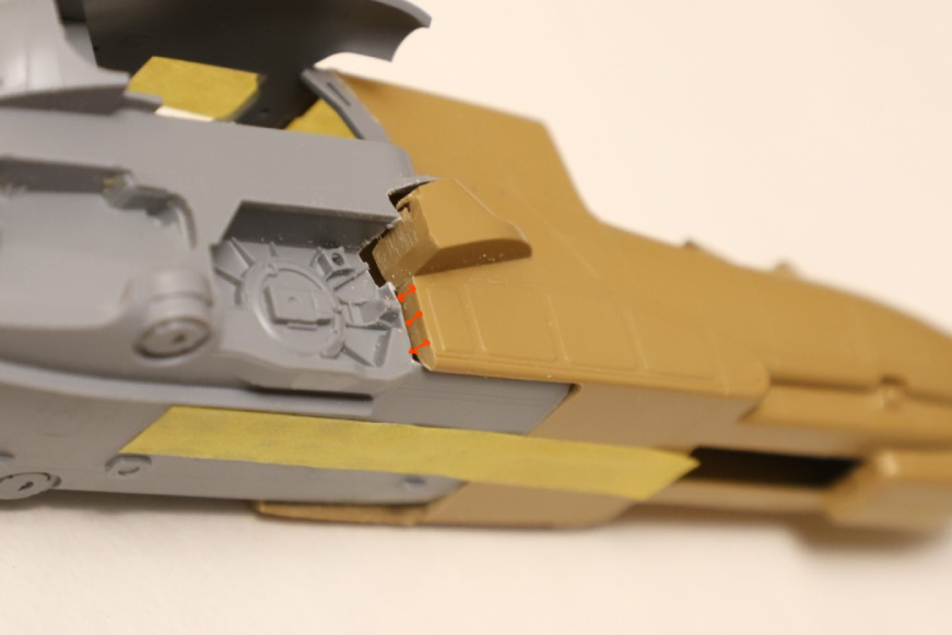 Сегодня я просидел ещё пару часов. Вот только закончил! Долго мучился с установкой ниши пушки. Можно было поставить и потом уже заделывать получившиеся огромные щели и пустоты. Но решил всё-таки сделать всё, тщательно подготовившись. В итоге всё стоит довольно аккуратно с уже культурно заделанными пустотами и щелями. Дальше зато меньше трудностей. Также уже с помощью кусочков пластика заделаны некоторые щели в районе двигателей.