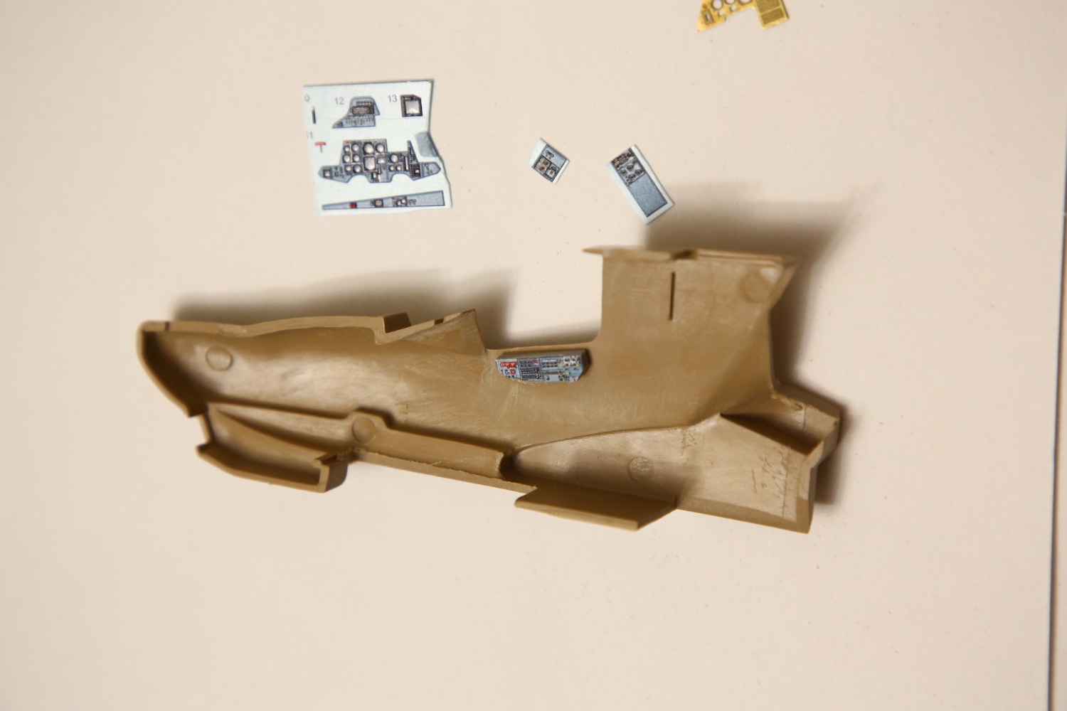 Берём ненужную декаль от квинты с приборными панелями для Су-27 в 48-ом... и крамсаем маникюрными ножницами. И сажам на эту панель!