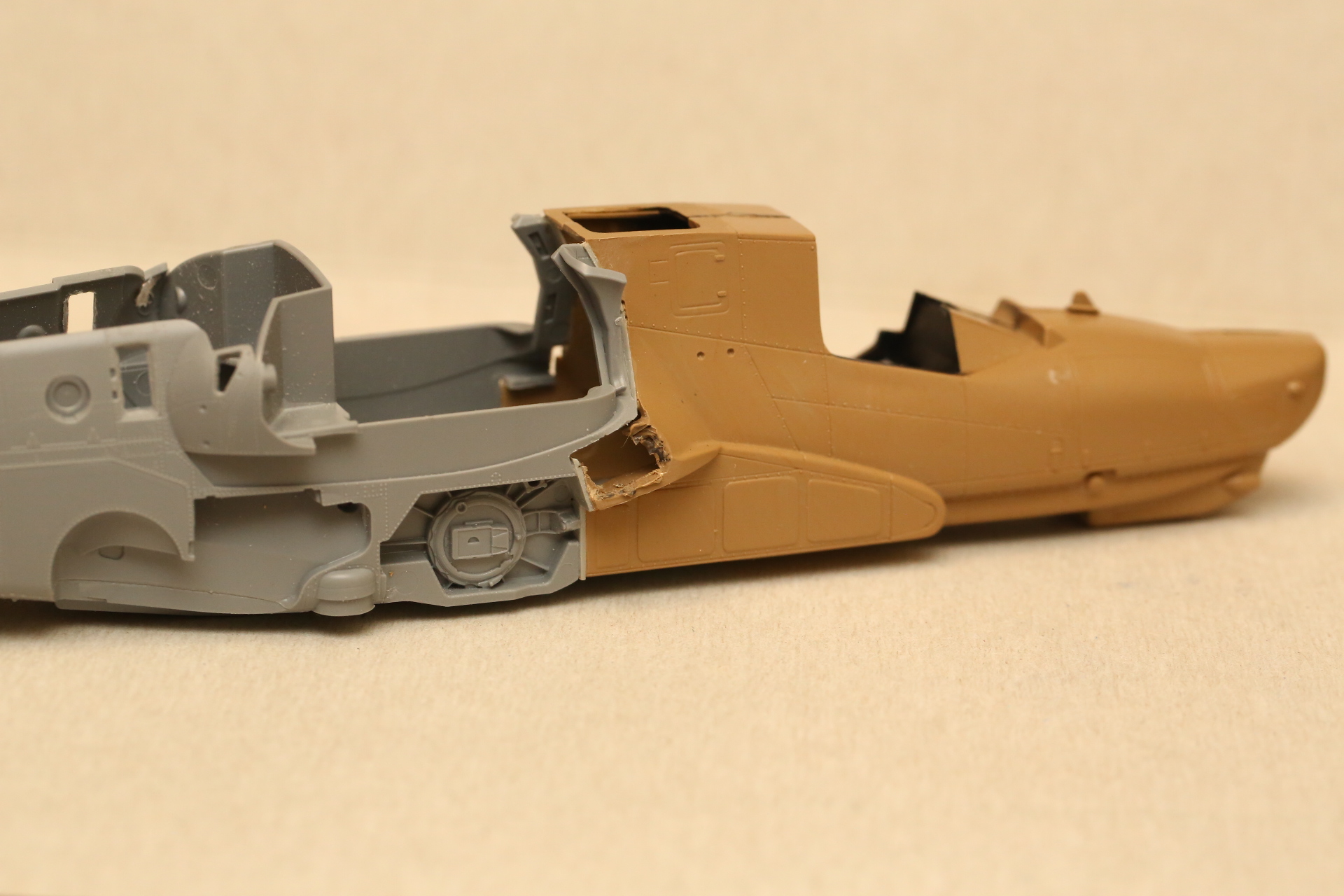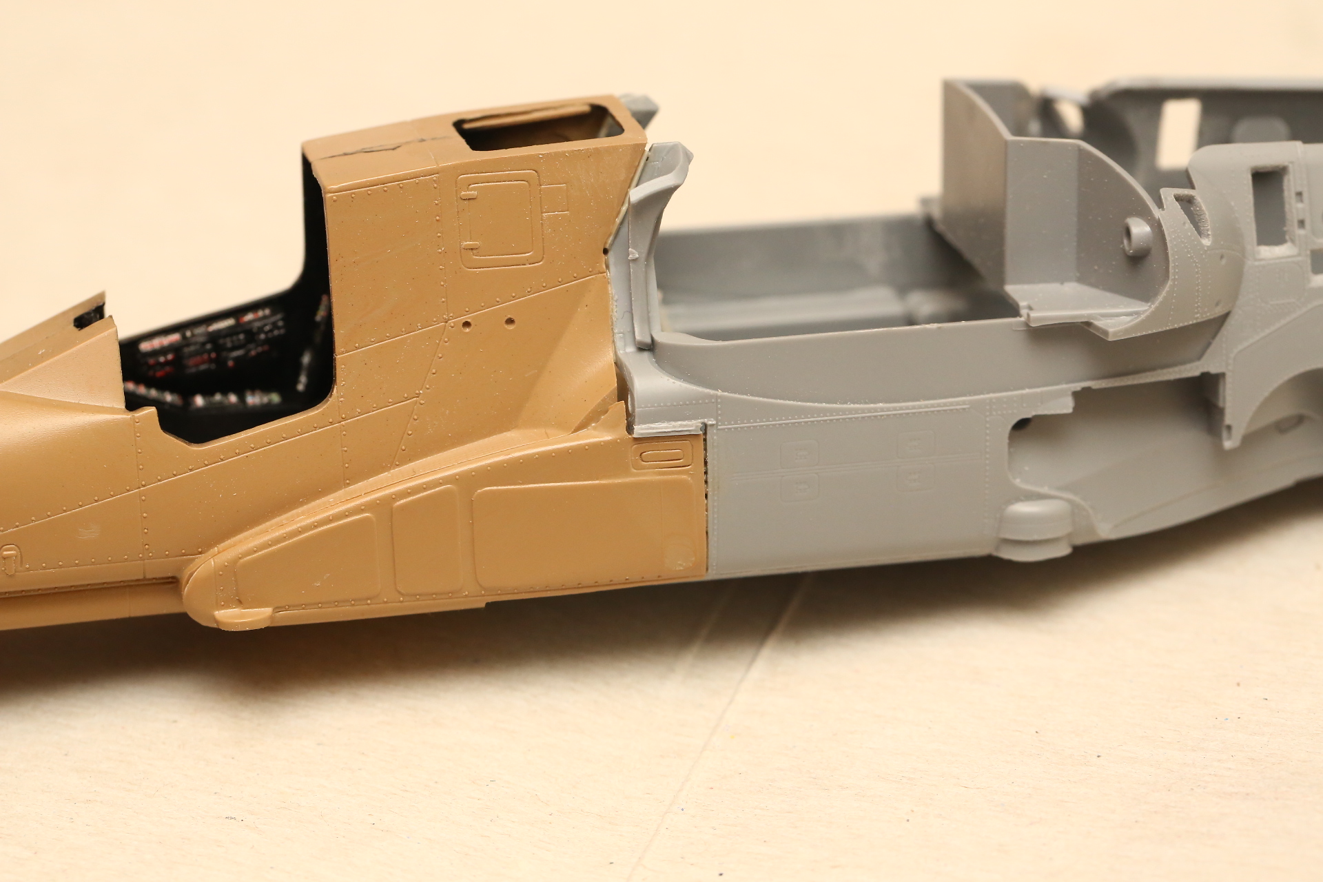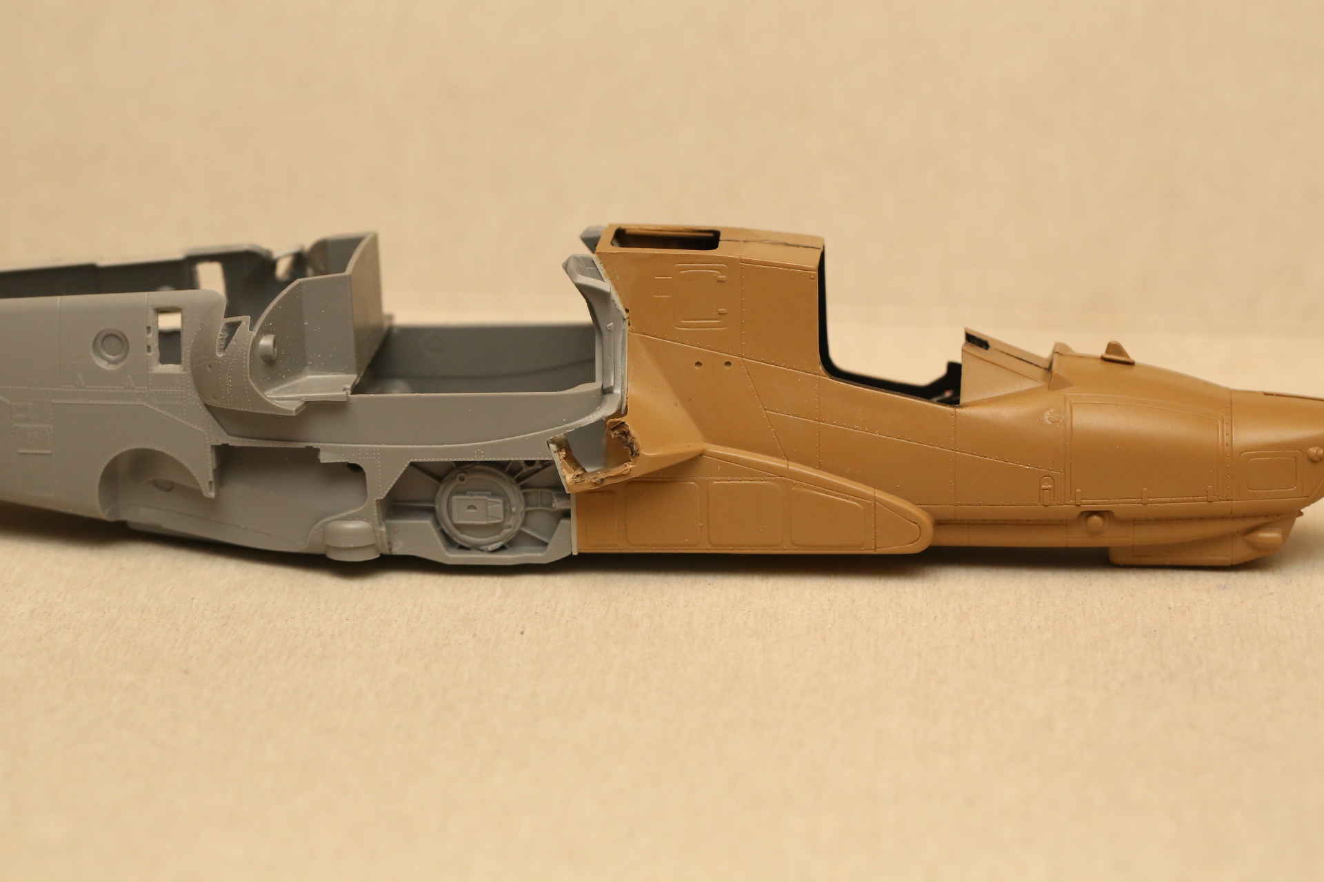 Склеиваем нос и закрепляем в нём кабину на модельный клей, т.к. примерял и вклеивал в половинку фюзеляжа на супер-клей. Есть риск, что отвалится при дальнейших манипуляциях.
