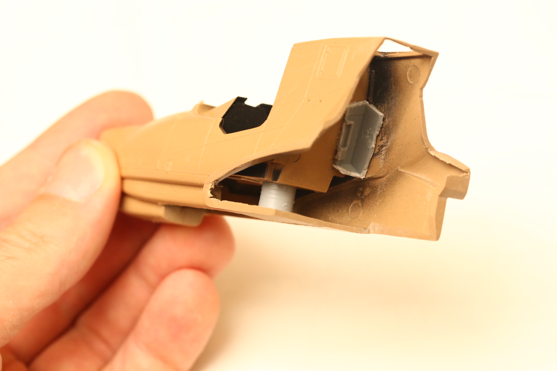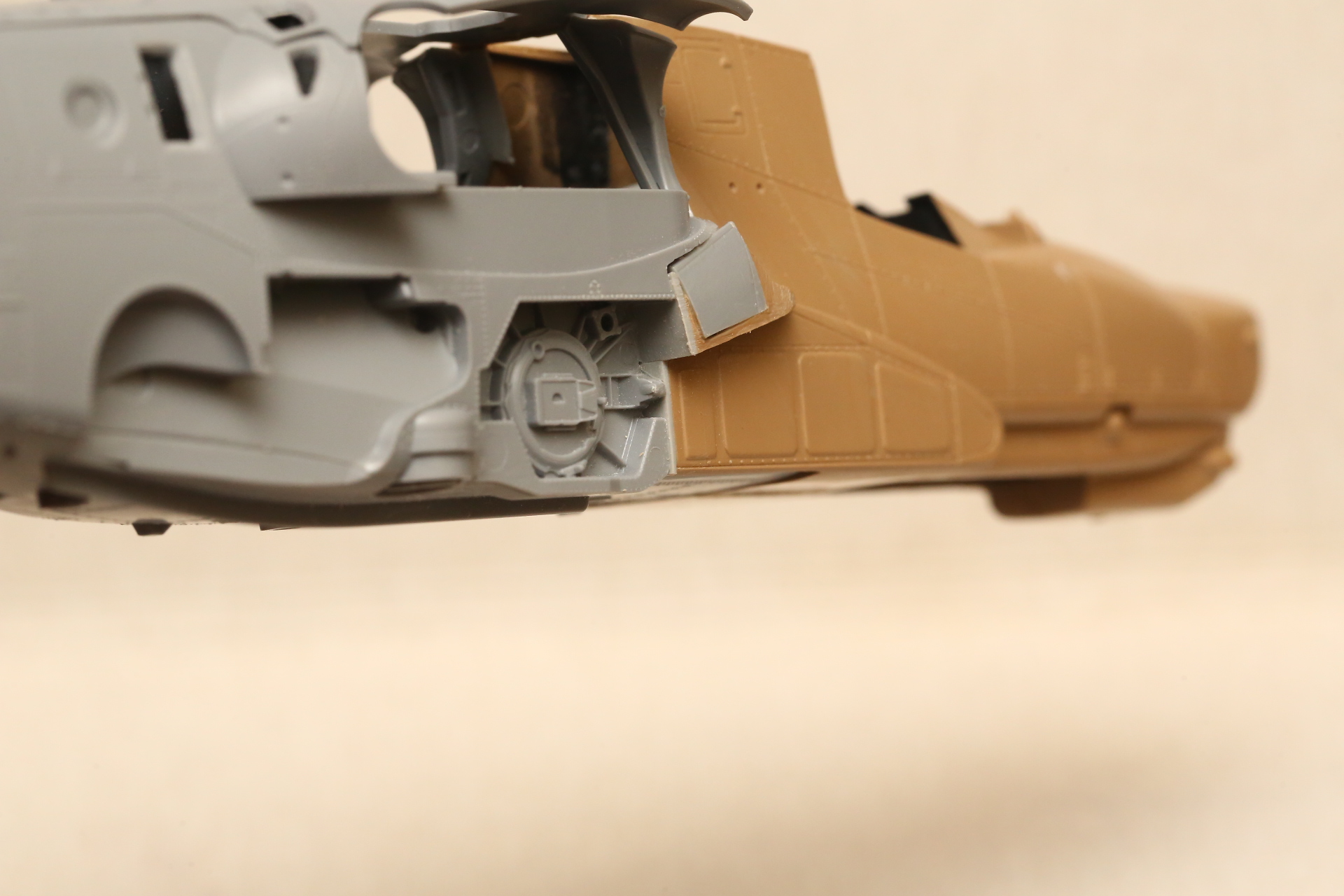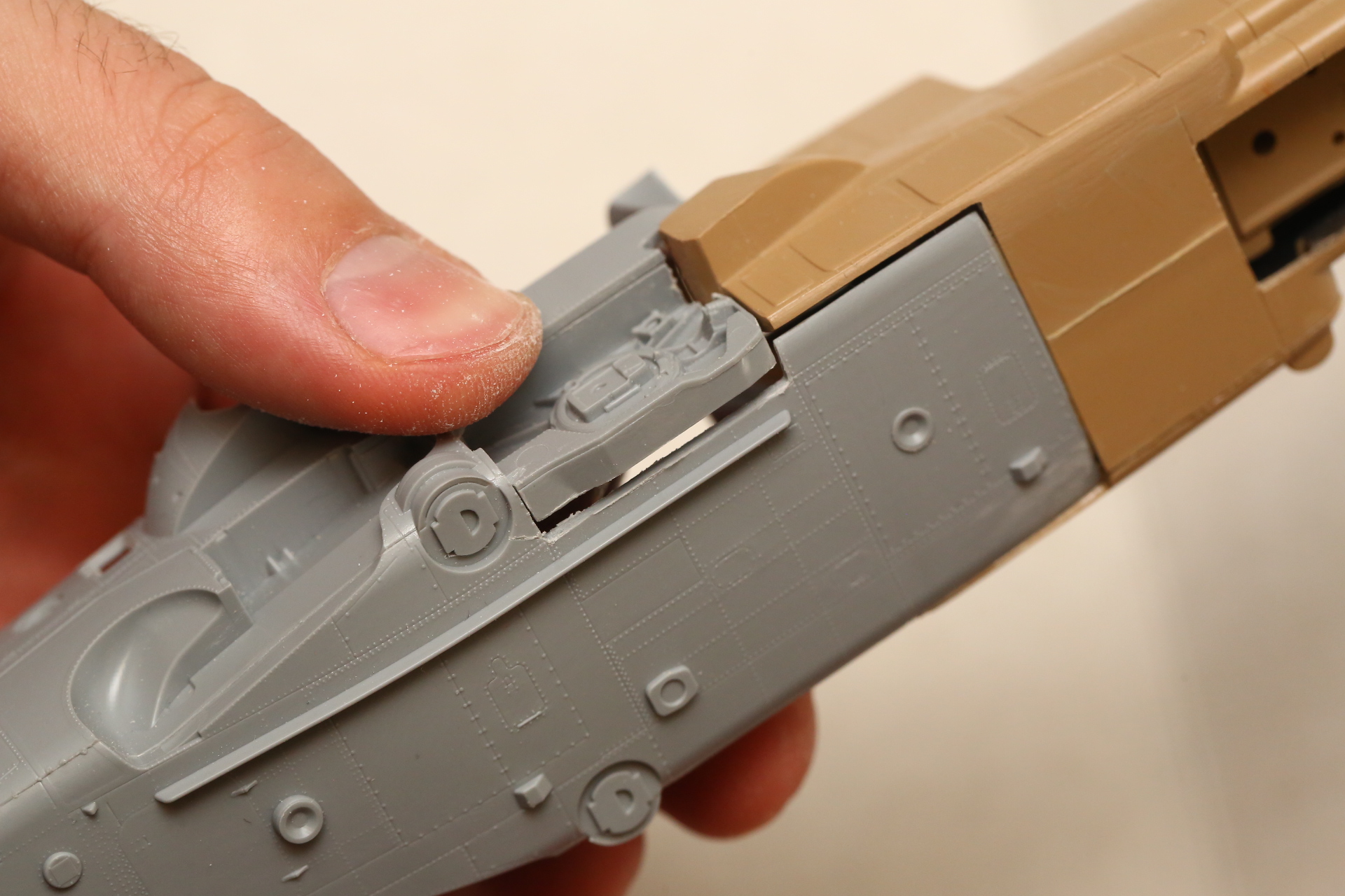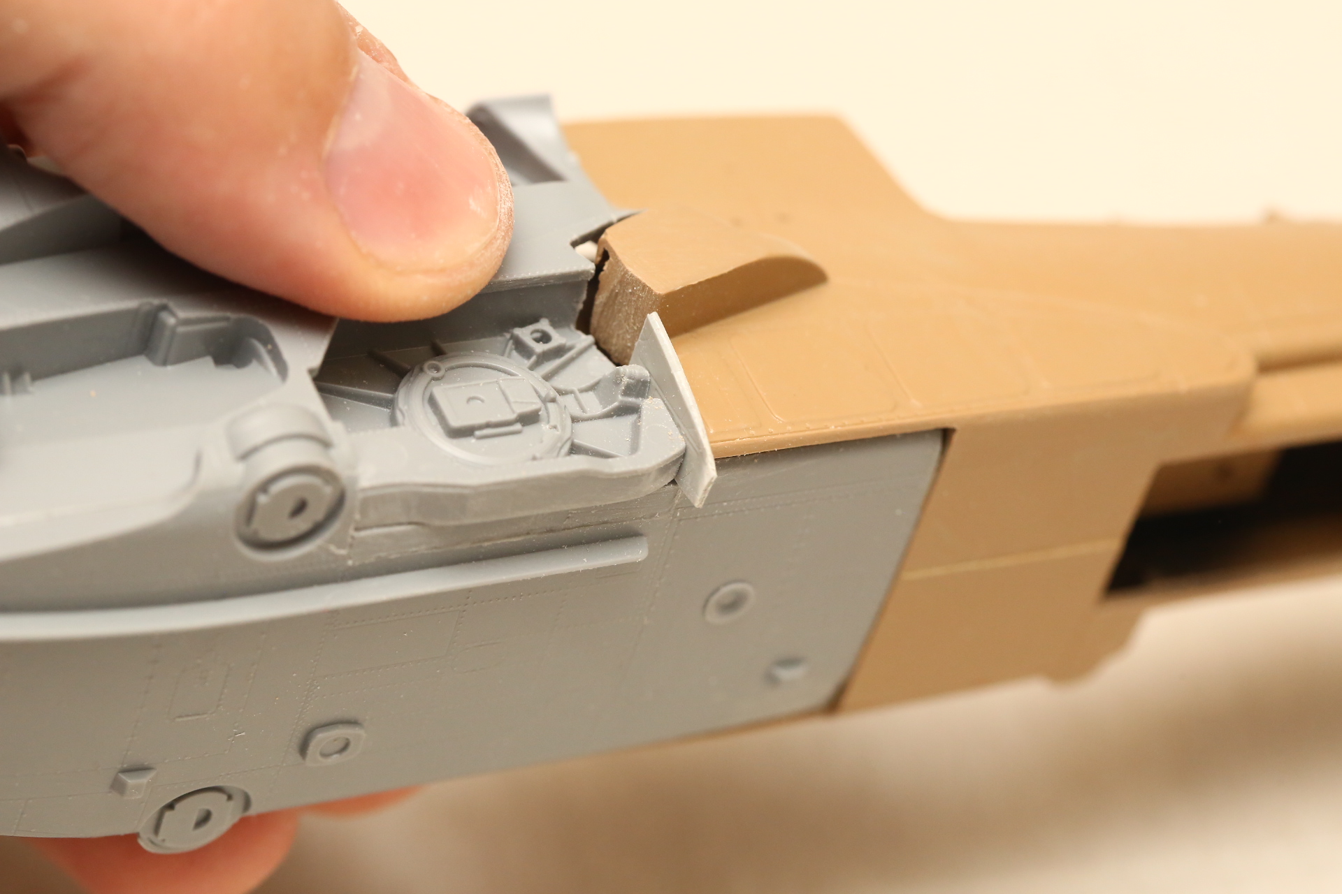 Нишу сточил, чтобы она была ближе к краю фюзеляжа, сходясь с носом Акулы. В щель нужно запихнуть пластик.