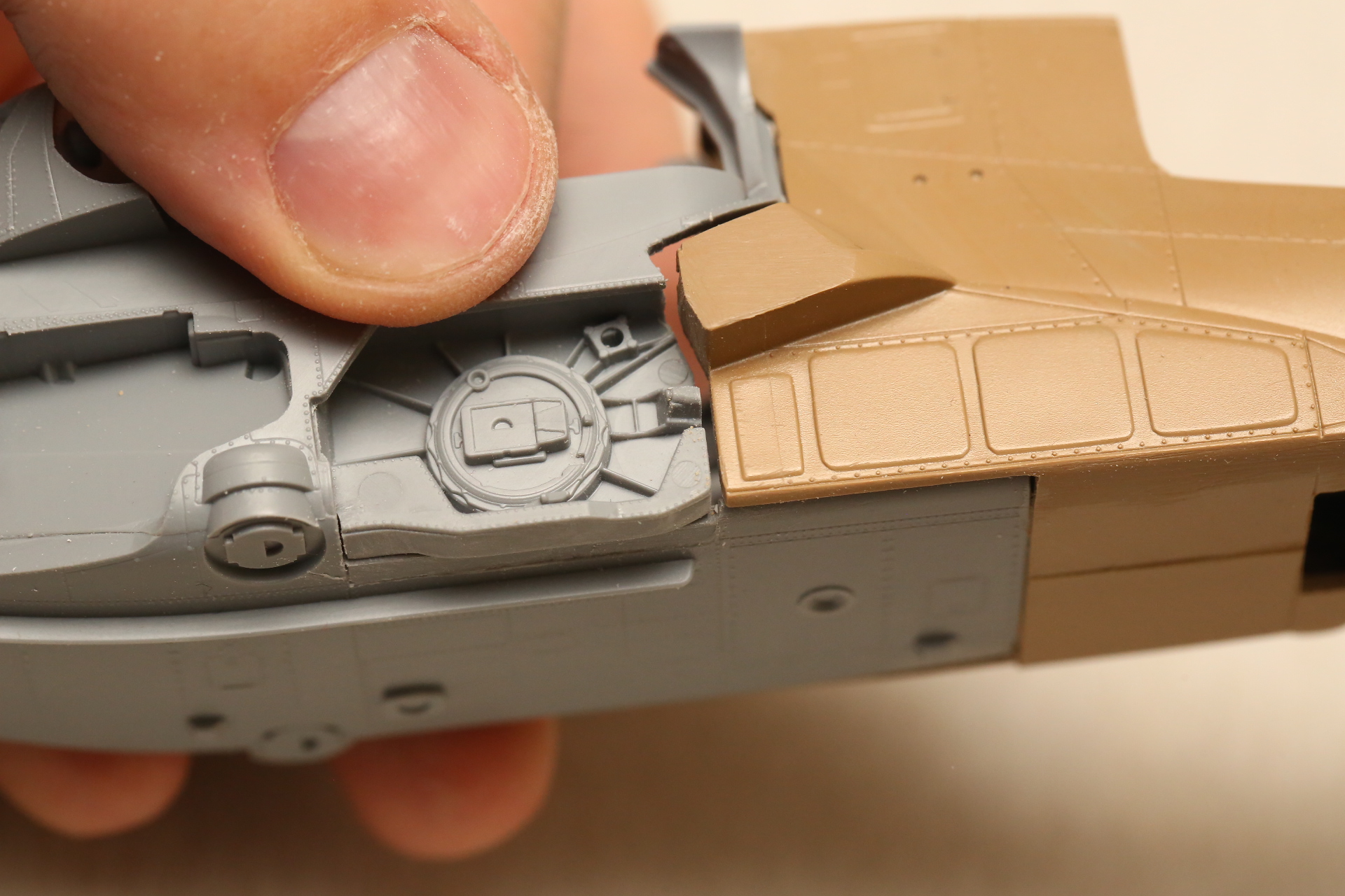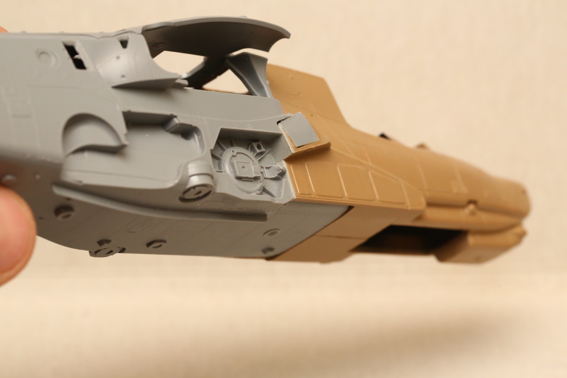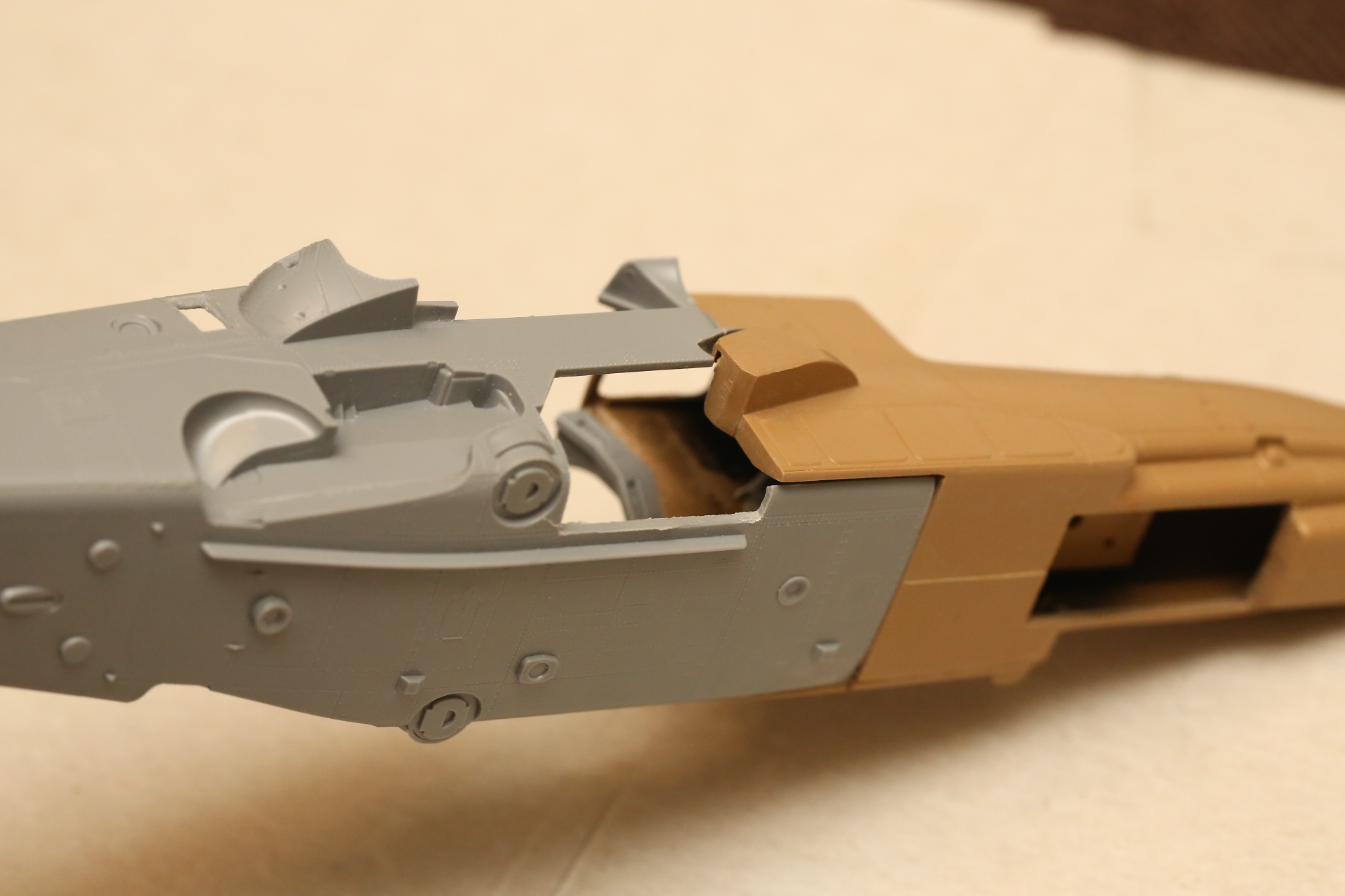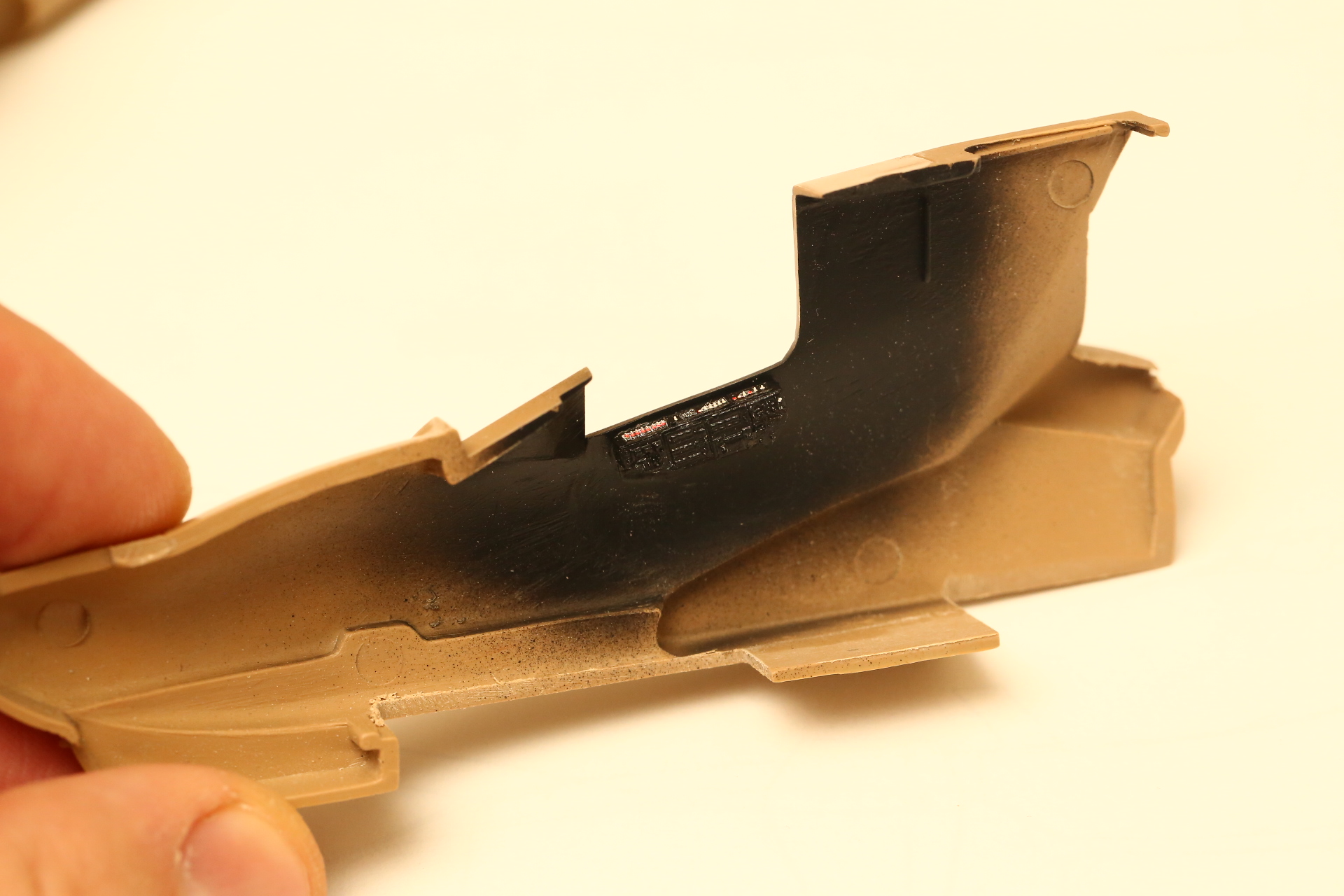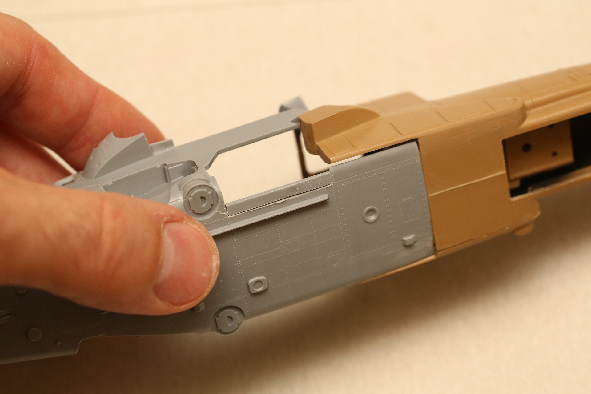 Нишу сточил, чтобы она была ближе к краю фюзеляжа, сходясь с носом Акулы. В щель нужно запихнуть пластик.