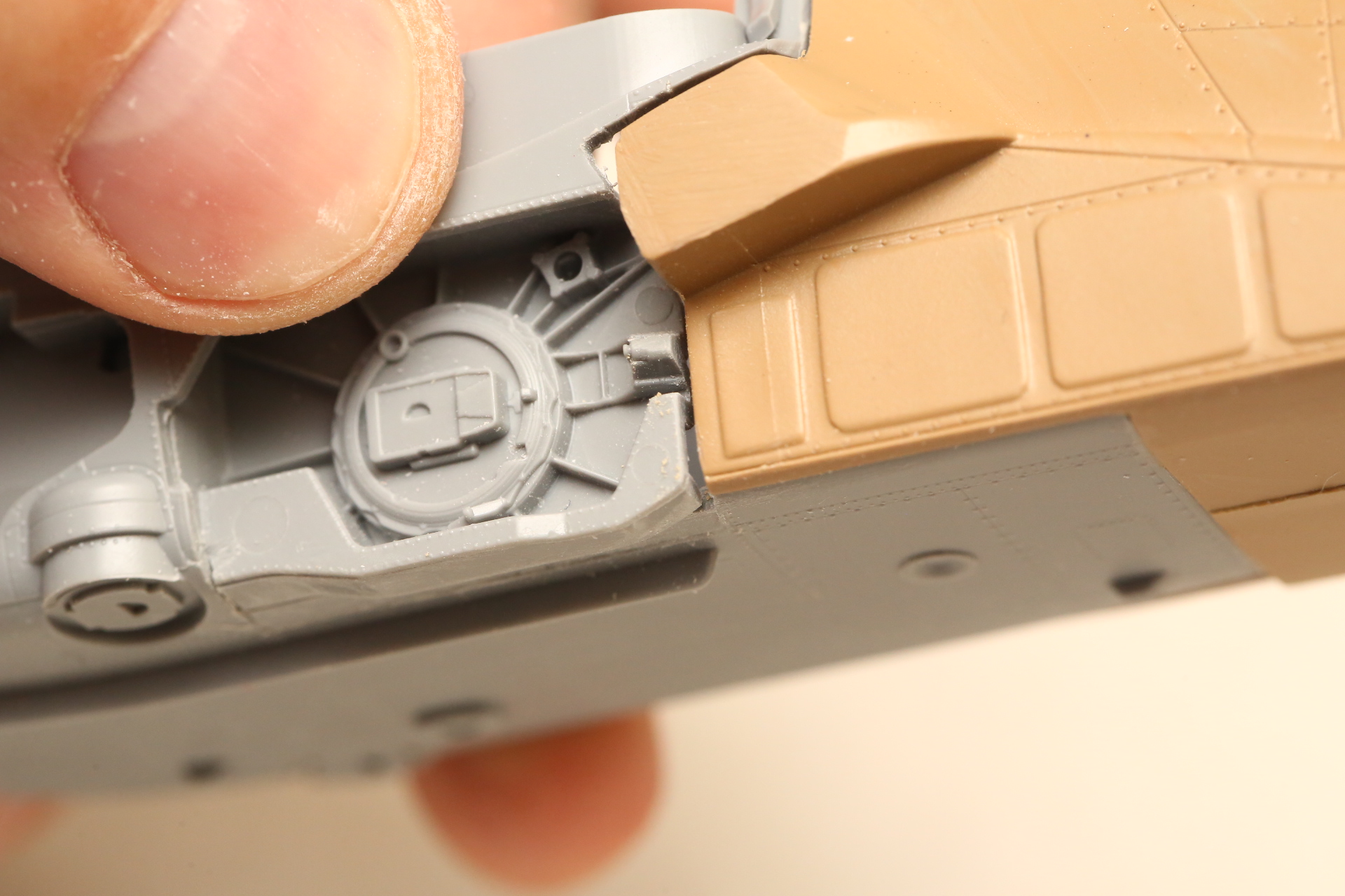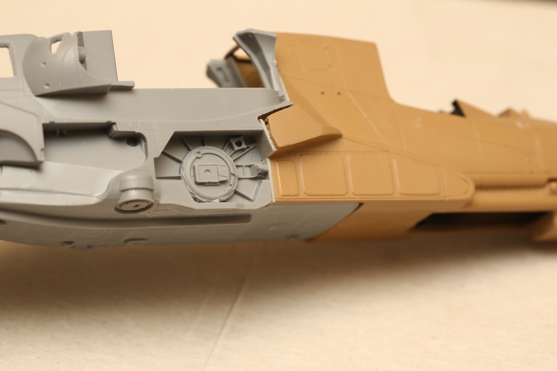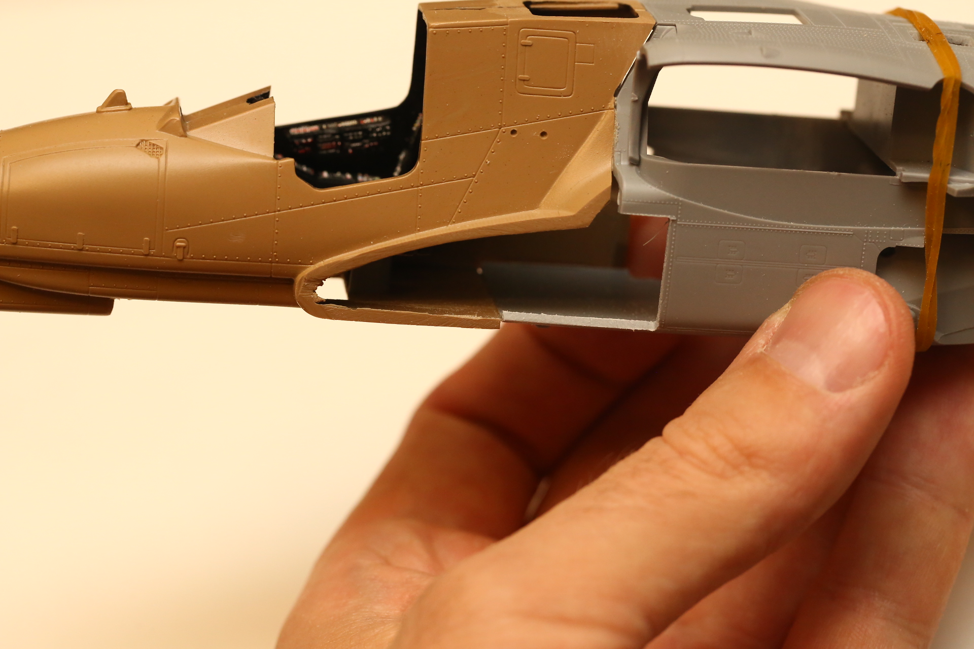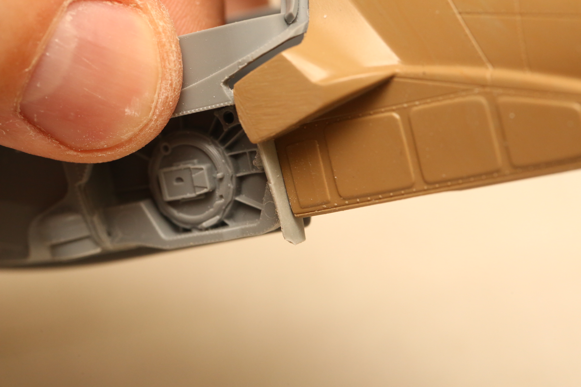 Нишу сточил, чтобы она была ближе к краю фюзеляжа, сходясь с носом Акулы. В щель нужно запихнуть пластик.