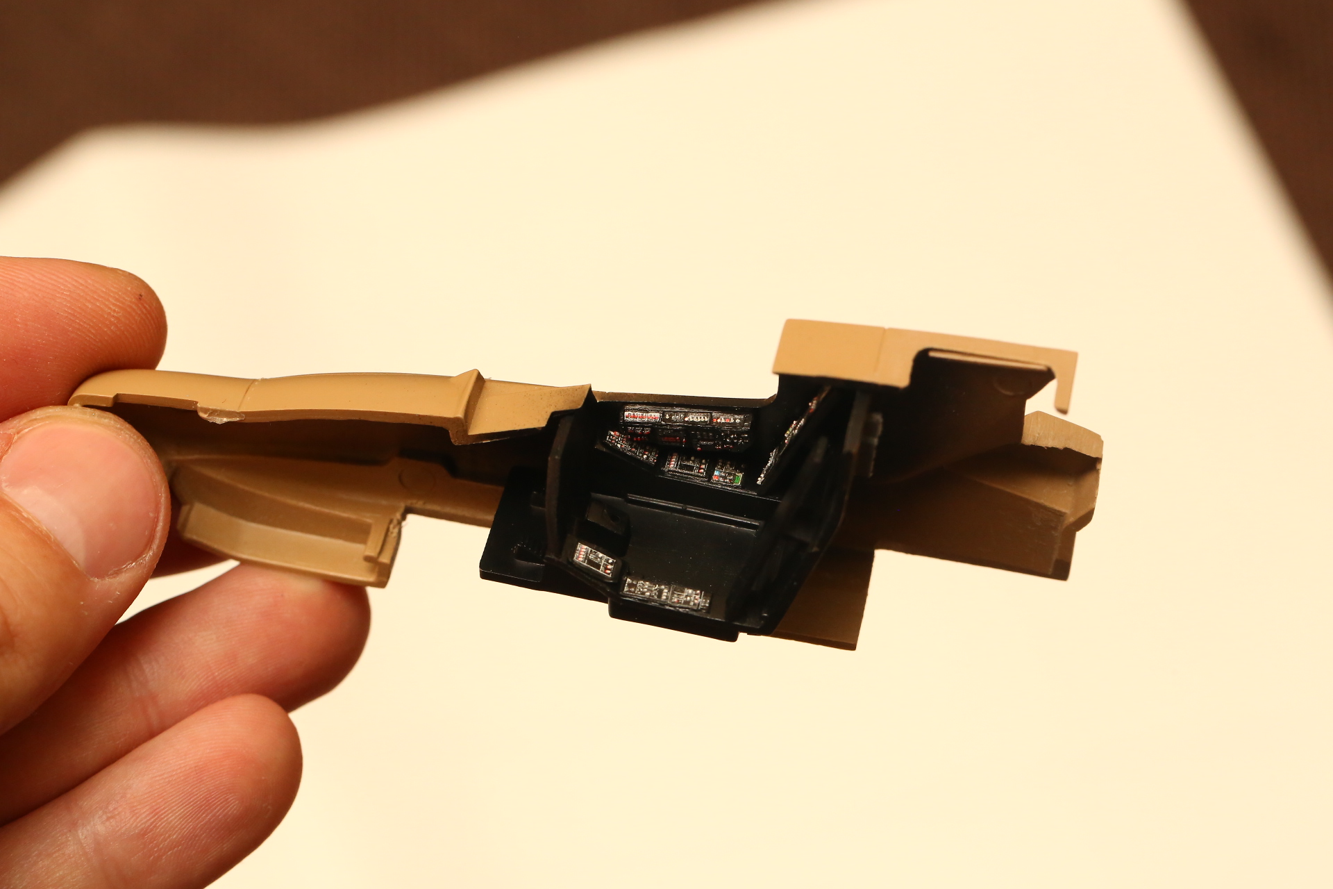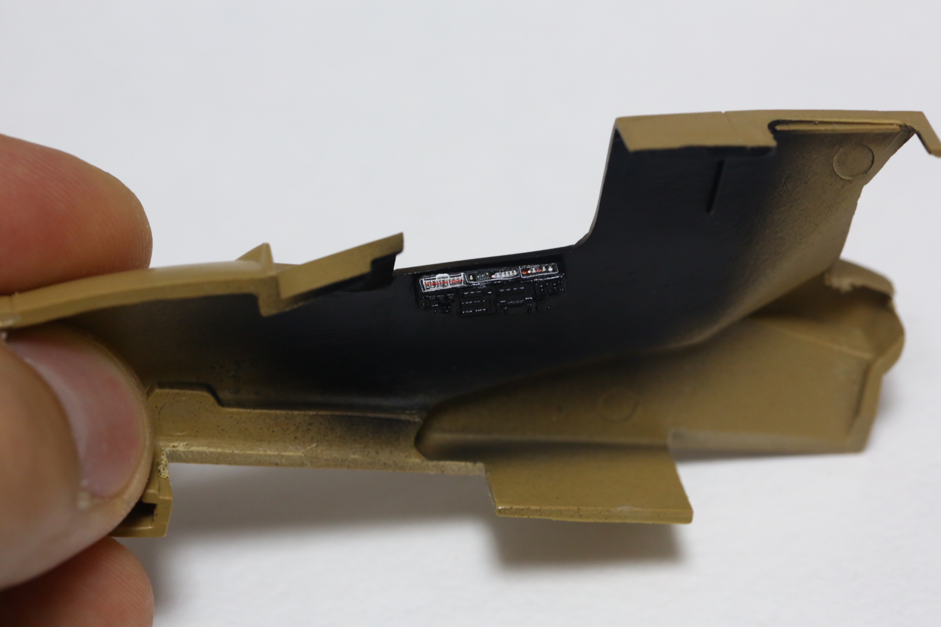 А как же основная панель приборов? Дело в том, что её ставить по любому, когда нос склеен. Там по другому её не приклеить ровно посередине. Ибо всё криво в наборе. Поставлю скоро обязательно.