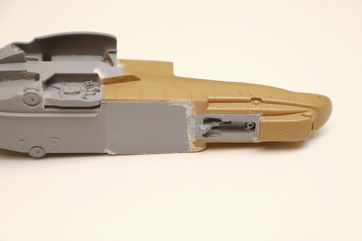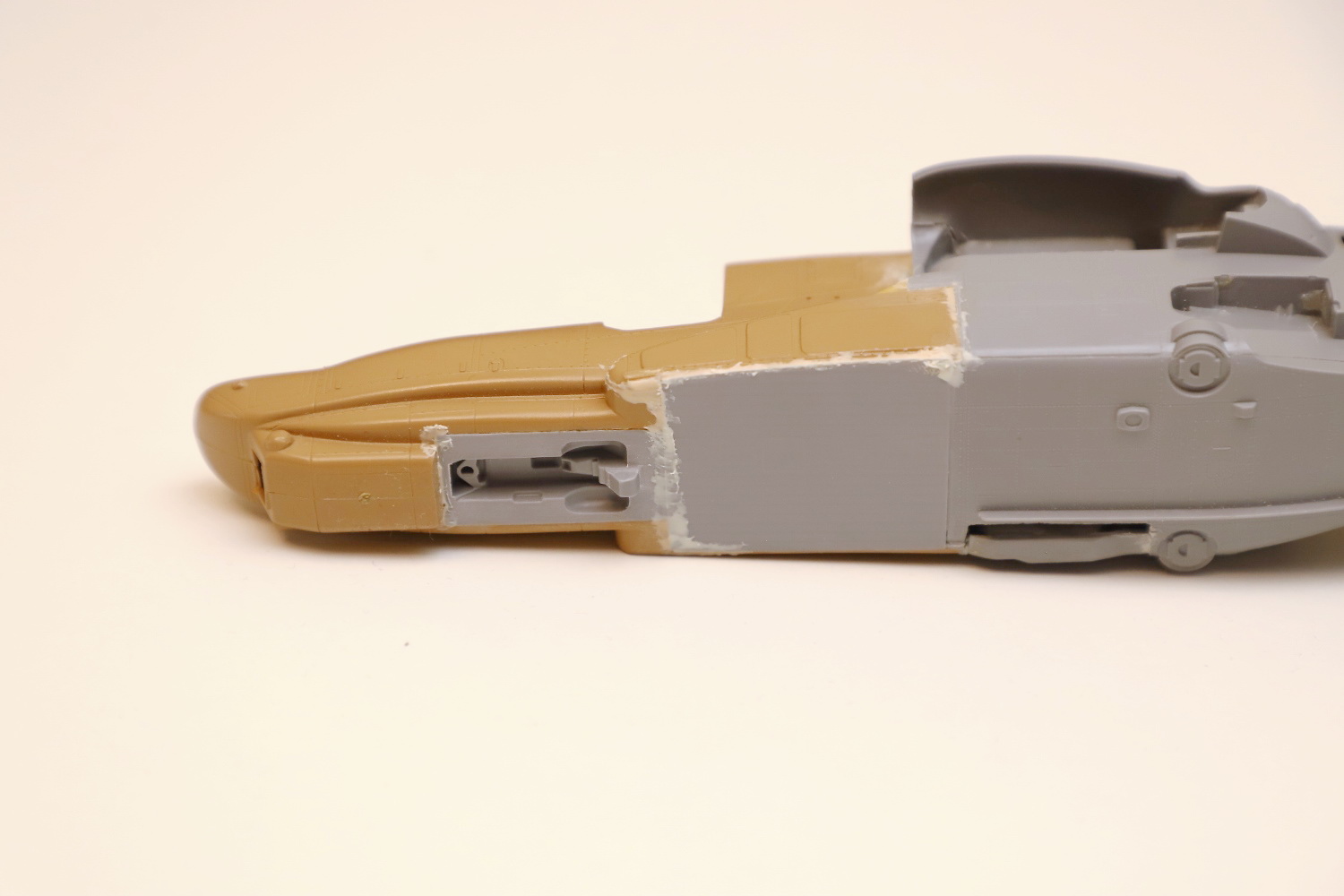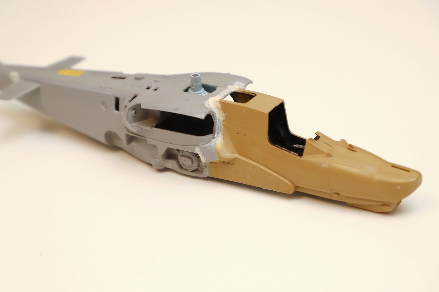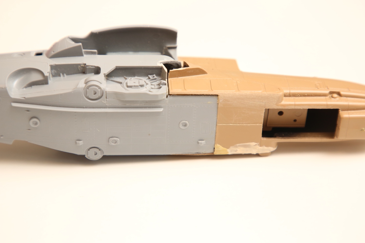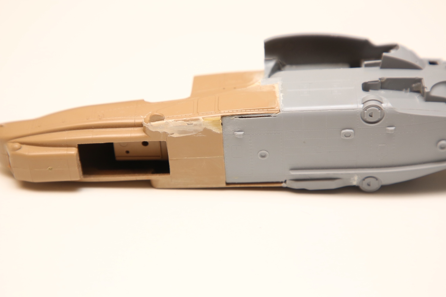 Всем привет! Продолжаю потихоньку свою историю. После отпила носа от основной части фюзеляжа снова были многократные примерки. Ради того, чтобы лучше глазом видеть, что получается, я даже налепил на вертолёт мотогондолы движков с крыльями, используя для соединения пластилин Blue tack. И поставил вертолёт на основные стойки шасси от Италери. Приклеил на каплю суперклея там, где отодрав их, не страшно оставить следы.