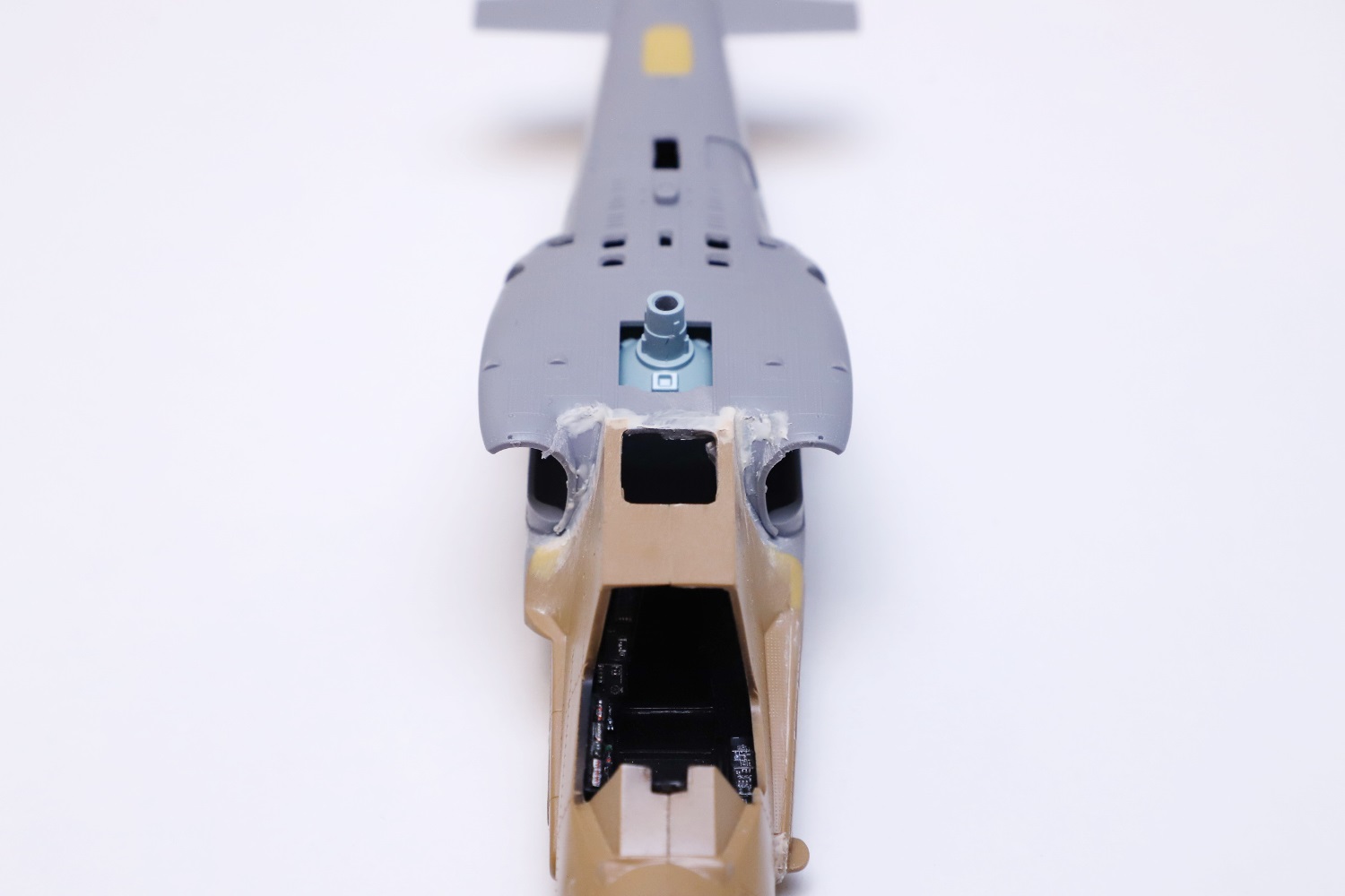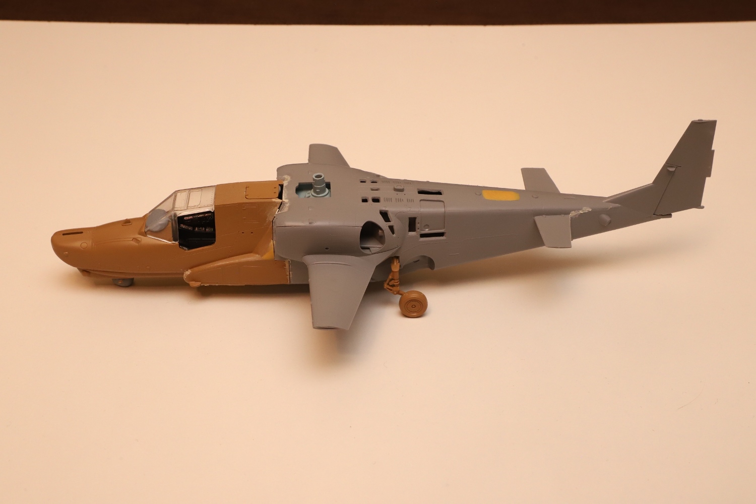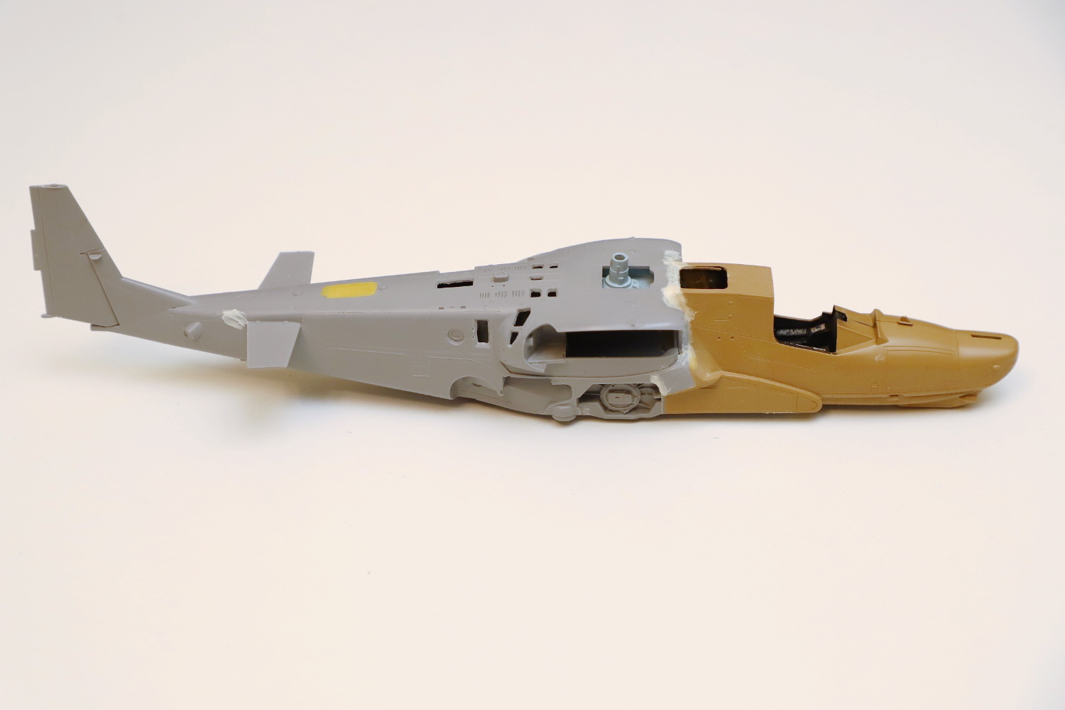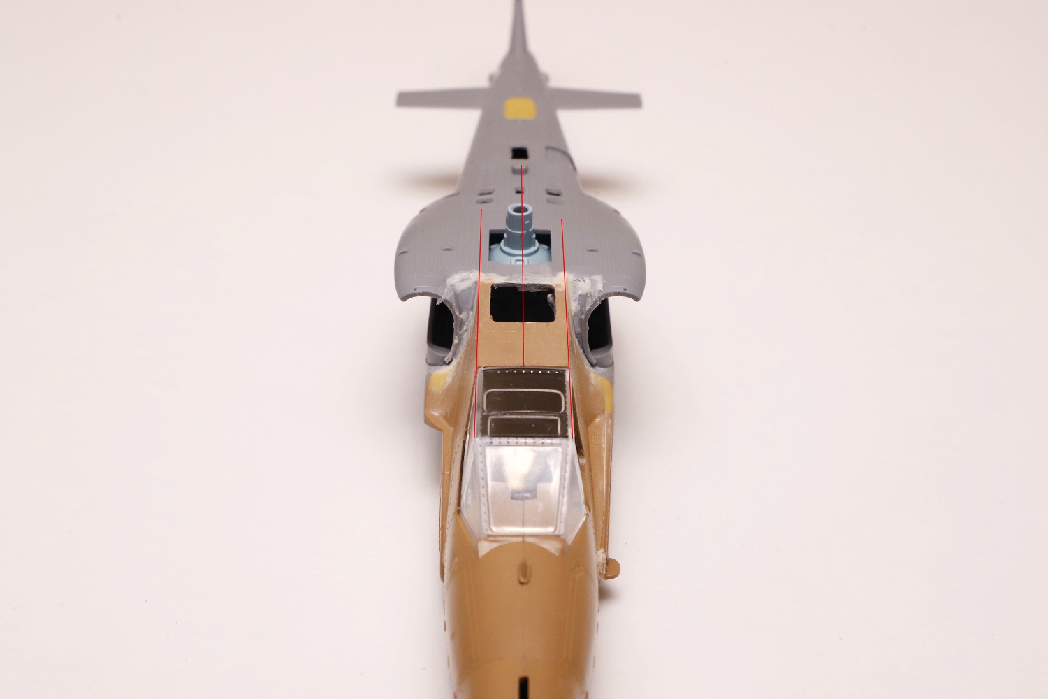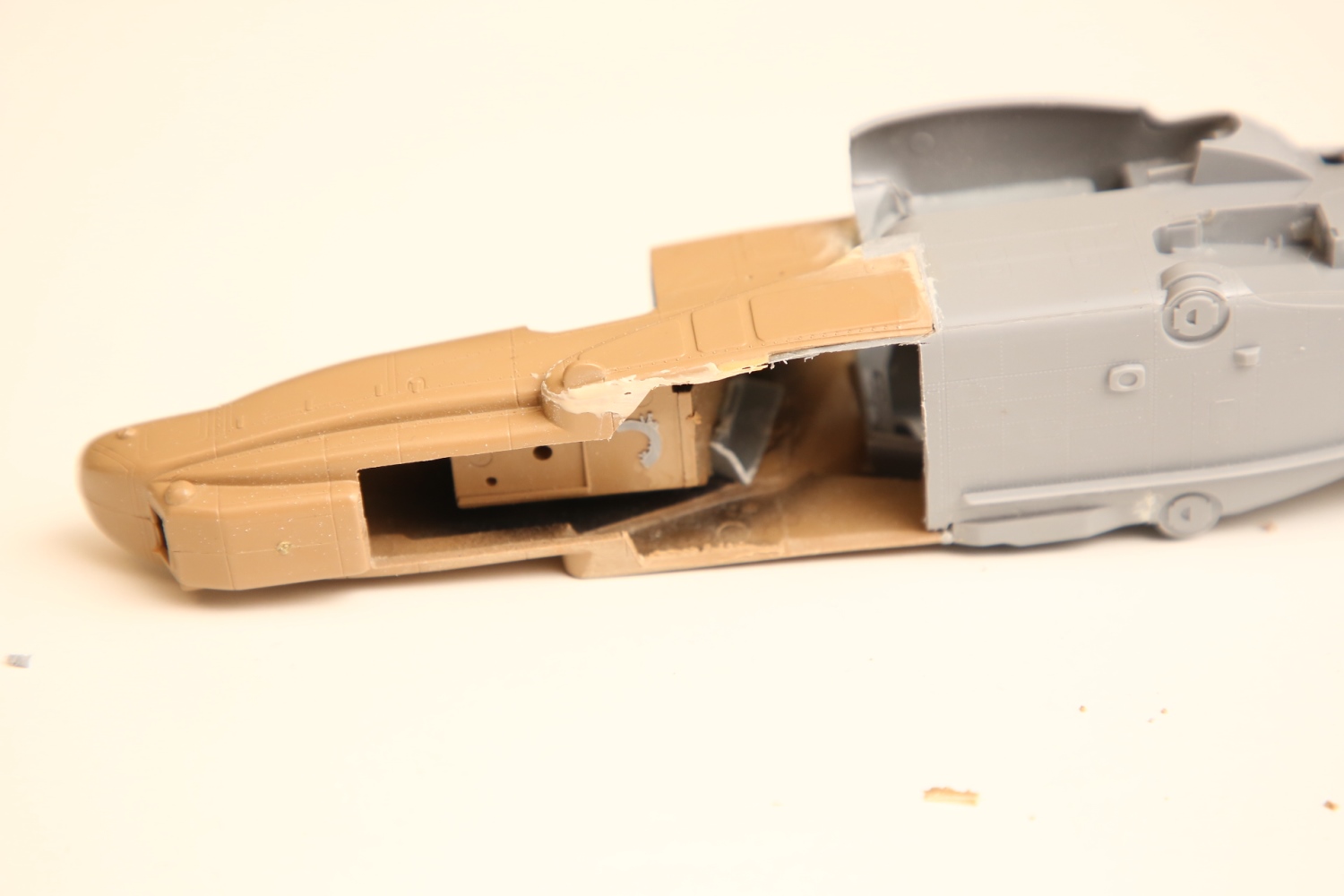Всем привет! Продолжаю потихоньку свою историю. После отпила носа от основной части фюзеляжа снова были многократные примерки. Ради того, чтобы лучше глазом видеть, что получается, я даже налепил на вертолёт мотогондолы движков с крыльями, используя для соединения пластилин Blue tack. И поставил вертолёт на основные стойки шасси от Италери. Приклеил на каплю суперклея там, где отодрав их, не страшно оставить следы.