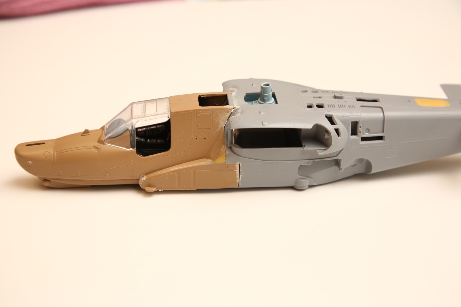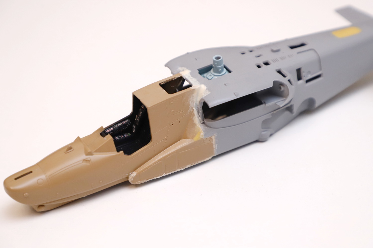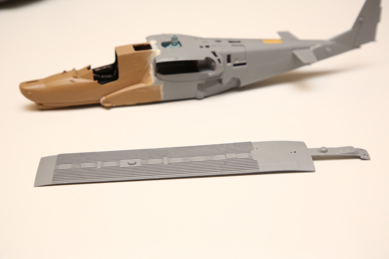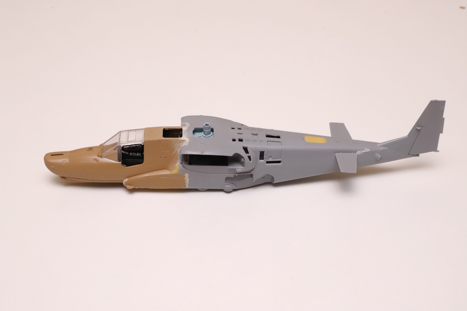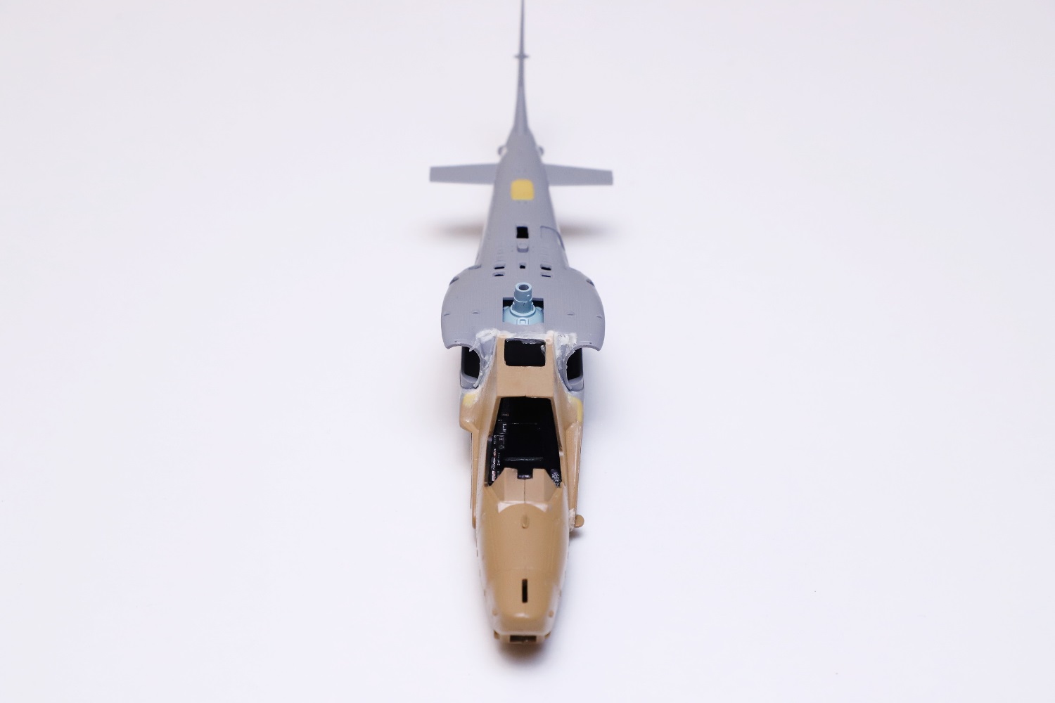 Всем привет! Продолжаю потихоньку свою историю. После отпила носа от основной части фюзеляжа снова были многократные примерки. Ради того, чтобы лучше глазом видеть, что получается, я даже налепил на вертолёт мотогондолы движков с крыльями, используя для соединения пластилин Blue tack. И поставил вертолёт на основные стойки шасси от Италери. Приклеил на каплю суперклея там, где отодрав их, не страшно оставить следы.