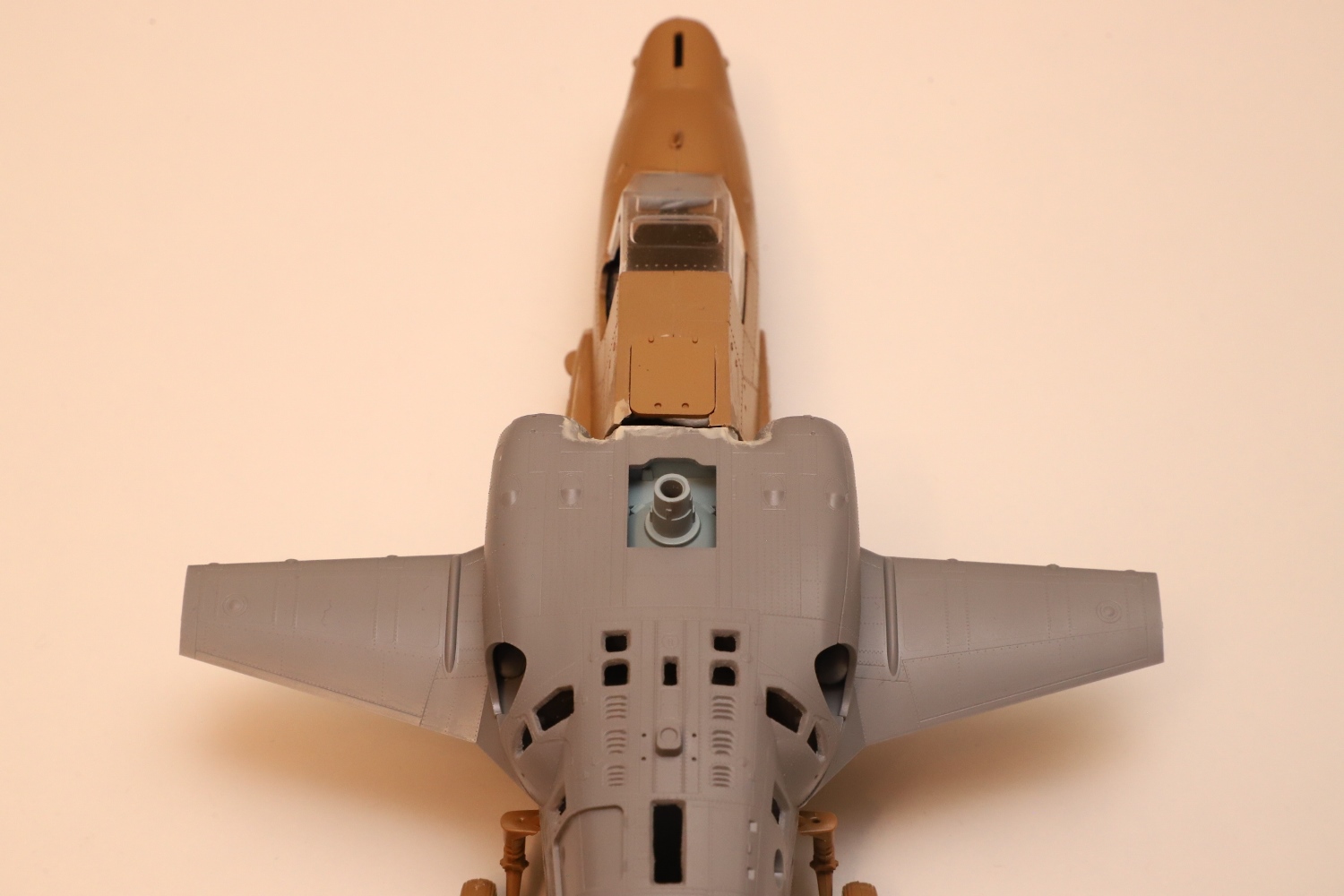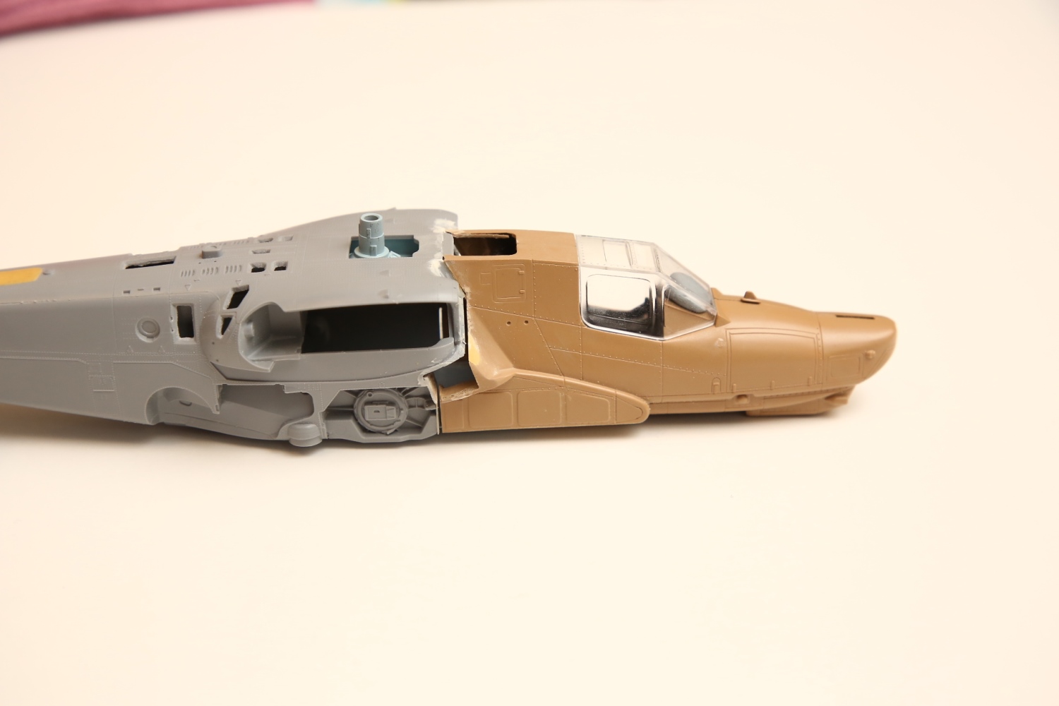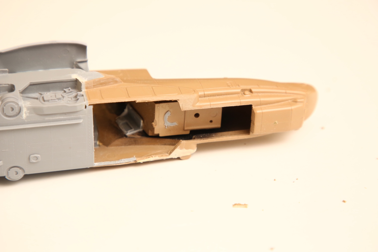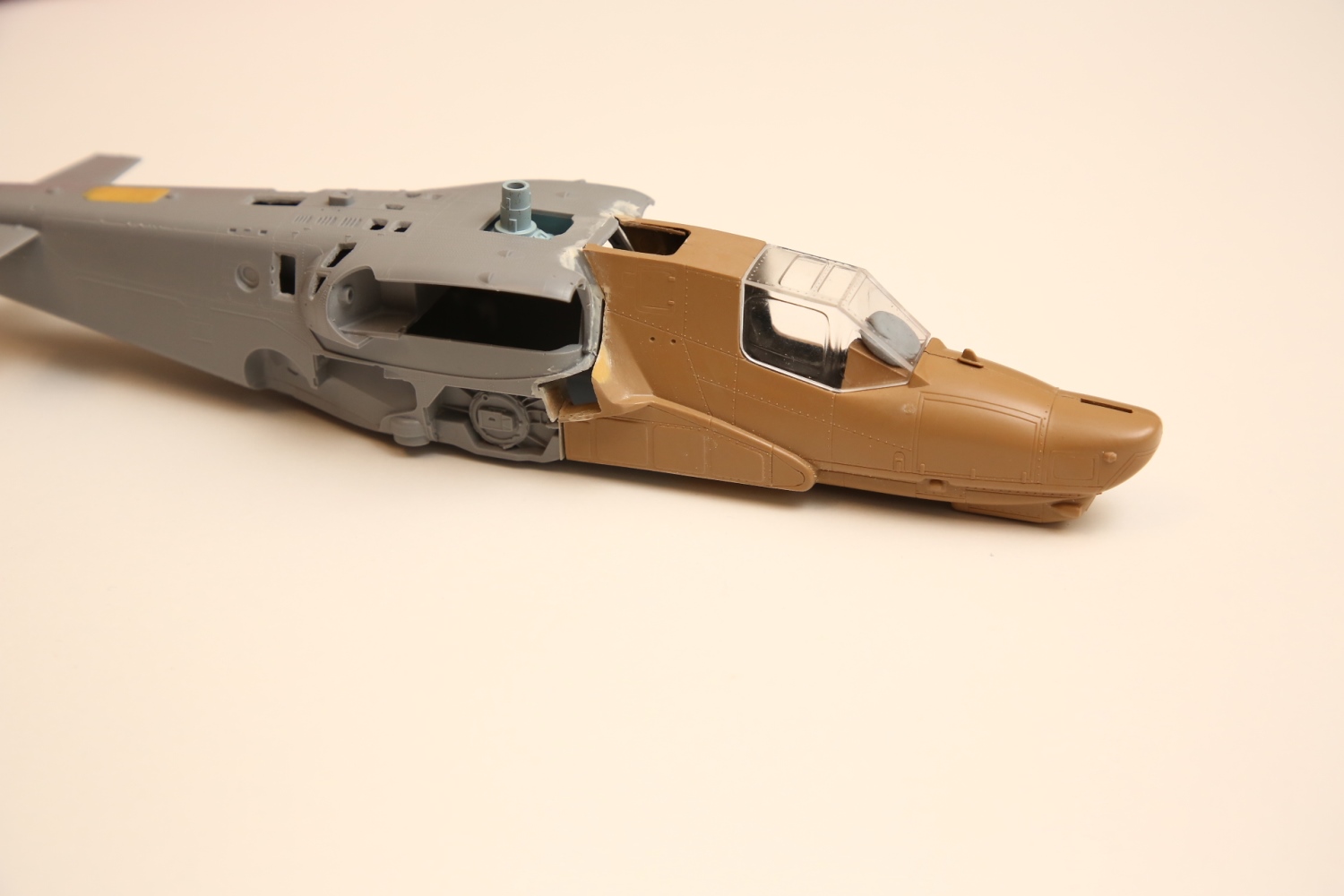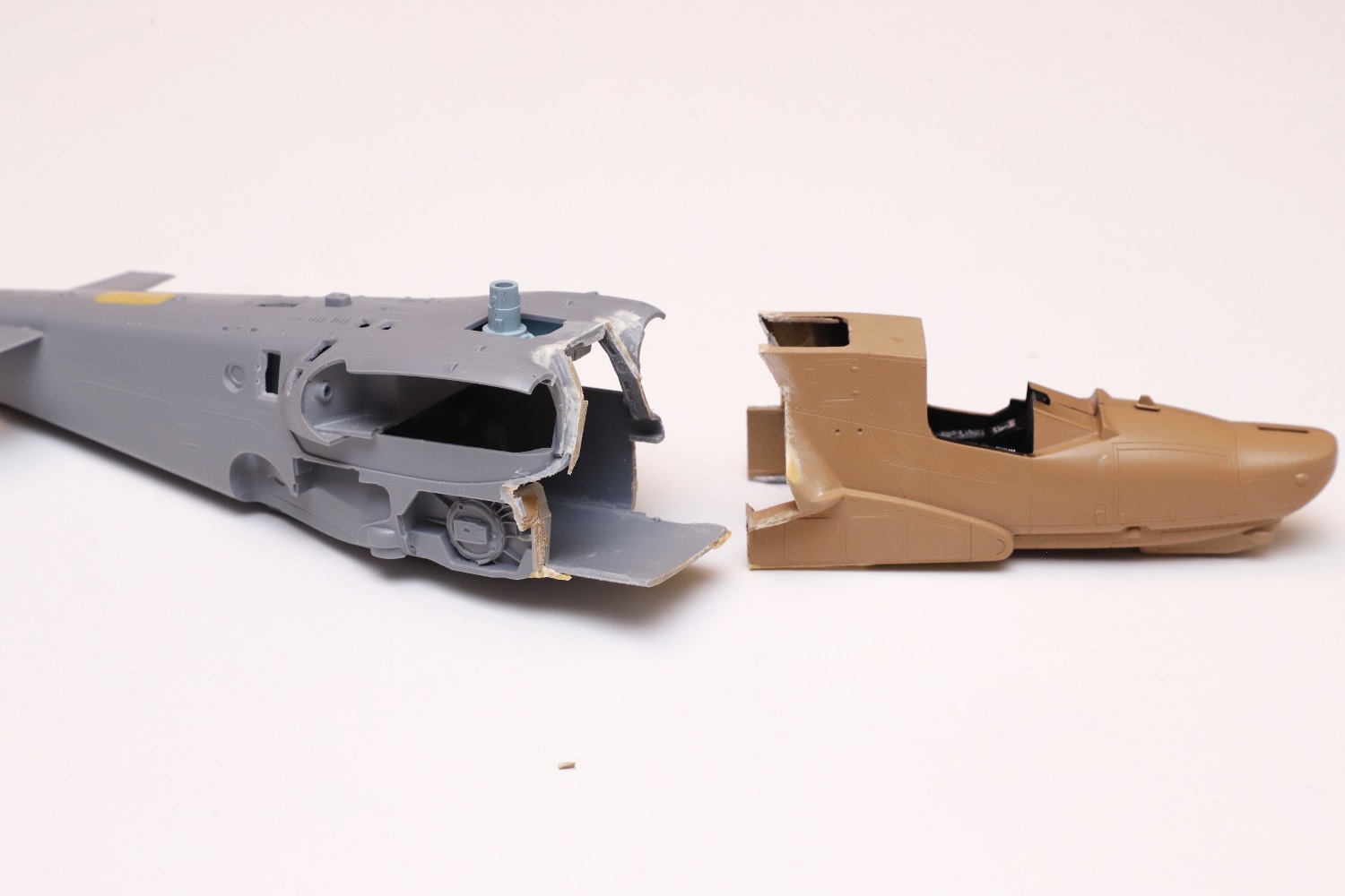 Всем привет! Продолжаю потихоньку свою историю. После отпила носа от основной части фюзеляжа снова были многократные примерки. Ради того, чтобы лучше глазом видеть, что получается, я даже налепил на вертолёт мотогондолы движков с крыльями, используя для соединения пластилин Blue tack. И поставил вертолёт на основные стойки шасси от Италери. Приклеил на каплю суперклея там, где отодрав их, не страшно оставить следы.