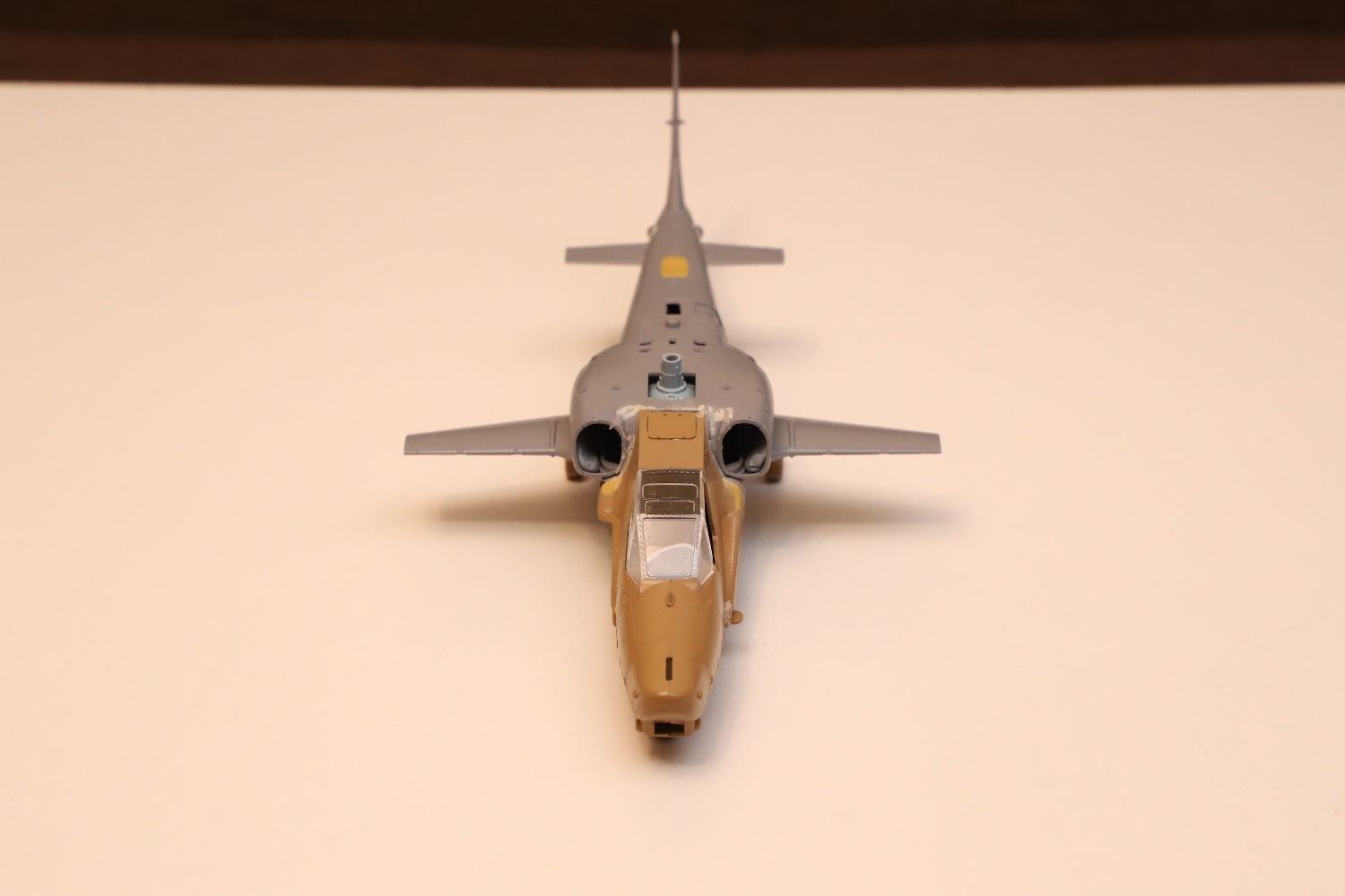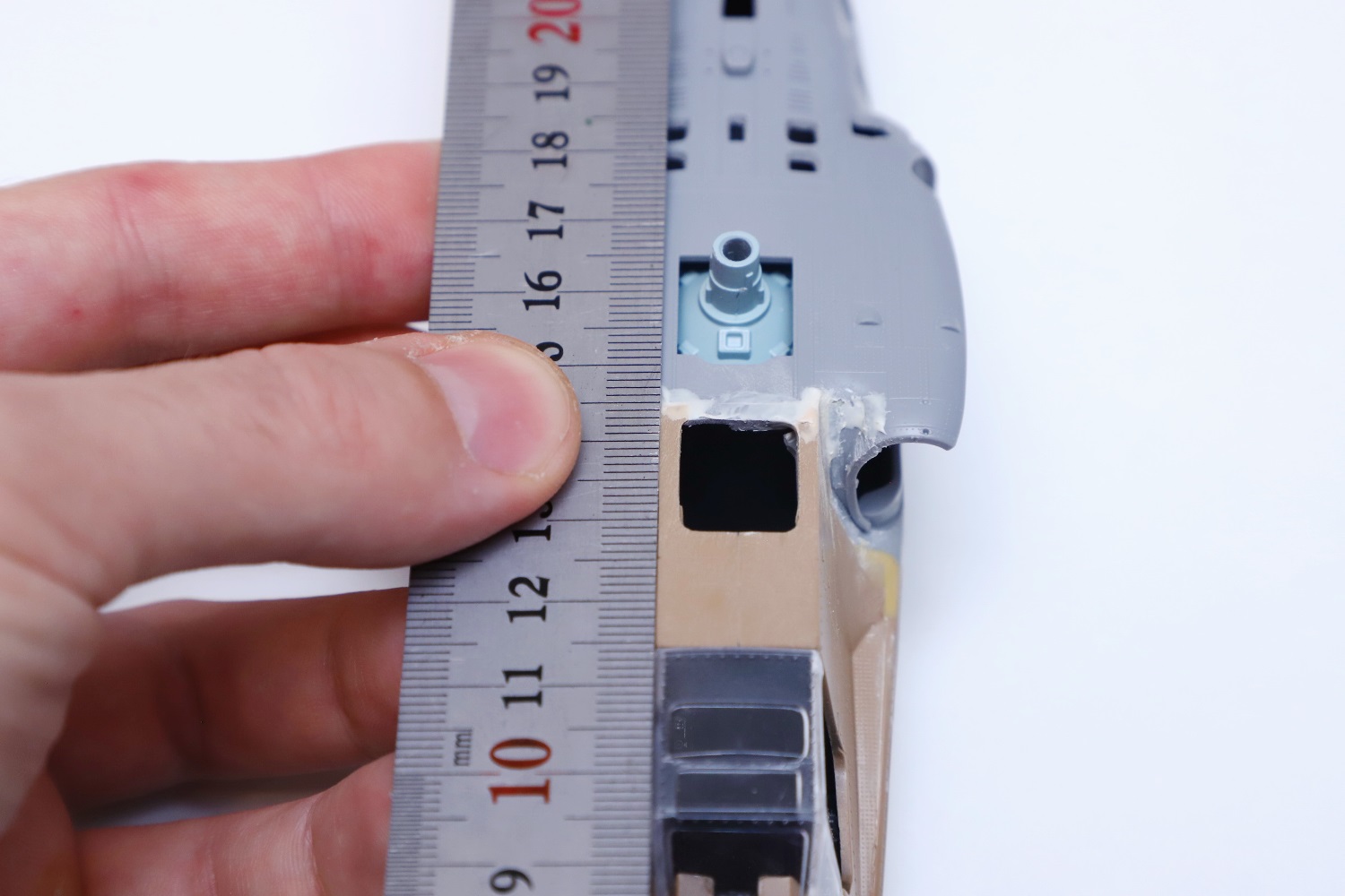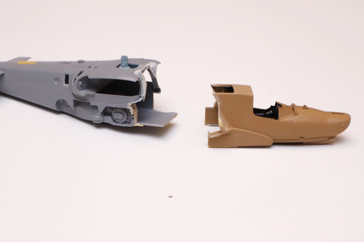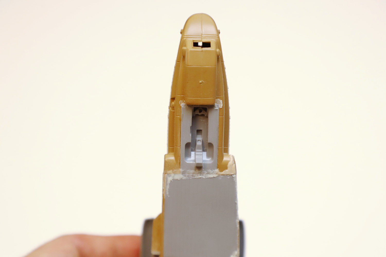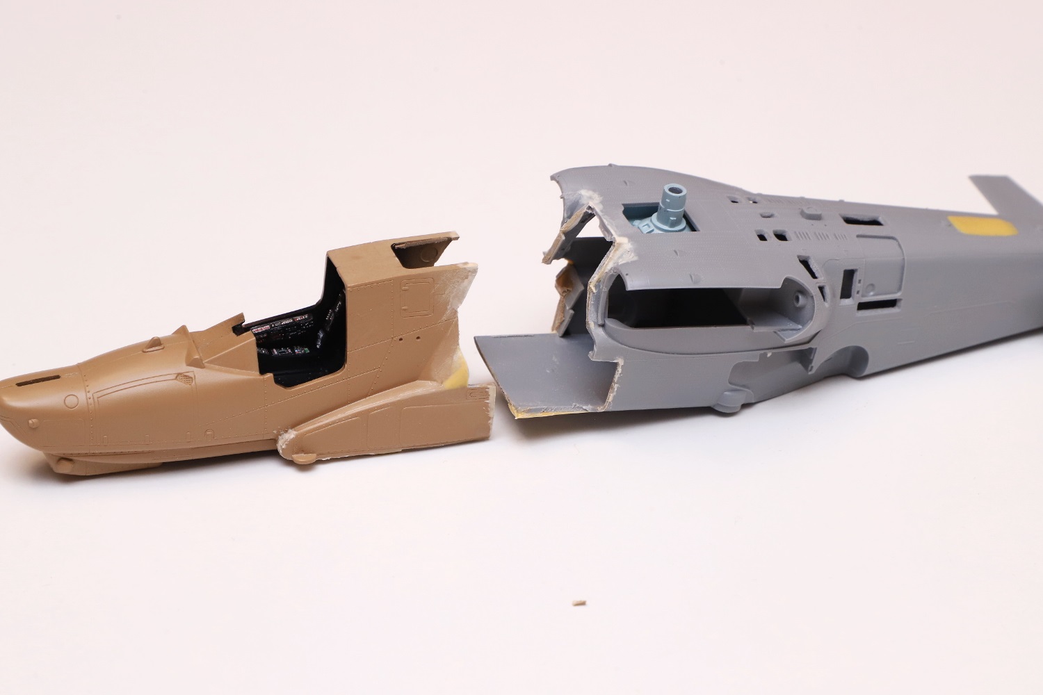 Всем привет! Продолжаю потихоньку свою историю. После отпила носа от основной части фюзеляжа снова были многократные примерки. Ради того, чтобы лучше глазом видеть, что получается, я даже налепил на вертолёт мотогондолы движков с крыльями, используя для соединения пластилин Blue tack. И поставил вертолёт на основные стойки шасси от Италери. Приклеил на каплю суперклея там, где отодрав их, не страшно оставить следы.