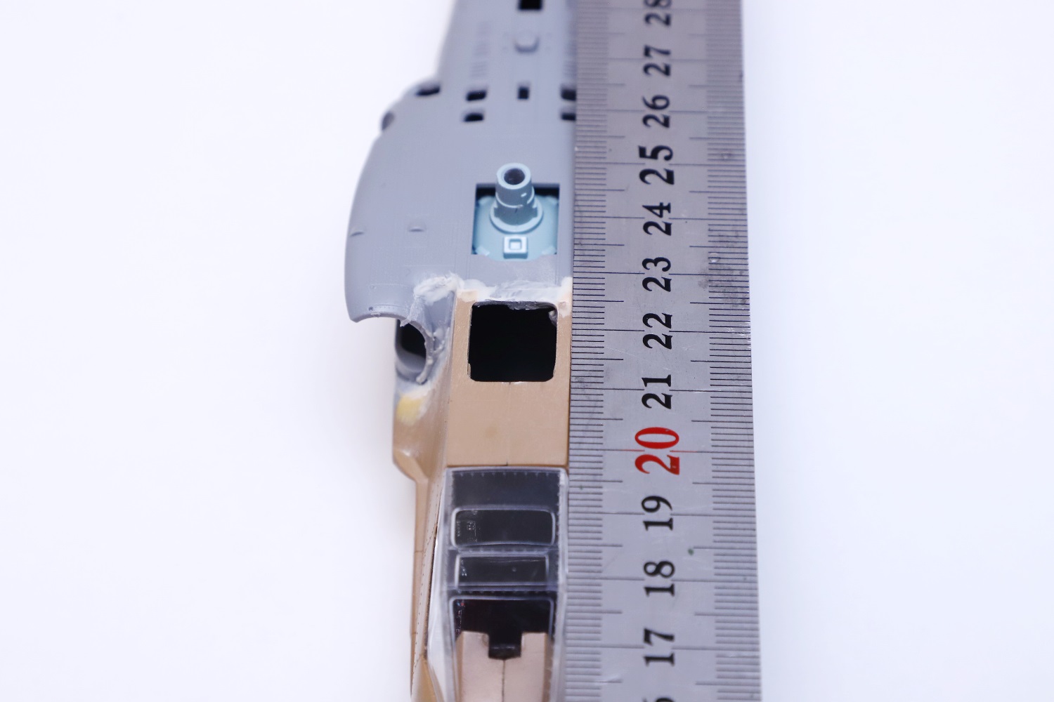 После того, как "спина" была на месте и я стал крутить модель в руках, в глаза бросилось по истине СТРАШНОЕ. Нос Акулы всё-таки стоит криво. Напомню, я долго примерял его и приклеил правильно только с 5-го раза. 4 раза я использовал буквально совсем немного клея, ждал пока он высохнет и начинал смотреть. Видел, что кривовато, отрезал и по новой. С 5-го раза всё получилось хорошо, но поставив "спину" на место, я с ужасом обнаружил, что нет. Увы. Даже когда я видел глазом, что всё хорошо, оказалось, что всё равно с косяком.