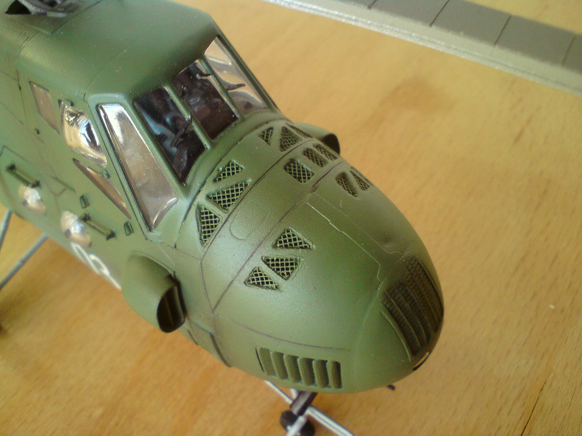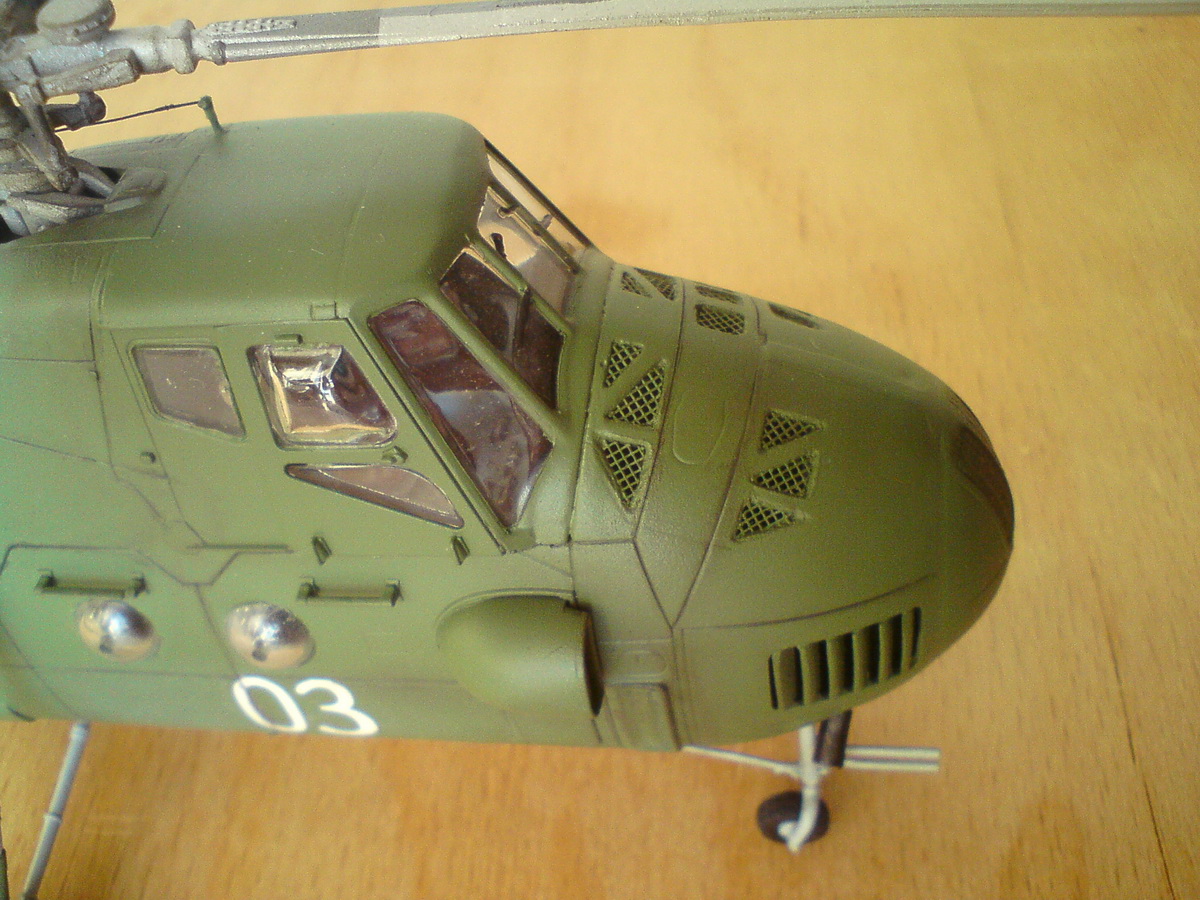 И вклеиваю переднюю нишу стойки шасси и вырезанный кусок пластика из Ми-26. В итоге на сегодняшний день вертолёт выглядит вот так: