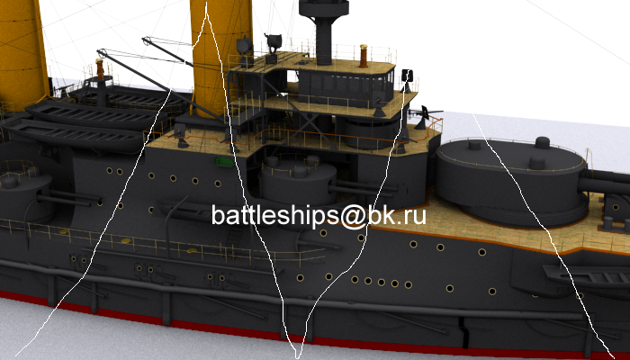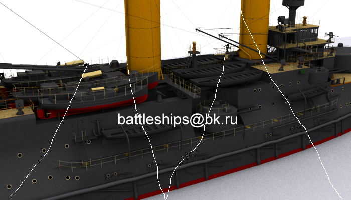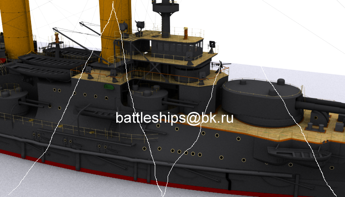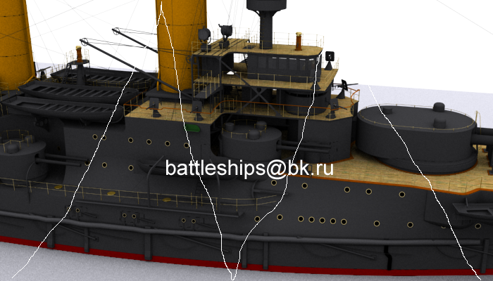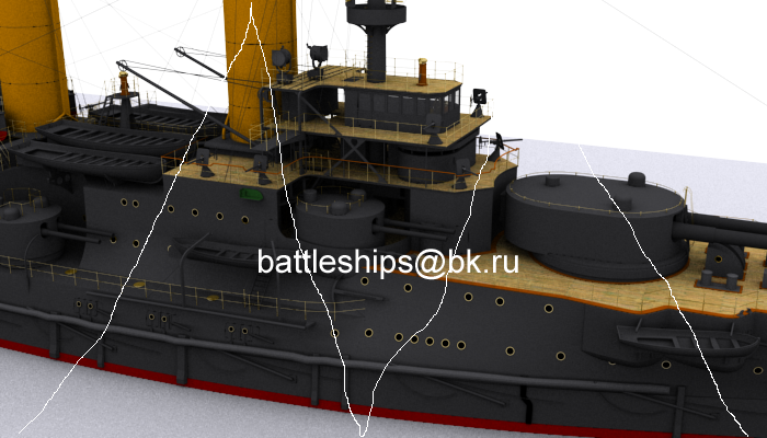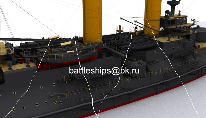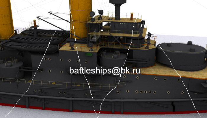 17. Кнехты. На приведенном мною в этом сообщении https://karopka.ru/forum/messages/forum223/topic33984/message1604122/#message1604122 чертеже, на корабле указана только одна пара кнехтов в носу. Если посмотрите на вид сверху моей модели - то пара кнехтов, параллельная диаметральной плоскости корабля, стоит в районе кормовой башни ГК на половине расстояния между бортом и барбетом башни и еще одна стоит перед фальшбортом носовых башен СК (это размещение можно проверить по этой фотографии). Полагаю, что последнюю пару установили уже после ввода броненосца в строй. Но это не точно.
