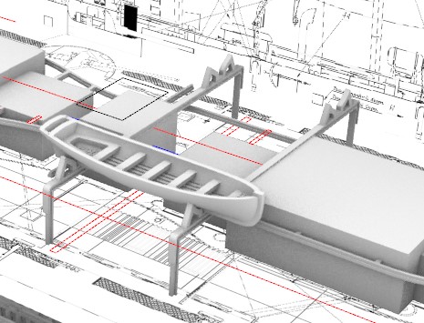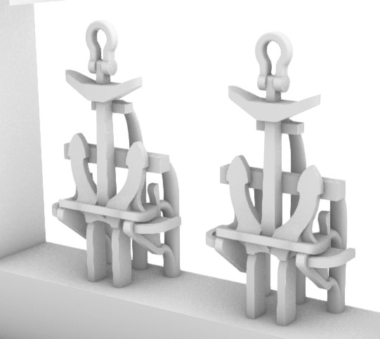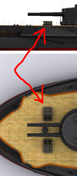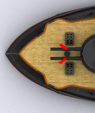Если посмотреть на этот план установки орудий сверху, то можно заметить что кромка щита лежит на уровне линии леерных стоек. При таком размещении - поворот орудия не возможен. Особенно, если там перила. Орудия все надо сдвигать на примерно 300 миллиметров внутрь мостика - только при этом будет возможно их горизонтальное наведение.
