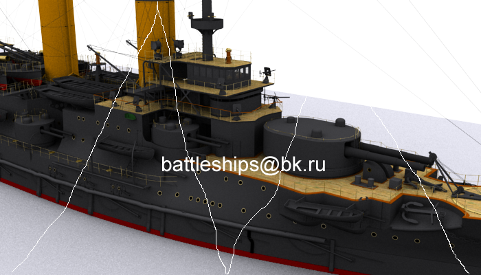 Я заменил ортогональные виды модели сбоку и сверху с палубным покрытием кормового балкона, и с кантами вокруг шпилей, башен, светлых люков. Это никак не влияет на расположение и форму объектов на модели, о чём, собственно я докладываю, но пусть будет. Заодно слегка затемнил противоторпендые сети, чуть темнее выглядит лучше. Так, что скачайте заново визуализацию модели.