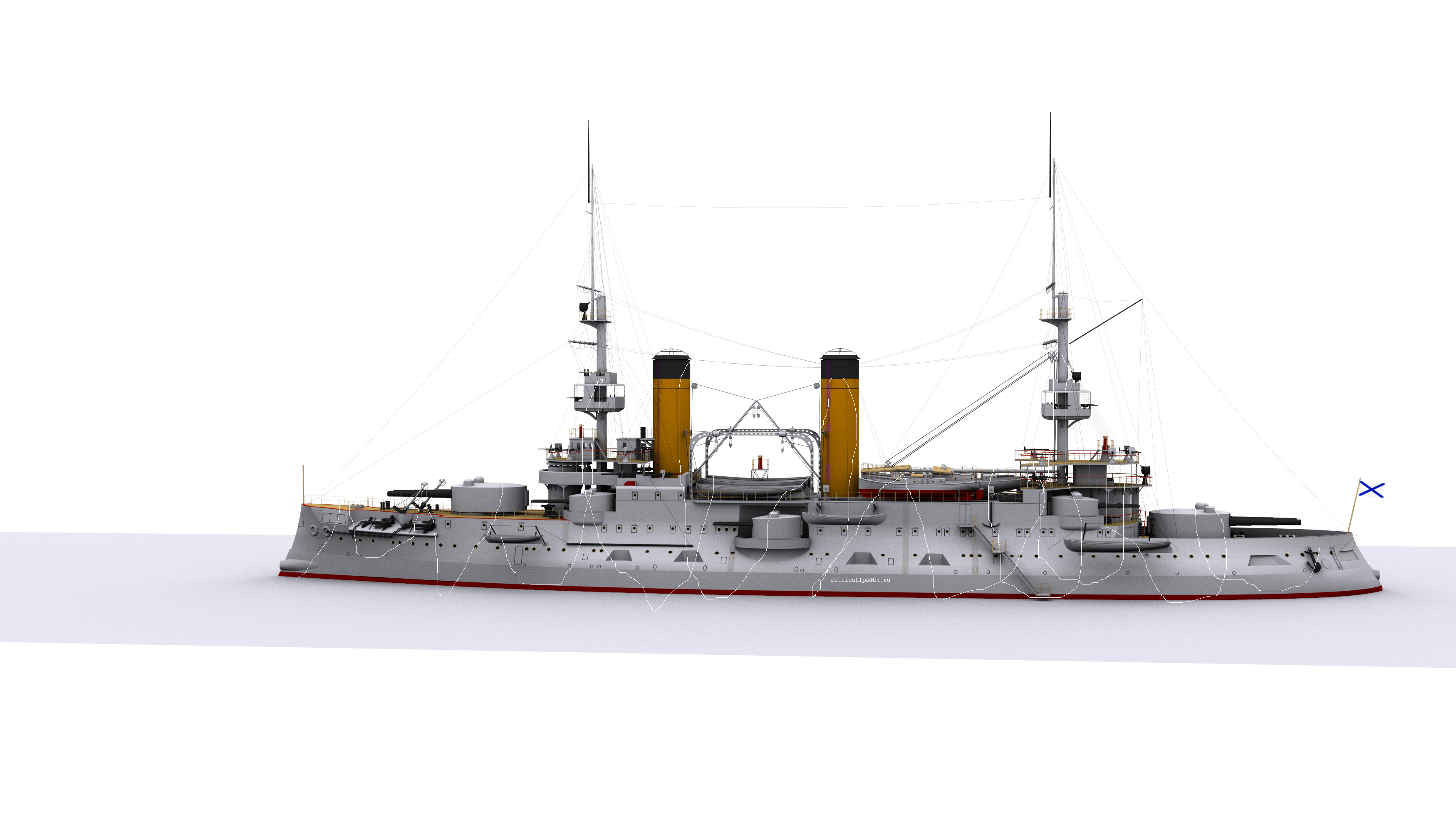 Видео броненосца "Император Александр III". Сейчас поставил визуализироваться пролет камеры ровно сверху. Потом постараюсь сделать видео "прогулки" по палубе и мостикам броненосца.