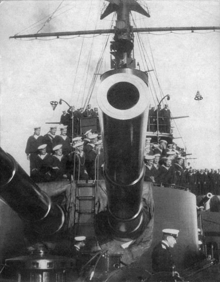 Та же история была на броненосце "Цесаревич". Только было изменено расположение этой пары орудий. Они стояли также без щитов на крыльях верхнего кормового мостика.