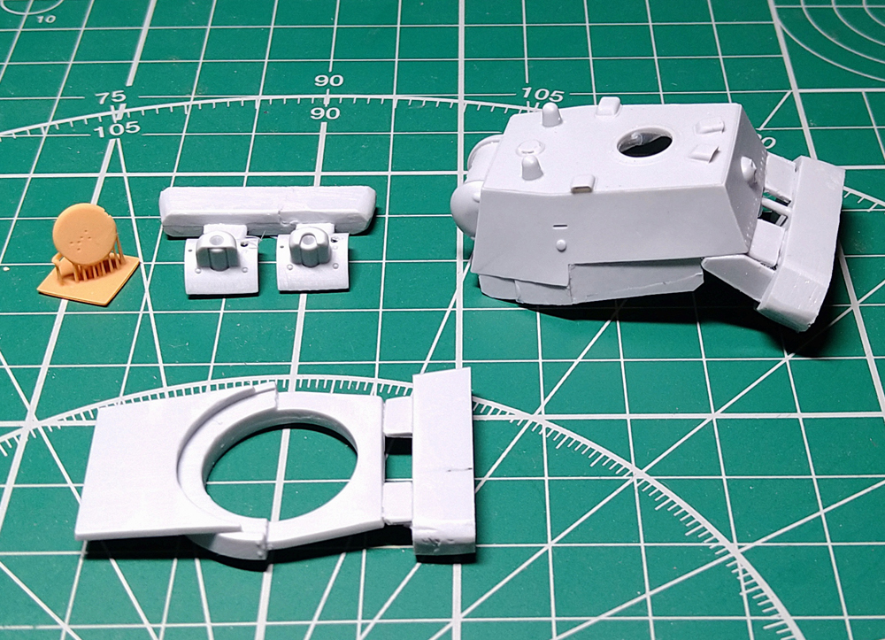 Очередное продвижение. Зашлифовал начерно переднюю часть бронекорпуса. Теперь осталось нарезать правильные стыки бронелистов. Смоляная башня подвела. Боковые плоскости после сборки втянуло внутрь. Придется использовать родную башню и смоляную маску.