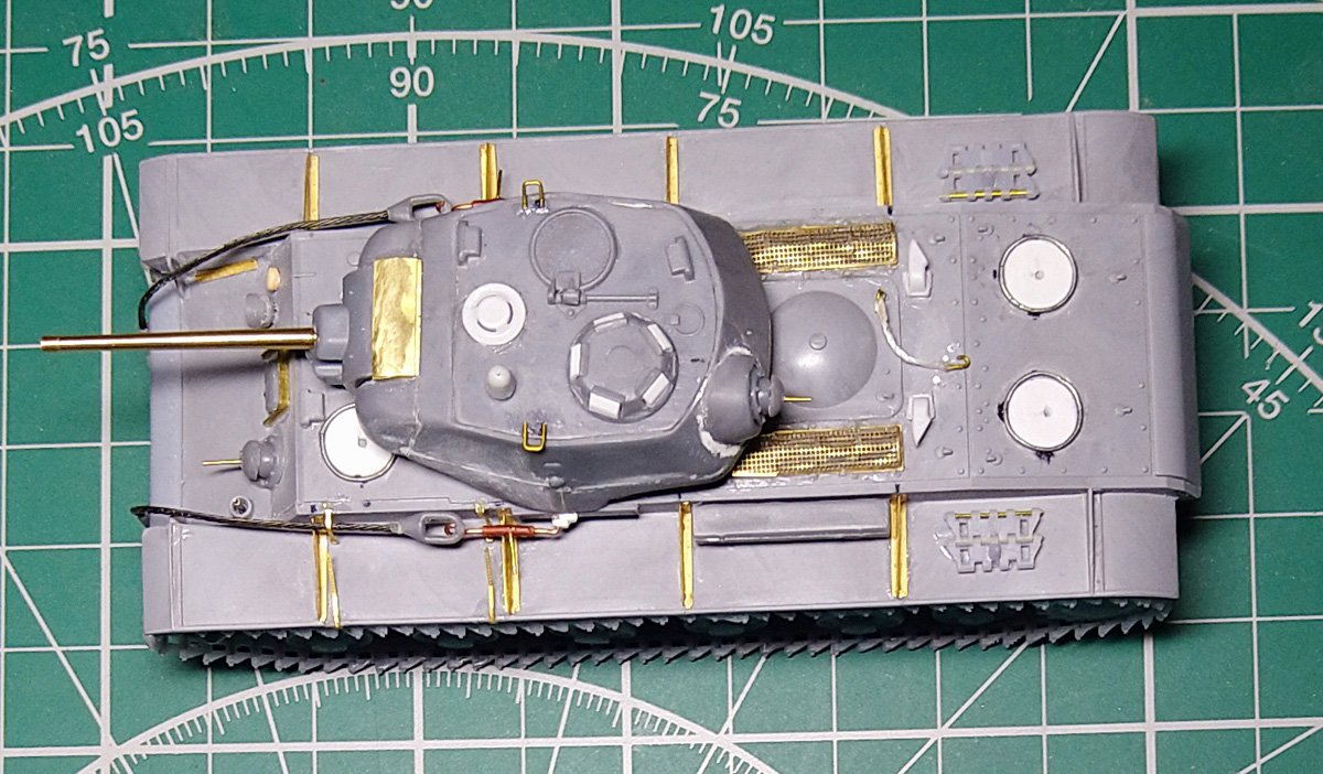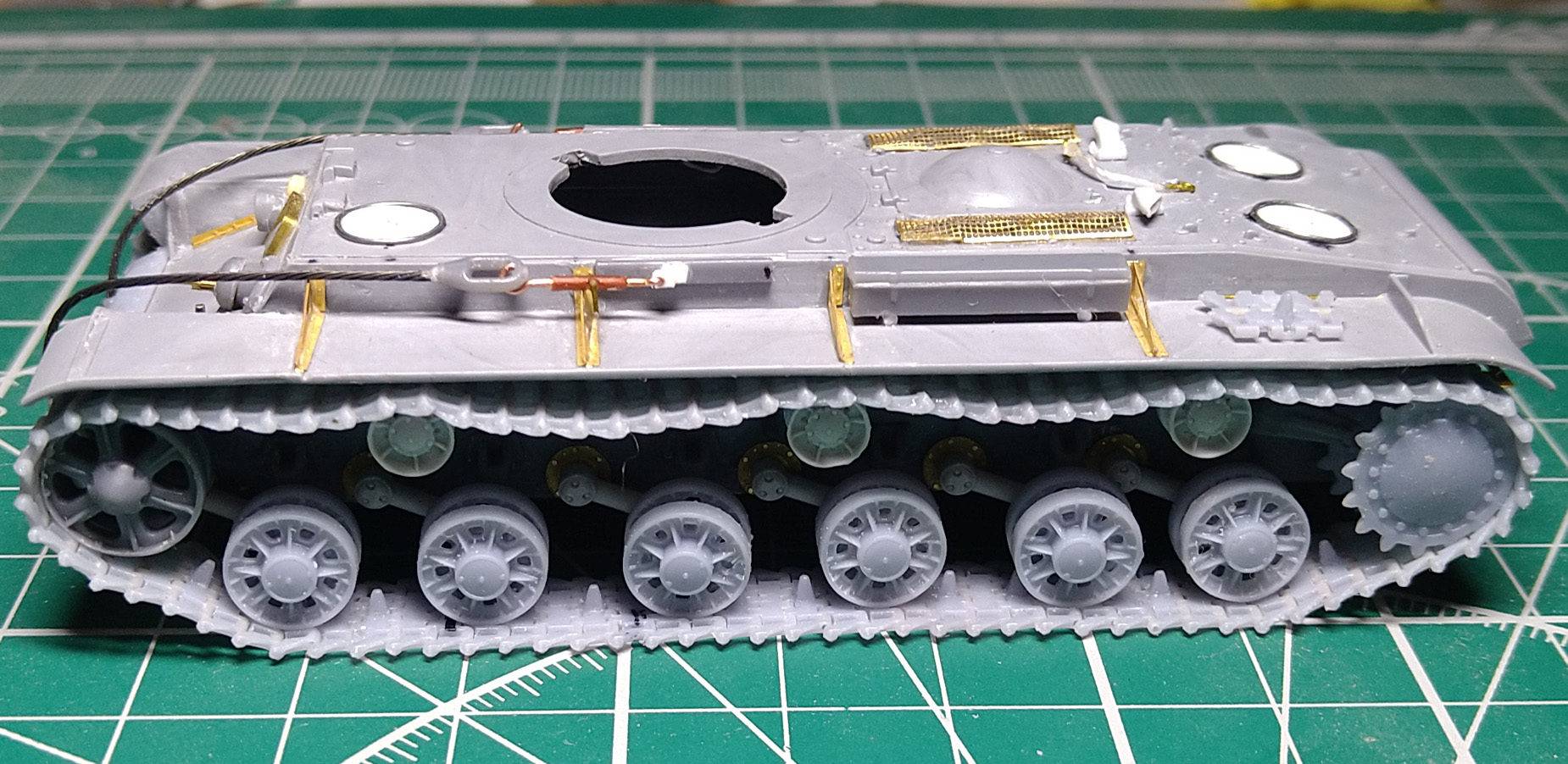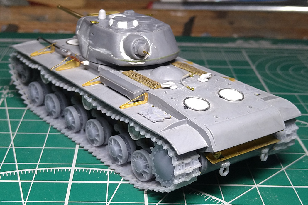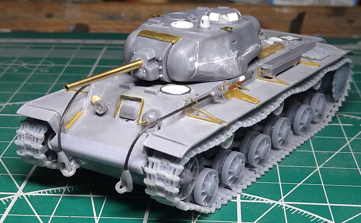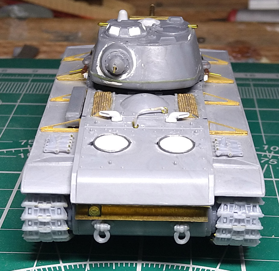 Заменил ресничку на лобовом листе. При внимательном изучении фото пришел к выводу, что ранее сделал ресничку, которая была у поздних серий. У ранних КВ-1с была "п"- образная. Склеил половинки корпуса. Наклеил травленые решетки на надмоторном листе. Результат понравился, буду делать такие же на КВ 1940 и 1942 гг.