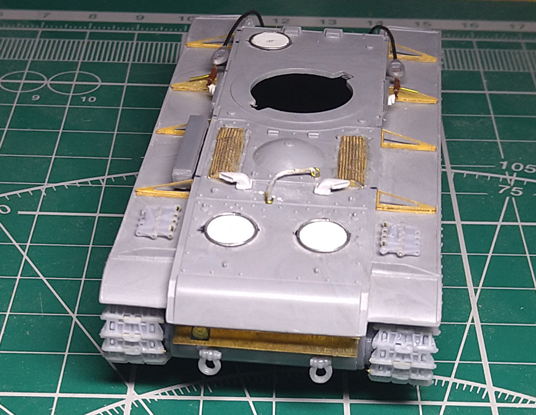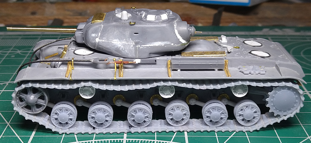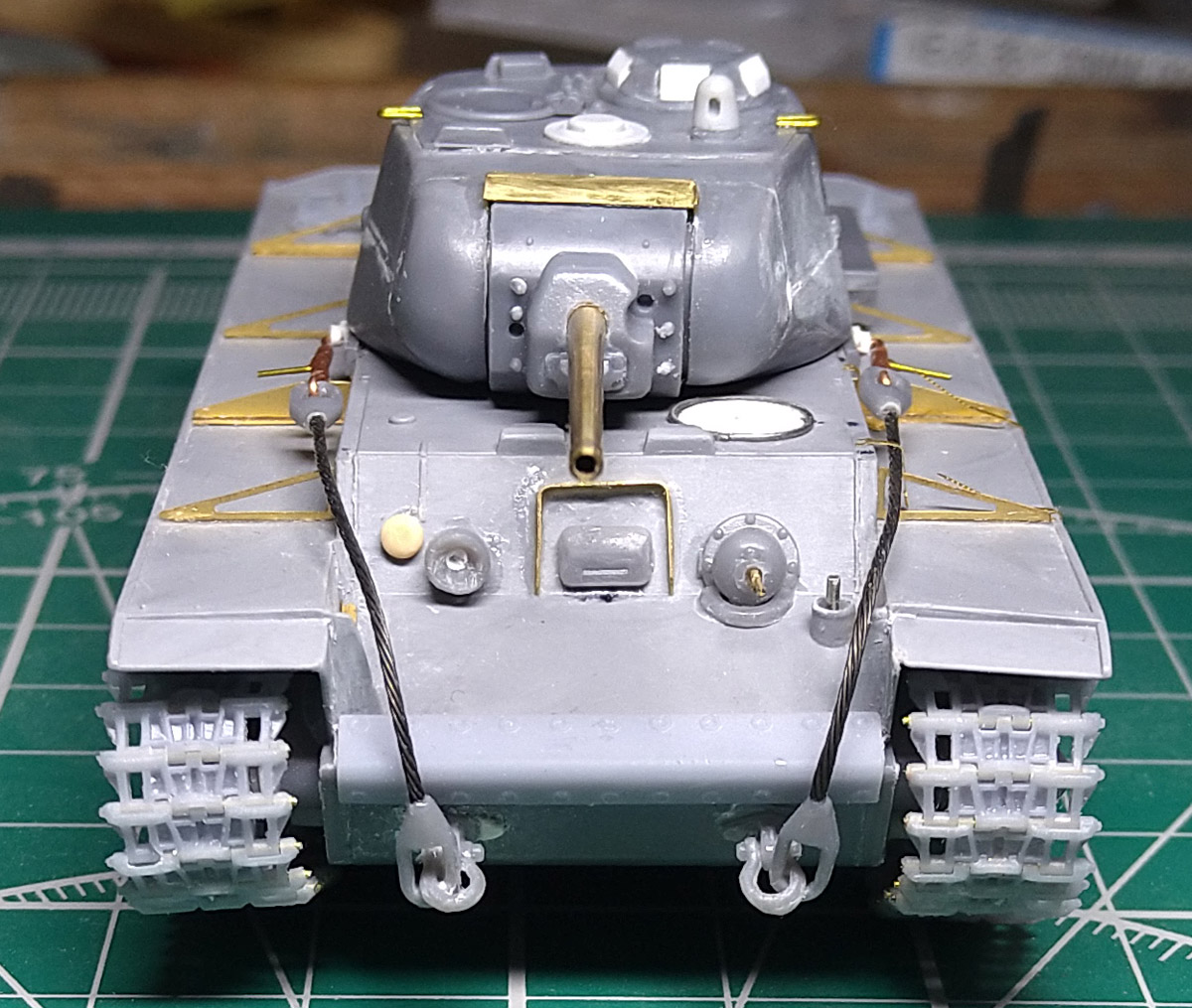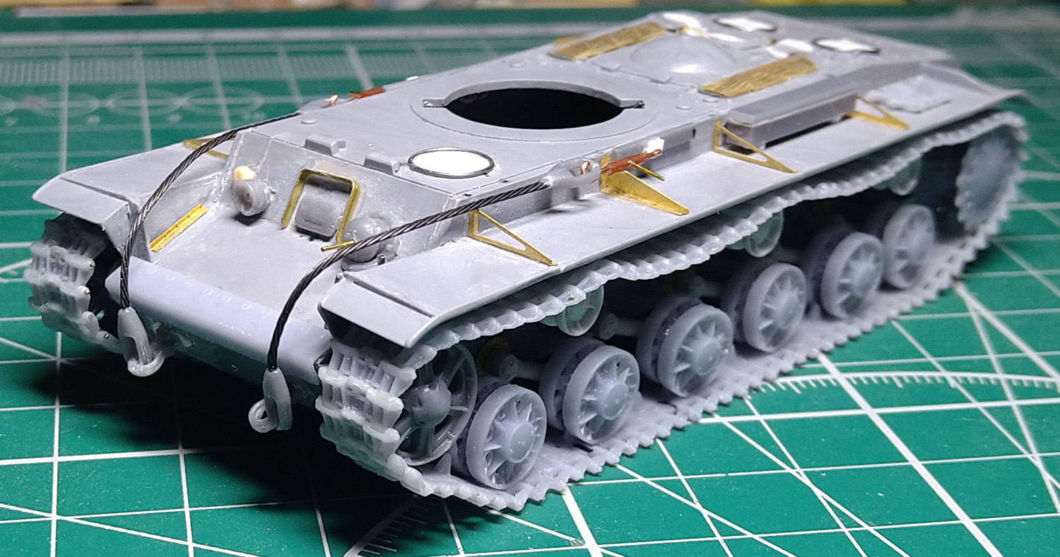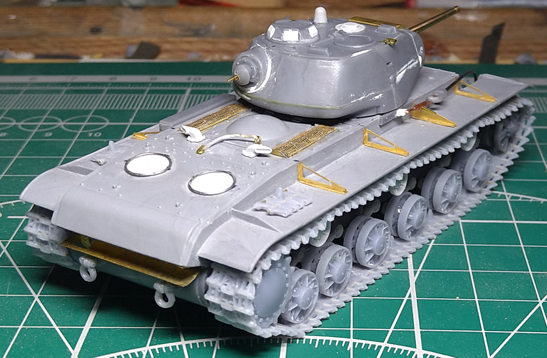 Заменил ресничку на лобовом листе. При внимательном изучении фото пришел к выводу, что ранее сделал ресничку, которая была у поздних серий. У ранних КВ-1с была "п"- образная. Склеил половинки корпуса. Наклеил травленые решетки на надмоторном листе. Результат понравился, буду делать такие же на КВ 1940 и 1942 гг.