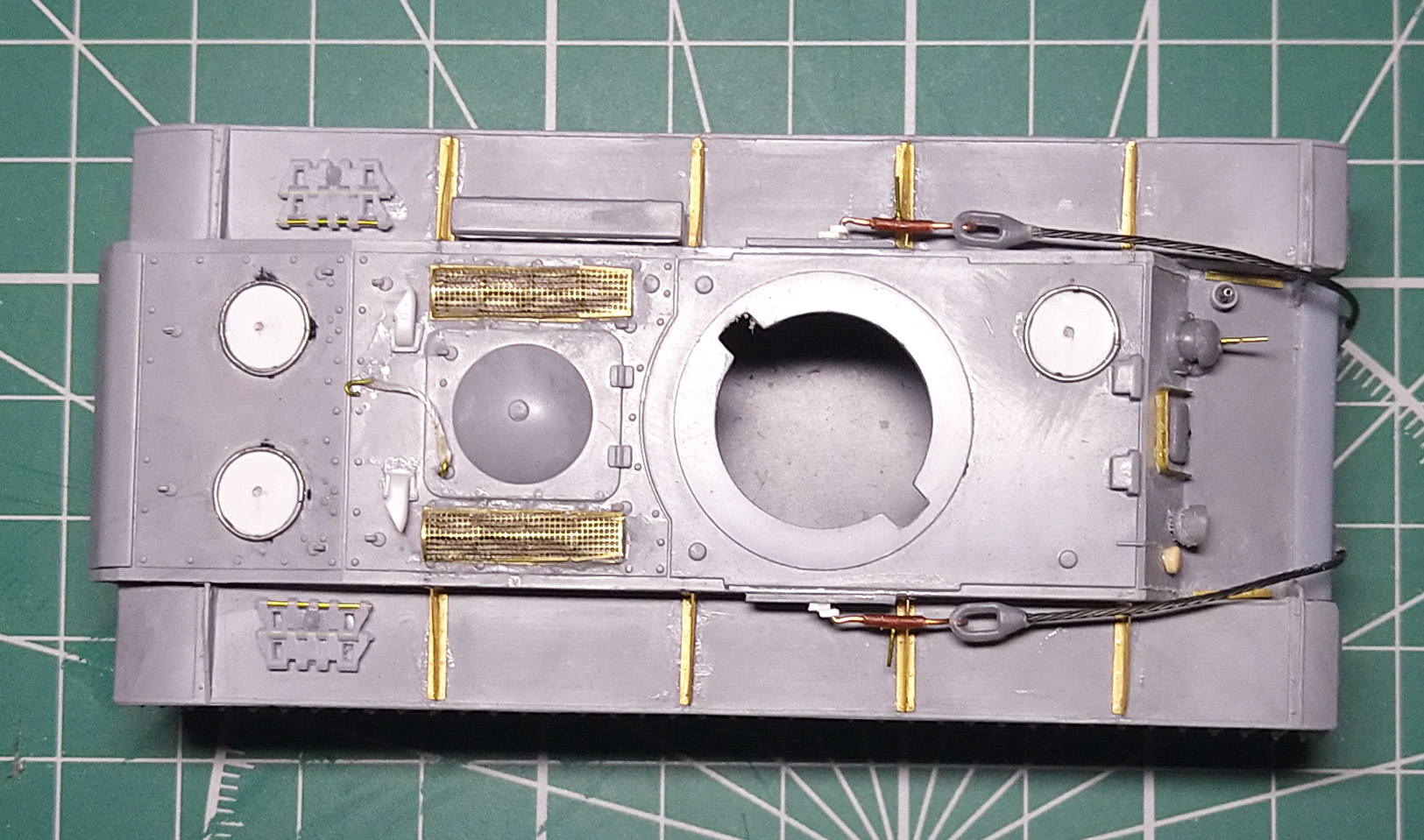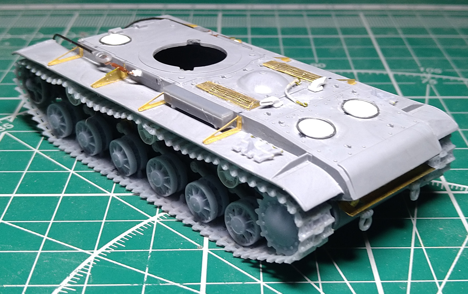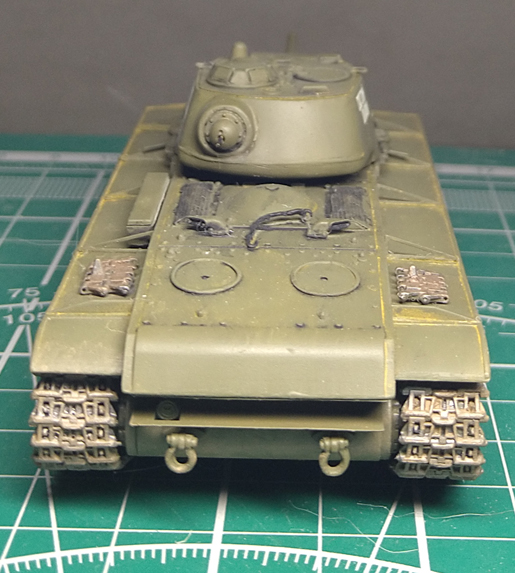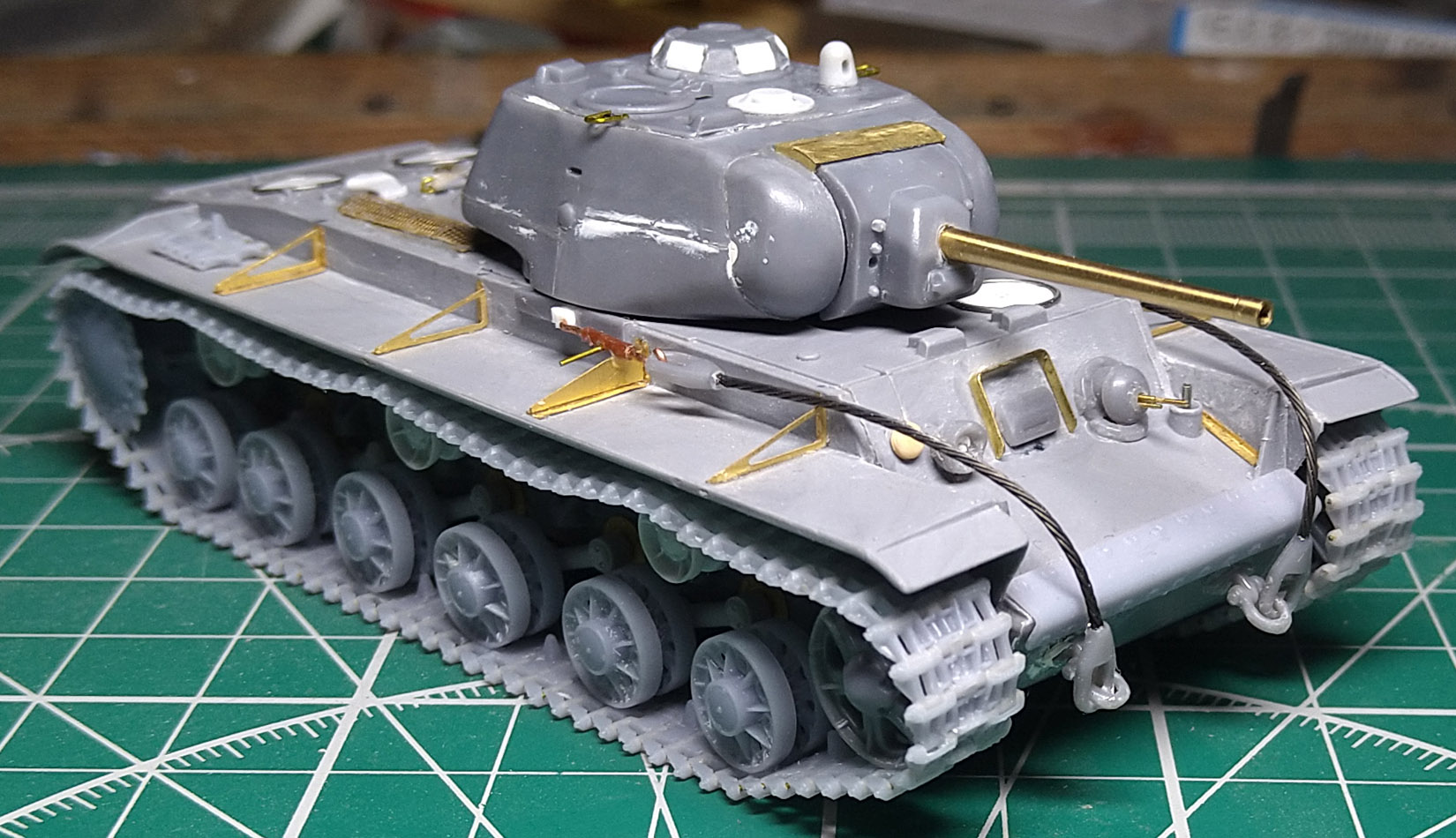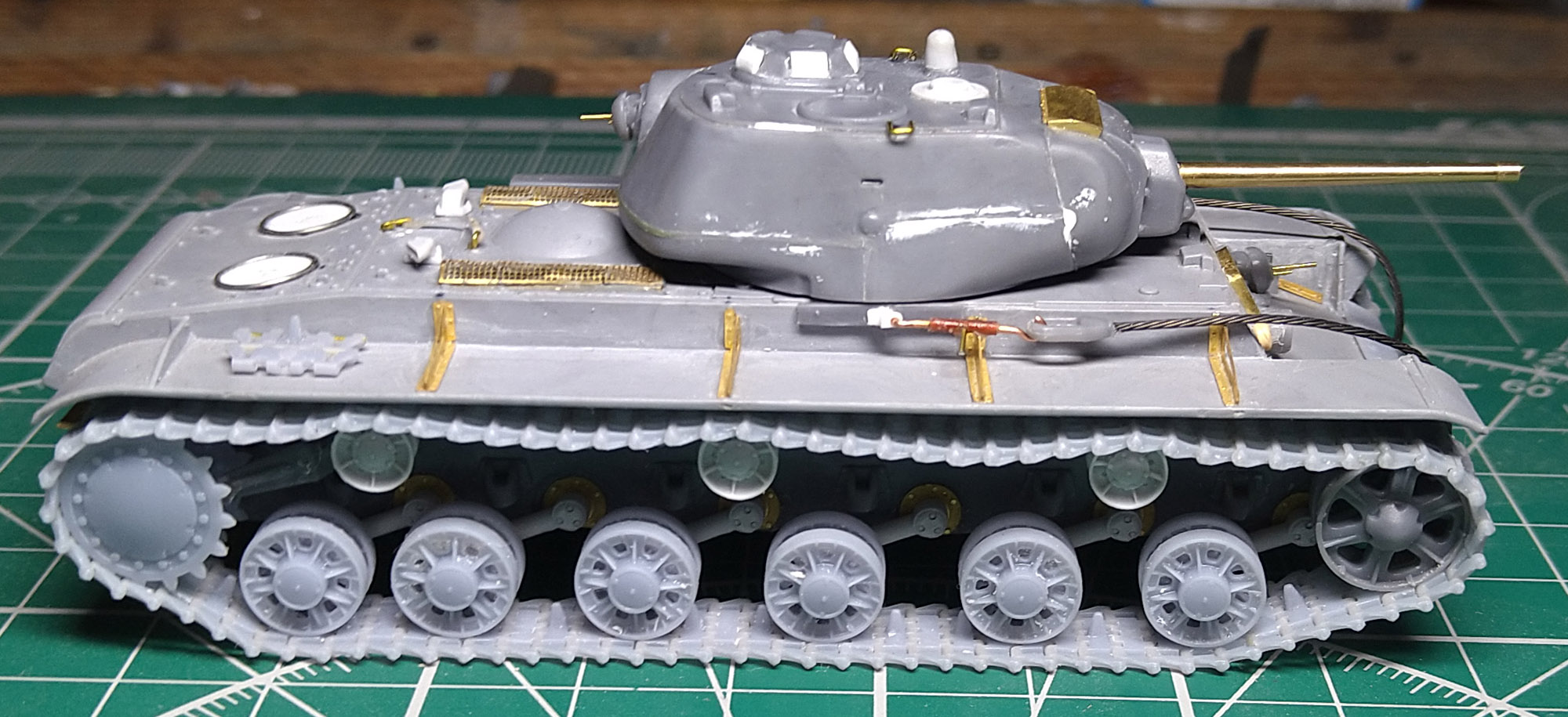 Заменил ресничку на лобовом листе. При внимательном изучении фото пришел к выводу, что ранее сделал ресничку, которая была у поздних серий. У ранних КВ-1с была "п"- образная. Склеил половинки корпуса. Наклеил травленые решетки на надмоторном листе. Результат понравился, буду делать такие же на КВ 1940 и 1942 гг.