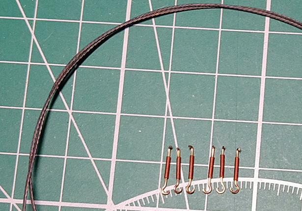 Небольшое продвижение. Изготовил три комплекта кронштейнов для крепления и натяжения буксировочных тросов. В запасах нашел витую струну для рукоделий. После обжига приняла вид нормального троса и стала достаточно мягкой. Тросы буду делать на все три КВ.