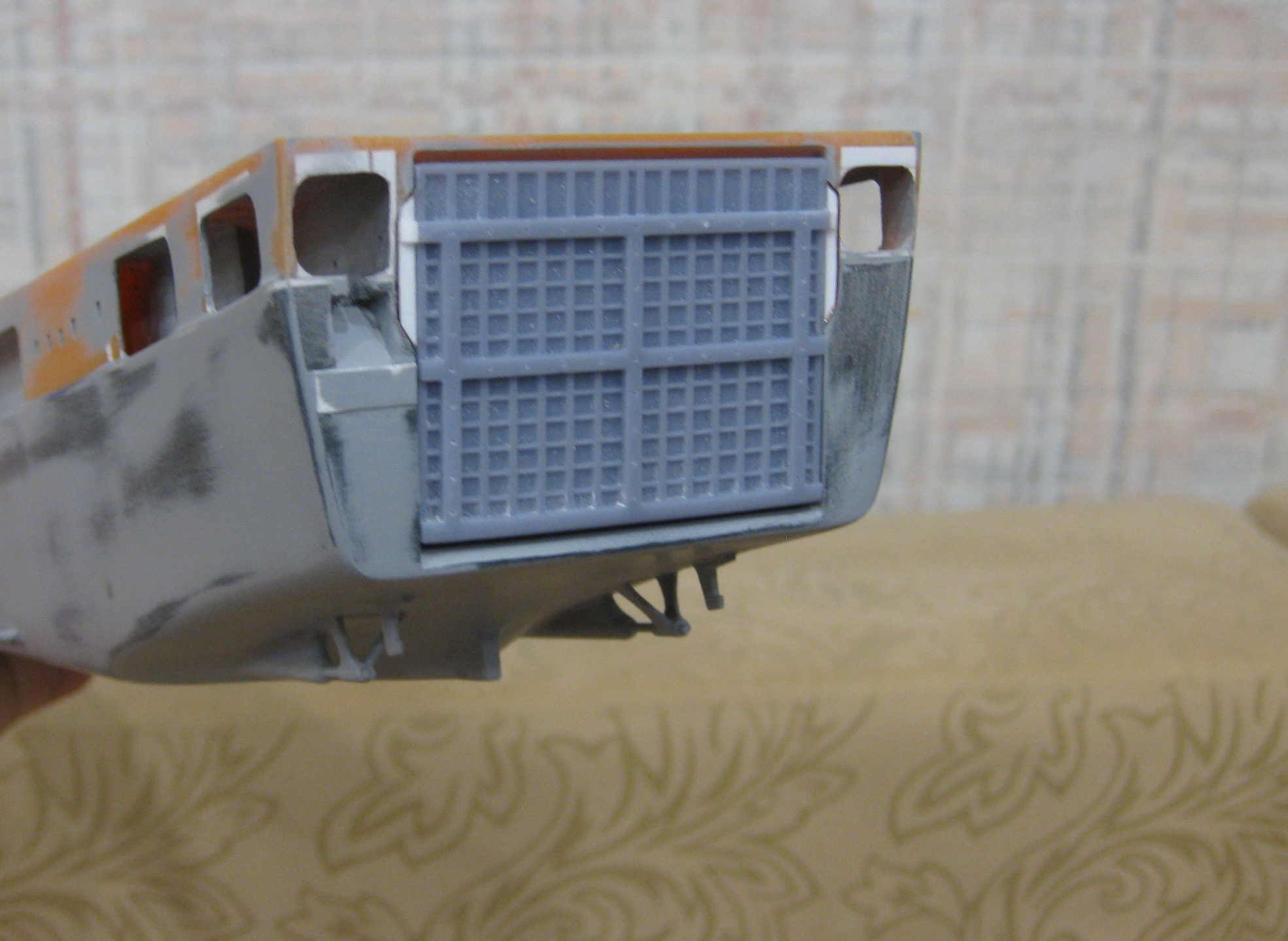 Всем привет! Потихоньку продолжаю. Нижний ярус надстройки поставил на место, откорректировал форму ниш фальшборта, аппарель, место под нее (не приклеивал ее, просто приложил для фото), слегка дунул грунтовкой, шлифанул; начал работать со следующим ярусом - исправил положение иллюминаторов, сточил углы в задней части, приклеил КП вертолетки (ее надо тоже корректировать по форме). Пока всё.