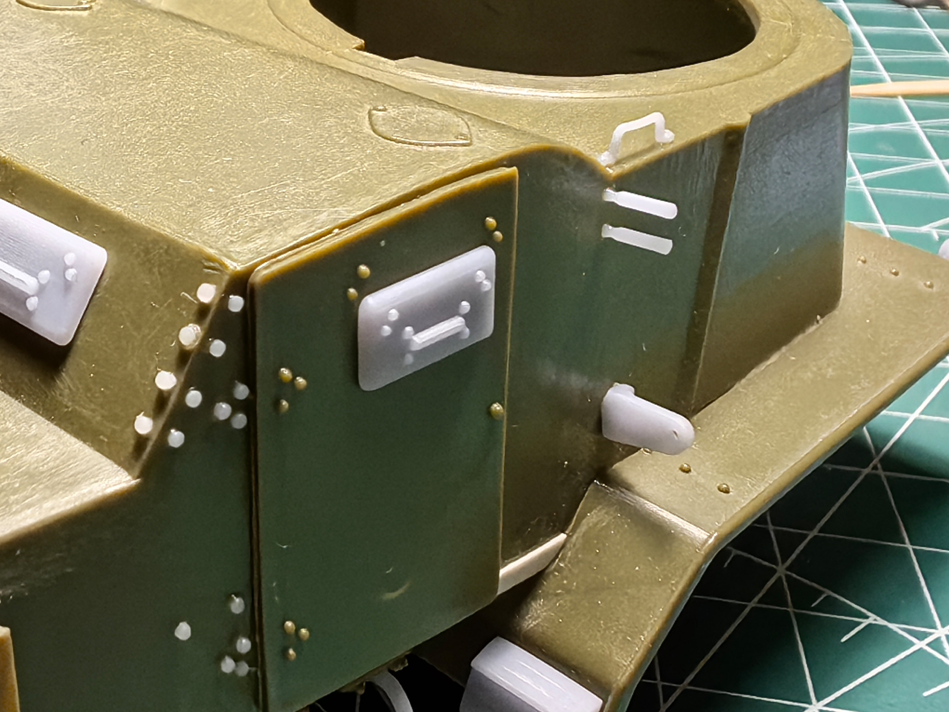 Ну и тестовая сборка перед покраской. Доработки закончены. Итог что переделано: колеса, лючки, передние и задние коуши, пулеметы, ручки, маленькие ящики на крылья, крипления гусениц, задняя фара, частичная клепка. Может что забыл уже).