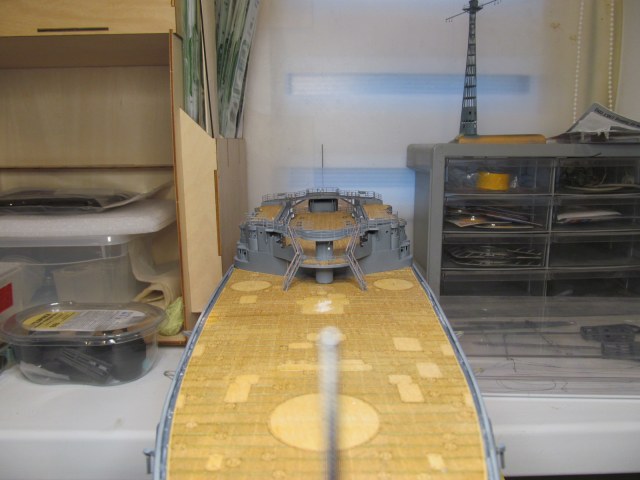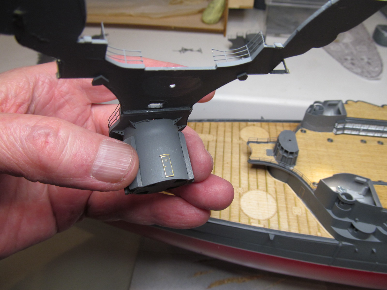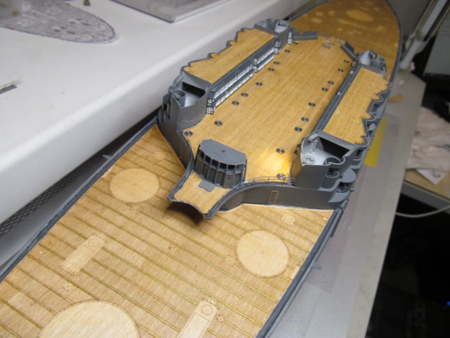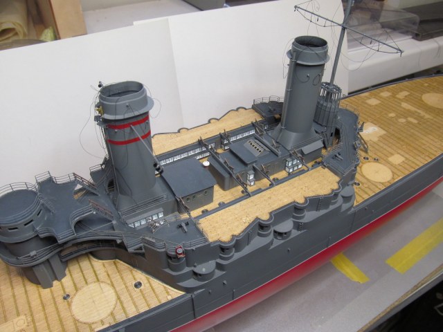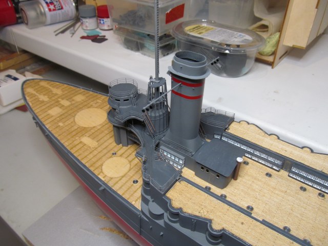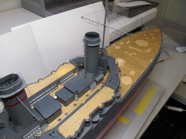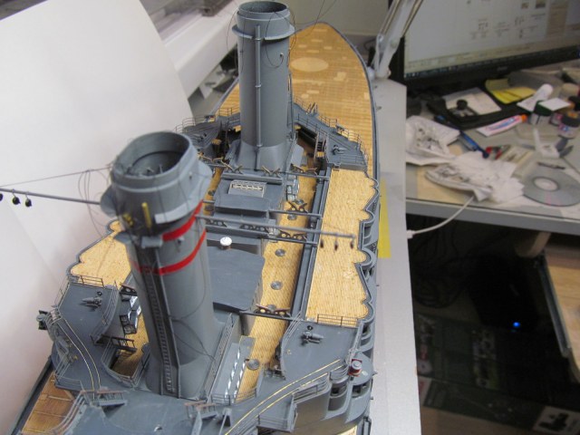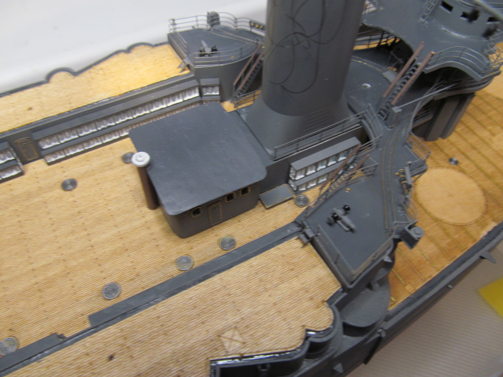 Вот тут я "попал"..... не учёл ранее, что после установки на штатное место второй дымовой трубы, в комплекте с камбузами, основание грот-мачты (расширяющееся к низу) просто не пролезет на своё штатное место.