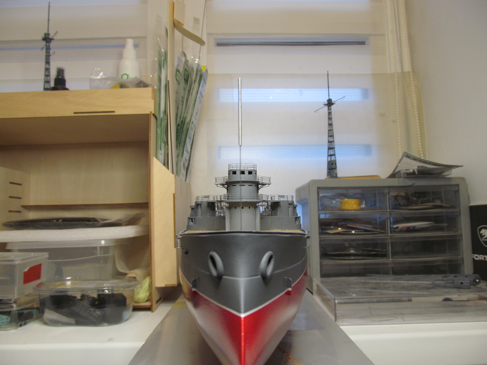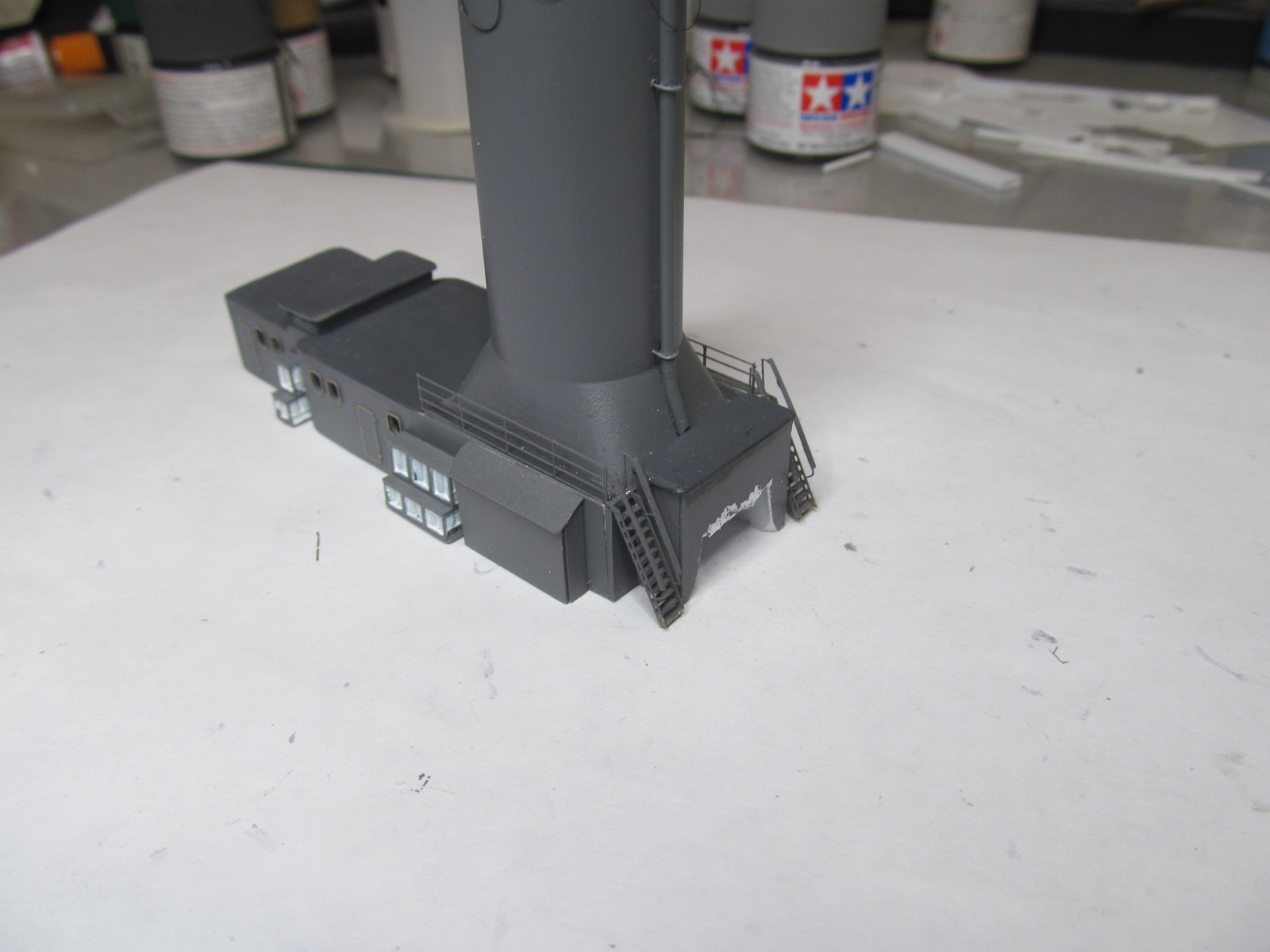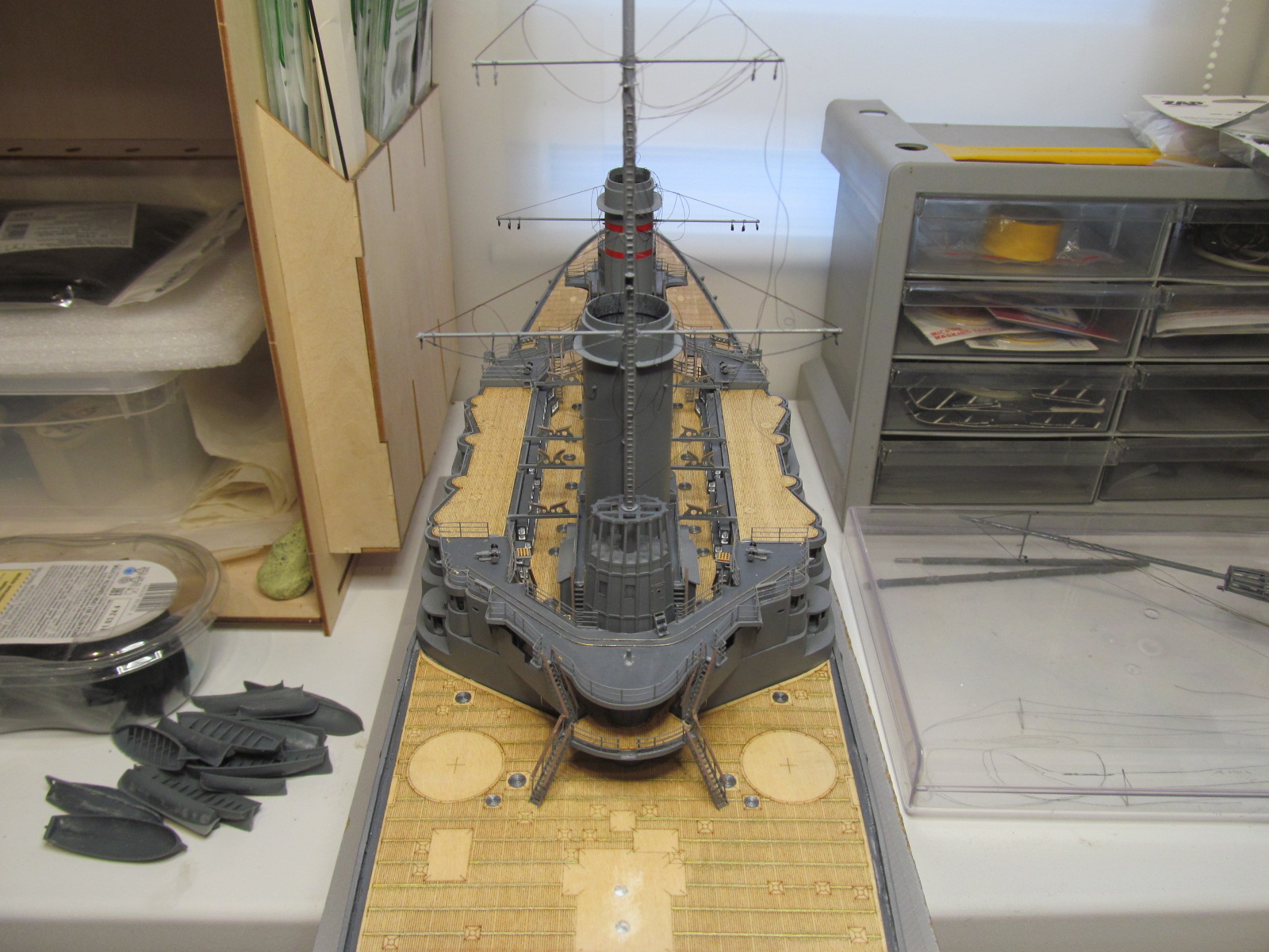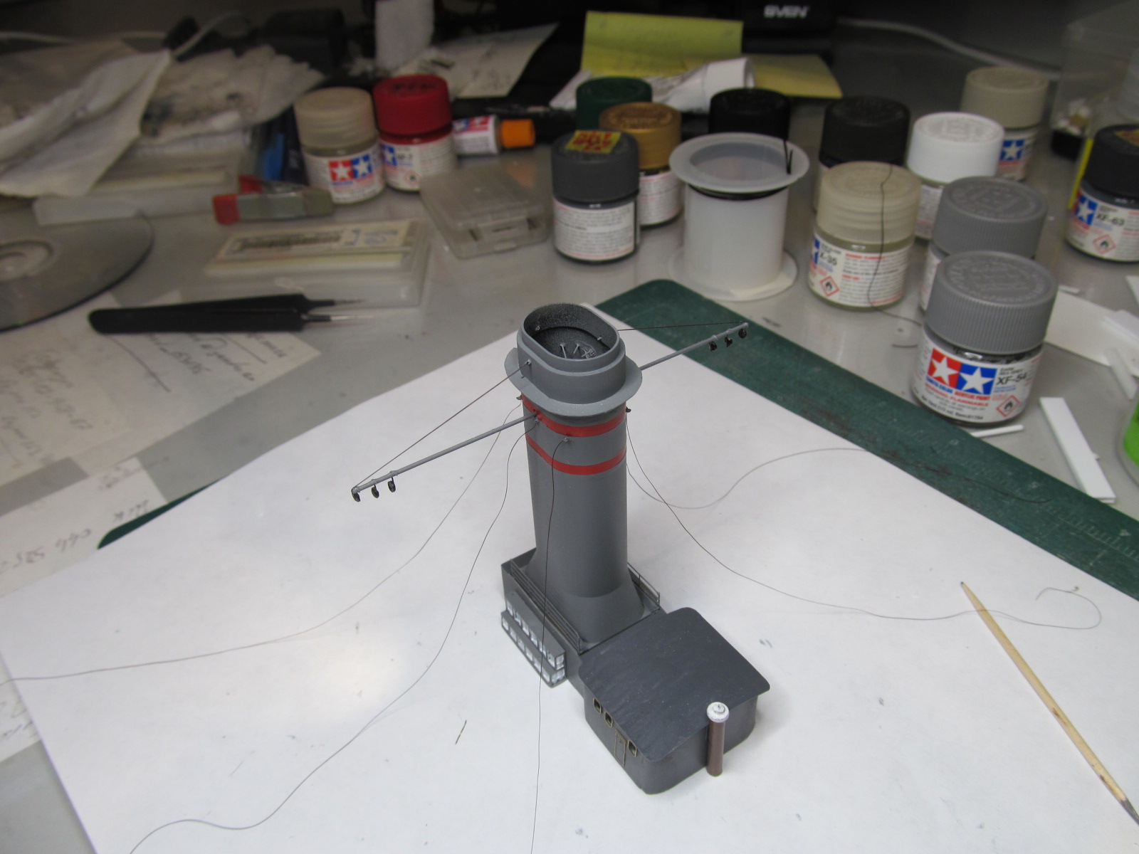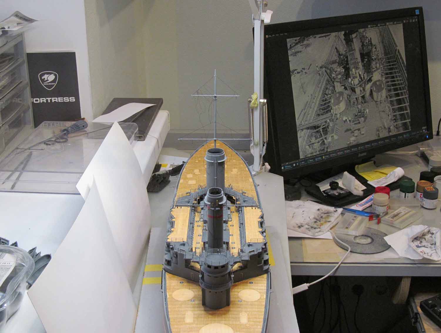 Всё это делал только по фотографиям (к сожалению, не очень качественным), т.к. на имеющихся у меня чертежах навигационные огни вообще в другом месте показаны, а выстрелы как факт на них отсутствуют....