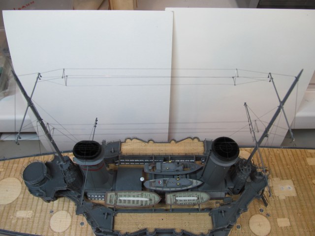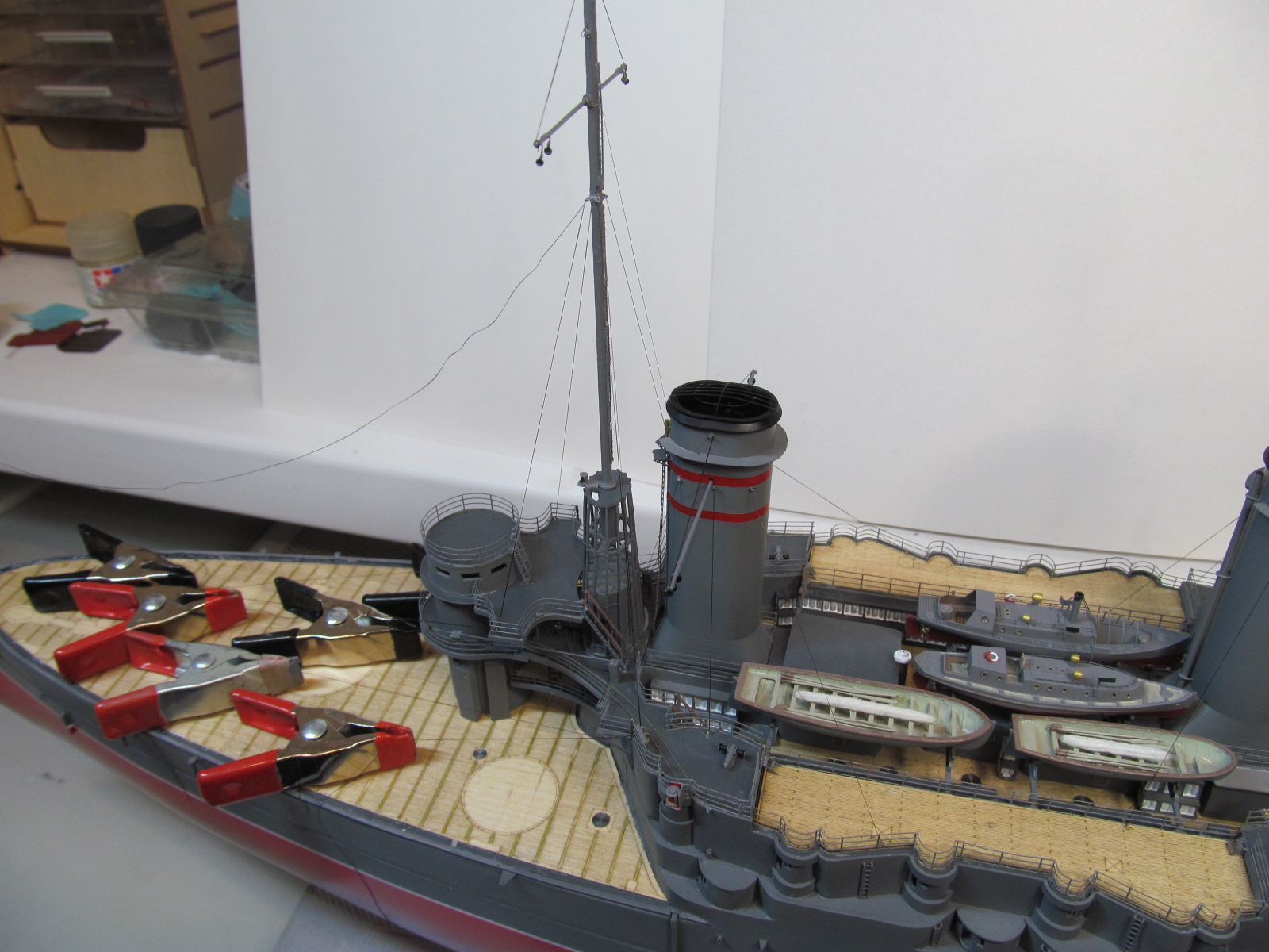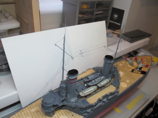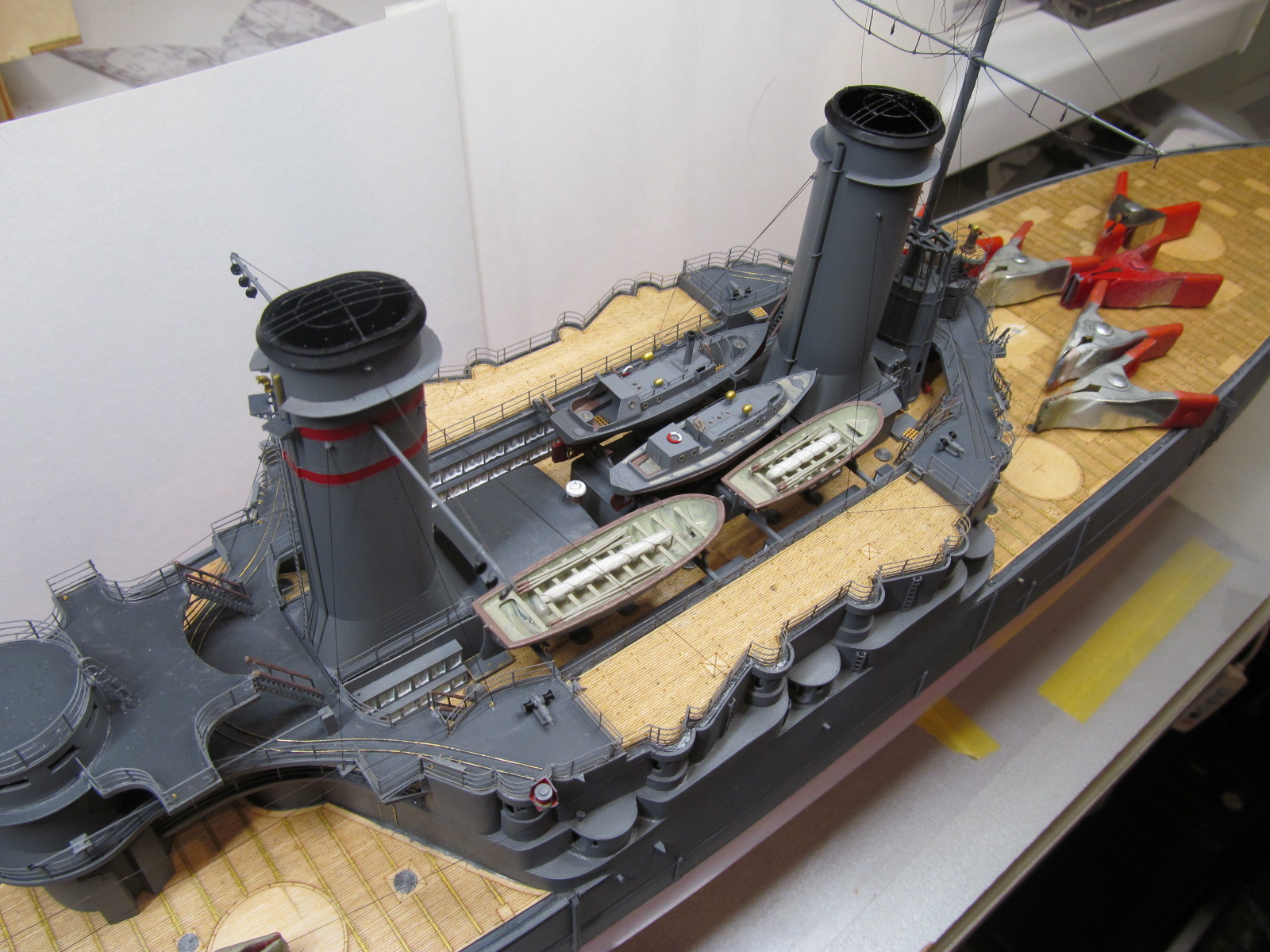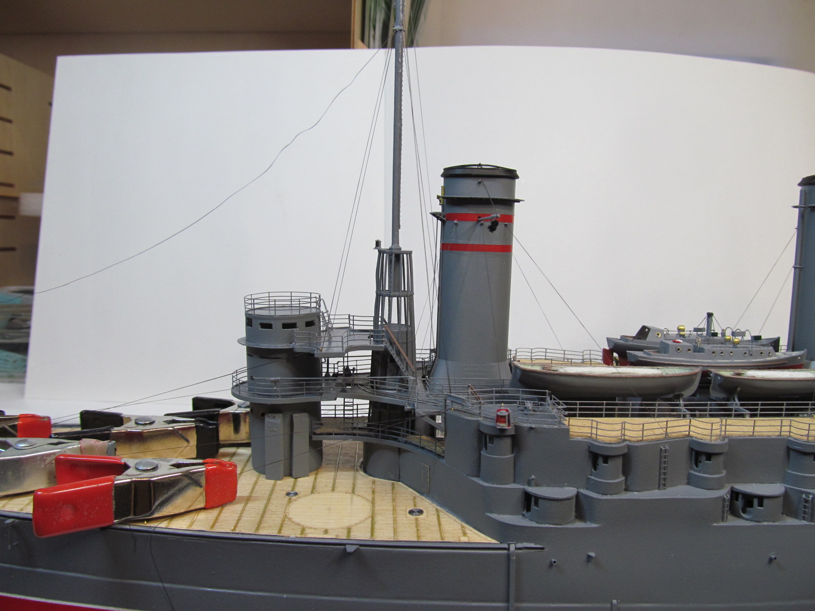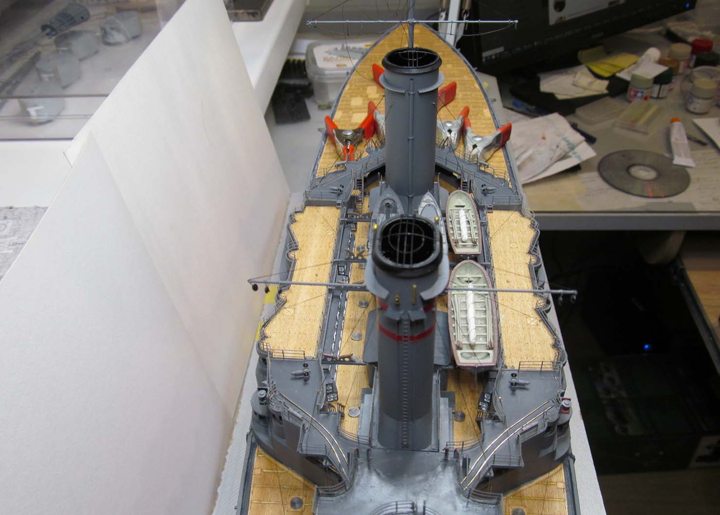 Сейчас заканчиваю шлюпки. Установлю на модель и останутся противоминные сети и якорные цепи.
