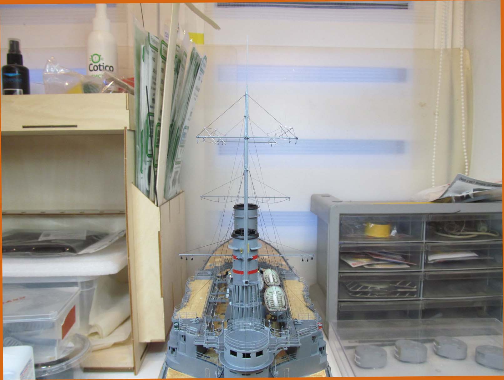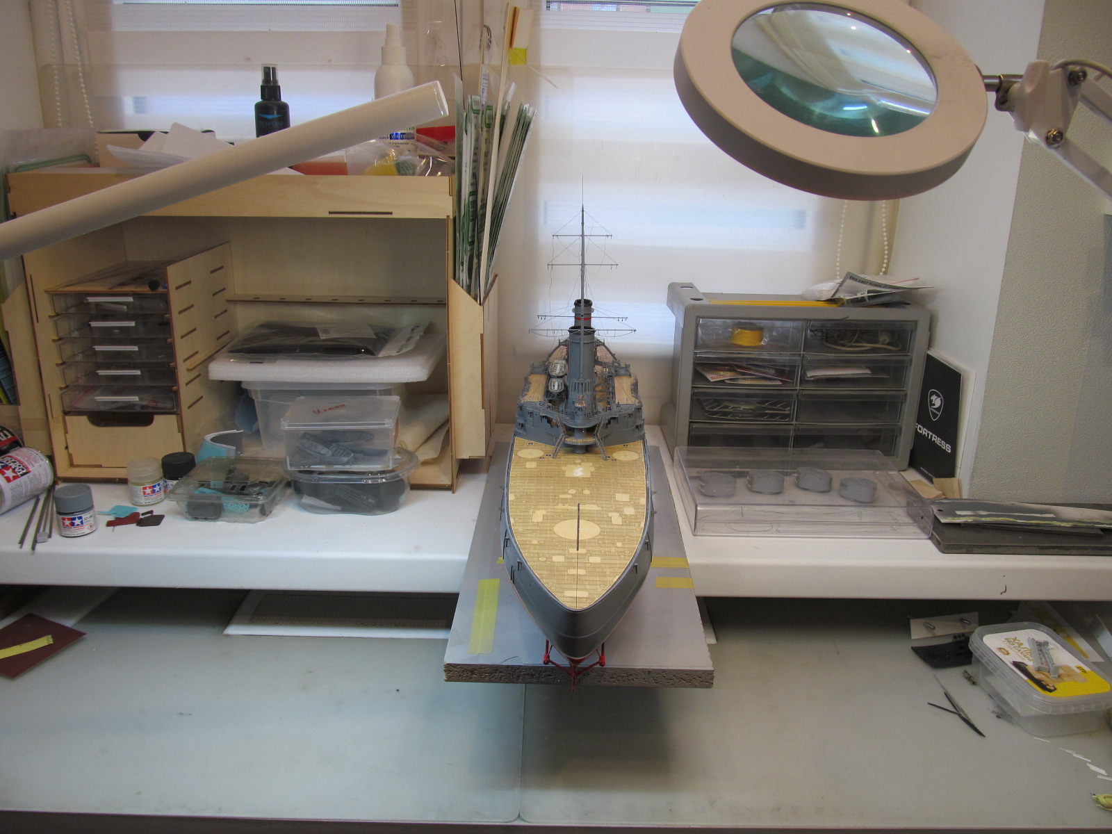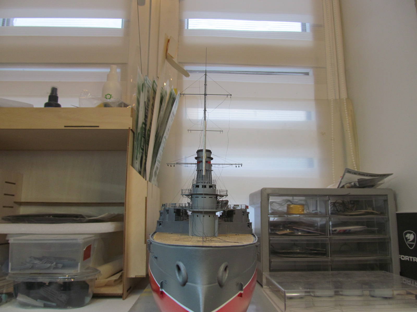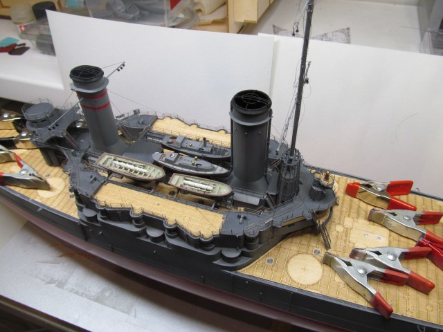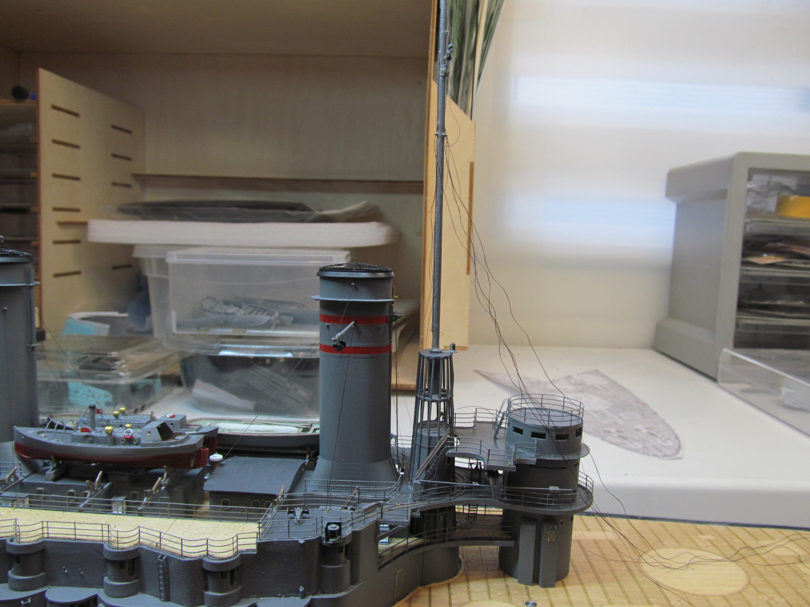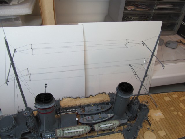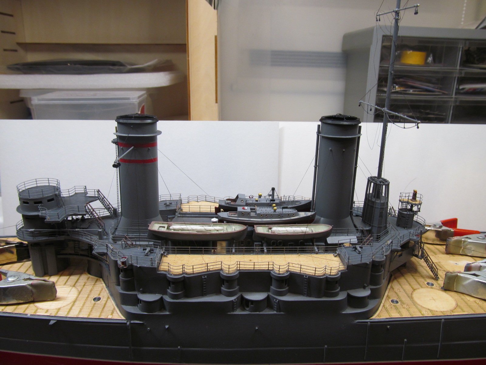 Сейчас заканчиваю шлюпки. Установлю на модель и останутся противоминные сети и якорные цепи.