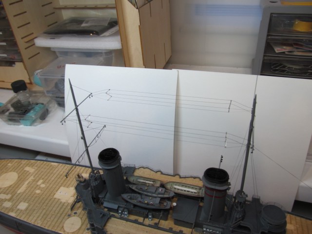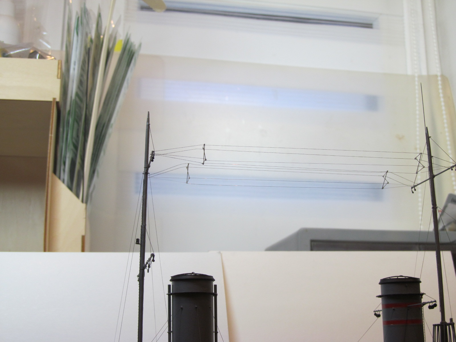 Причиной по которой я решил переделать всё это безобразие явились следующие обстоятельства: я пошёл по ошибочному пути - фиксированными из стальной проволоки сделал только верхние струны, а нижние - из мягкой деформирующейся синтетической нити...... при установке и натяжении на реи это дало эффект "выгиба" антенн вверх (что заметно на фото), а не естественного прогиба антенн под собственным весом.