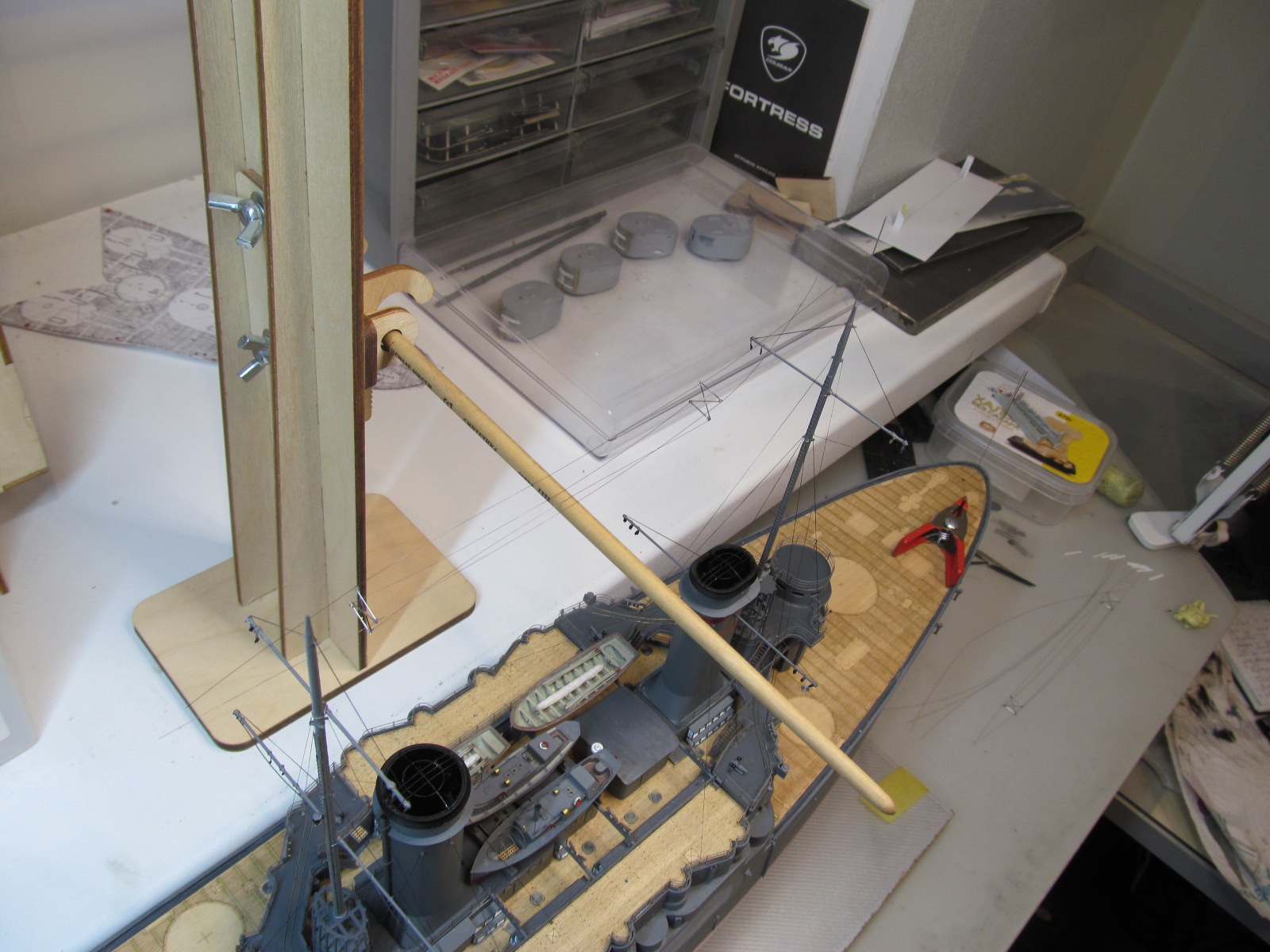 Чтобы натянуть нить получше мне пришлось нижние струны натягивать чуть сильнее, а это привело к этому самому "выгибу" вверх и к тому, что фок-мачту повело (совсем немного, правда) в сторону носа.