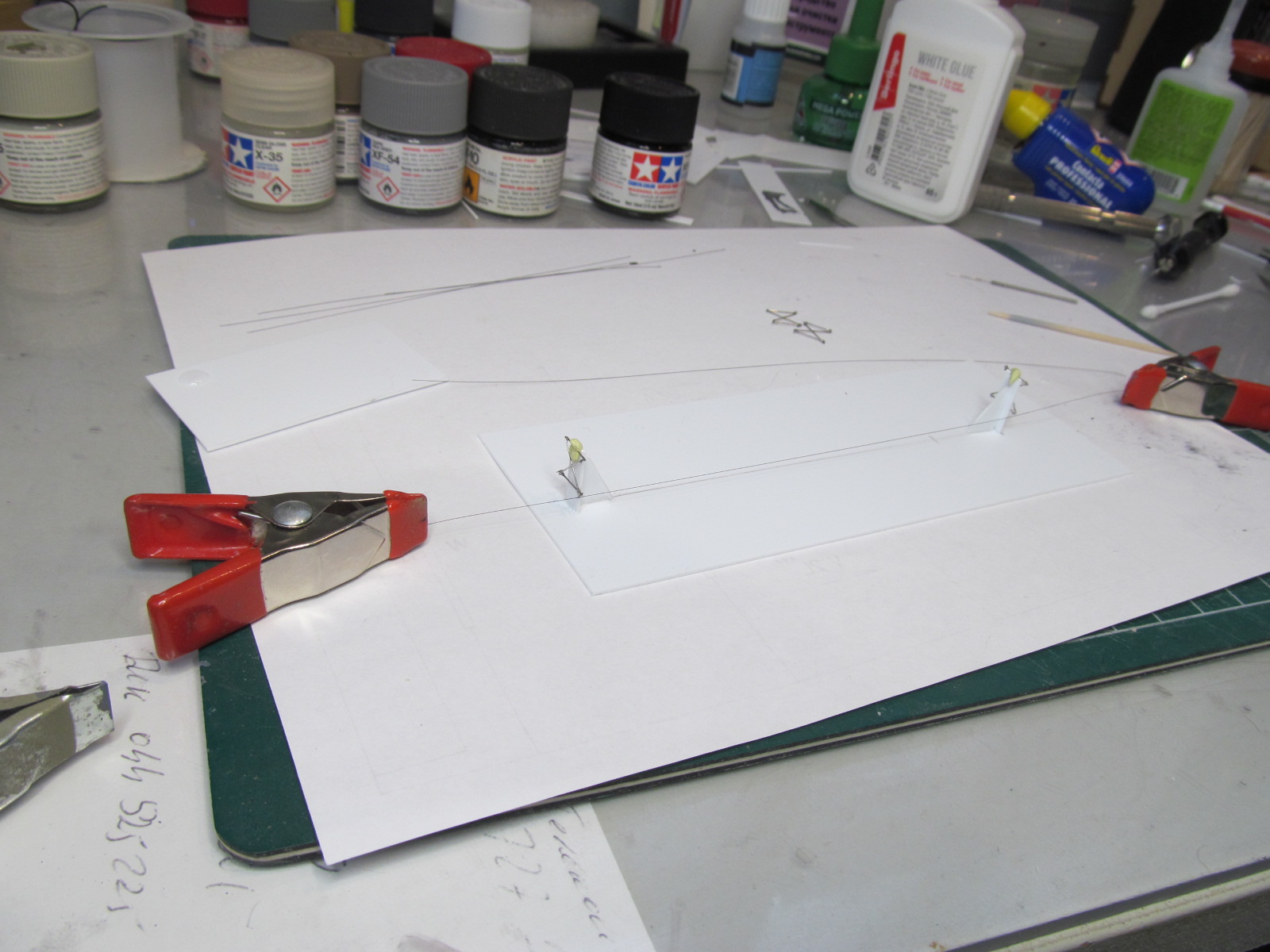 Нет, Адмирал! В кондукторе ты каждую нить насмерть приклеиваешь цианоакрилатом к базе кондуктора. И когда всё собрал - отрезаешь тончайшим лезвием и за хвостики переносишь на мачты.