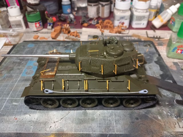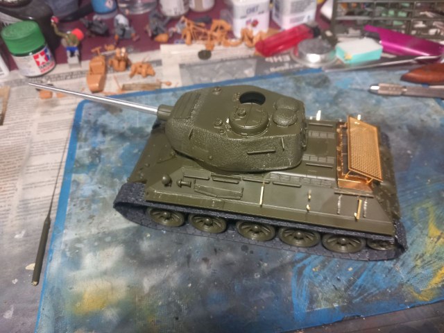 Еще нашел в загашниках металлический 85мм ствол и установил его в башню. Он оказался примерно на миллиметр-полтора короче изкоробочного, но считаю это несущественным.