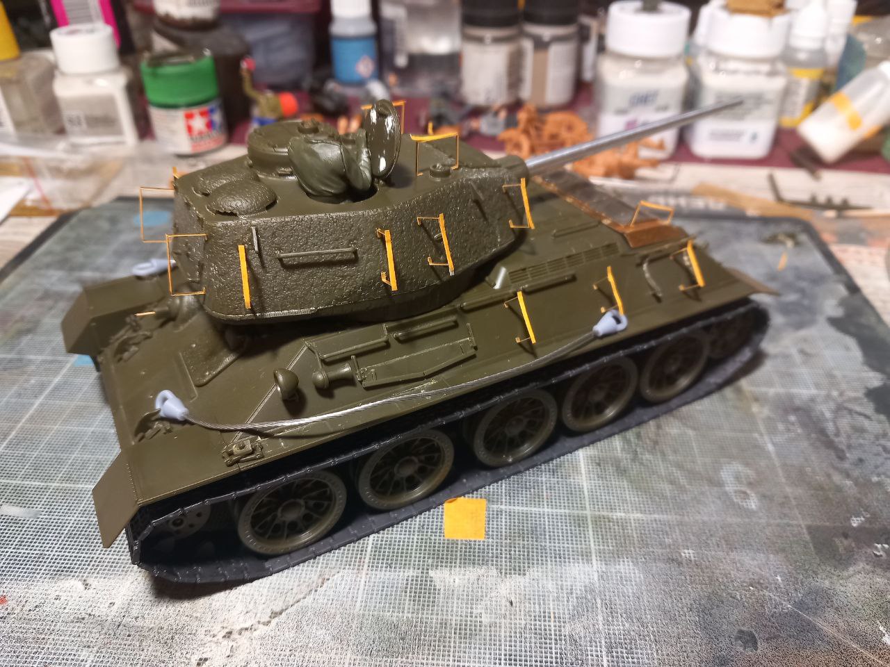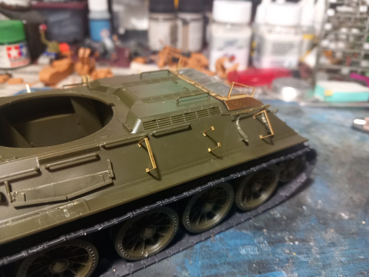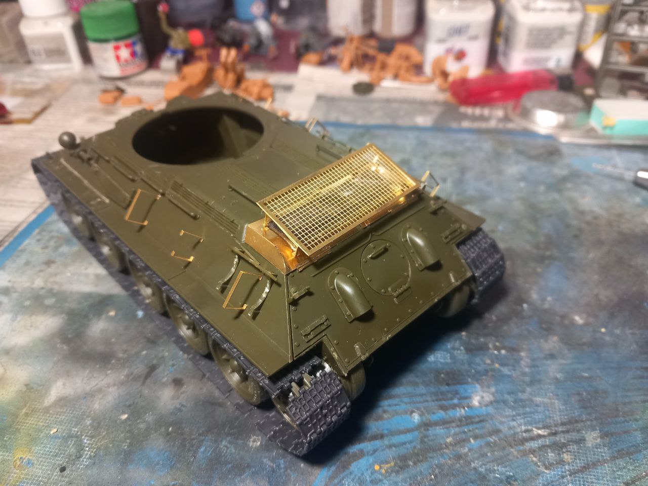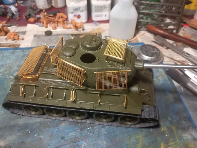 не знаю как там выглядят крепления, но если это тупо штырьки или уголки приваренные к корпусу то думаю надо их установить на танк и покрасить вместе с ними, а потом отдельно окрашенные сетки приклеить сверху. еще рекомендую взять 3д сетки воздухозаборников